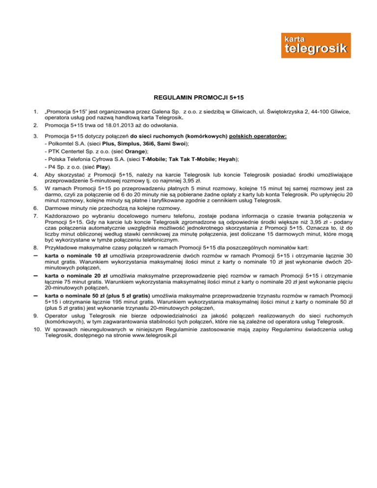 REGULAMIN PROMOCJI 5+15 1. 2. 3. 4. 5. 6. 7. 8. „Promocja 5+15” jest organizowana przez Galena Sp. z o.o. z siedzibą w Gliwicach, ul. Świętokrzyska 2, 44-100 Gliwice, operatora usług pod nazwą handlową karta Telegrosik. Promocja 5+15 trwa od 18.01.2013 aż do odwołania. Promocja 5+15 dotyczy połączeń do sieci ruchomych (komórkowych) polskich operatorów: - Polkomtel S.A. (sieci Plus, Simplus, 36i6, Sami Swoi); - PTK Centertel Sp. z o.o. (sieć Orange); - Polska Telefonia Cyfrowa S.A. (sieci T-Mobile; Tak Tak T-Mobile; Heyah); - P4 Sp. z o.o. (sieć Play). Aby skorzystać z Promocji 5+15, należy na karcie Telegrosik lub koncie Telegrosik posiadać środki umożliwiające przeprowadzenie 5-minutowej rozmowy tj. co najmniej 3,95 zł. W ramach Promocji 5+15 po przeprowadzeniu płatnych 5 minut rozmowy, kolejne 15 minut tej samej rozmowy jest za darmo, czyli za połączenie od 6 do 20 minuty nie są pobierane żadne opłaty z karty lub konta Telegrosik. Po upłynięciu 20 minut rozmowy, kolejne minuty są płatne i taryfikowane zgodnie z cennikiem usług Telegrosik. Darmowe minuty nie przechodzą na kolejne rozmowy. Każdorazowo po wybraniu docelowego numeru telefonu, zostaje podana informacja o czasie trwania połączenia w Promocji 5+15. Gdy na karcie lub koncie Telegrosik zgromadzone są odpowiednie środki większe niż 3,95 zł - podany czas połączenia automatycznie uwzględnia możliwość jednokrotnego skorzystania z Promocji 5+15. Oznacza to, iż do liczby minut obliczonej według stawki cennikowej za minutę połączenia, jest doliczane 15 darmowych minut, które mogą być wykorzystane w tymże połączeniu telefonicznym. Przykładowe maksymalne czasy połączeń w ramach Promocji 5+15 dla poszczególnych nominałów kart: − karta o nominale 10 zł umożliwia przeprowadzenie dwóch rozmów w ramach Promocji 5+15 i otrzymanie łącznie 30 minut gratis. Warunkiem wykorzystania maksymalnej ilości minut z karty o nominale 10 zł jest wykonanie dwóch 20minutowych połączeń, − karta o nominale 20 zł umożliwia maksymalne przeprowadzenie pięć rozmów w ramach Promocji 5+15 i otrzymanie łącznie 75 minut gratis. Warunkiem wykorzystania maksymalnej ilości minut z karty o nominale 20 zł jest wykonanie pięciu 20-minutowych połączeń, − karta o nominale 50 zł (plus 5 zł gratis) umożliwia maksymalne przeprowadzenie trzynastu rozmów w ramach Promocji 5+15 i otrzymanie łącznie 195 minut gratis. Warunkiem wykorzystania maksymalnej ilości minut z karty o nominale 50 zł (plus 5 zł gratis) jest wykonanie trzynastu 20-minutowych połączeń, 9. Operator usług Telegrosik nie bierze odpowiedzialności za jakość połączeń realizowanych do sieci ruchomych (komórkowych), w tym zagwarantowania stabilności tych połączeń, które nie są zależne od operatora usług Telegrosik. 10. W sprawach nieuregulowanych w niniejszym Regulaminie zastosowanie mają zapisy Regulaminu świadczenia usług Telegrosik, dostępnego na stronie www.telegrosik.pl