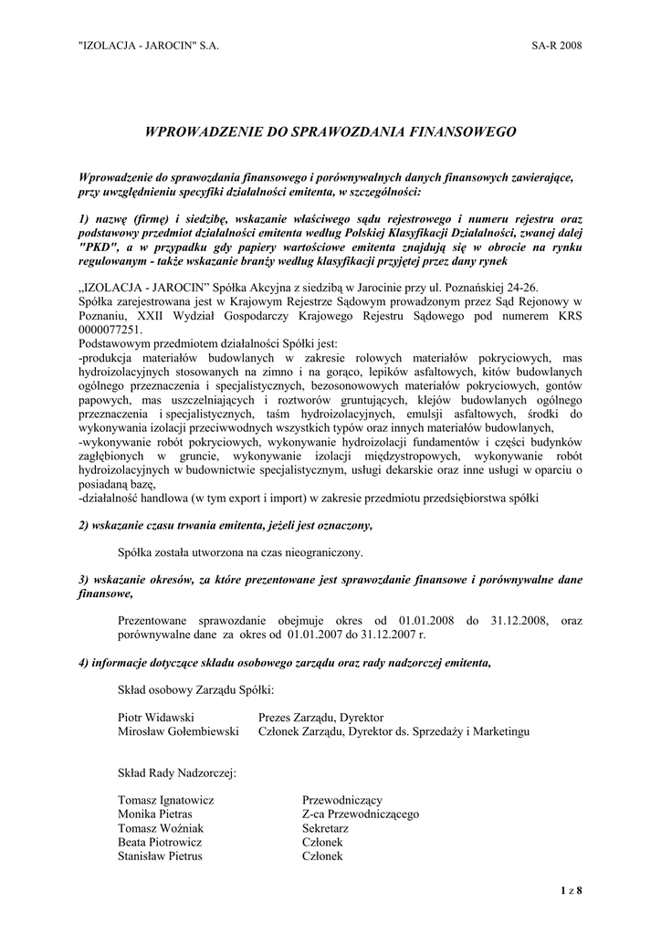 "IZOLACJA - JAROCIN" S.A. SA-R 2008 WPROWADZENIE DO SPRAWOZDANIA FINANSOWEGO Wprowadzenie do sprawozdania finansowego i porównywalnych danych finansowych zawierające, przy uwzględnieniu specyfiki działalności emitenta, w szczególności: 1) nazwę (firmę) i siedzibę, wskazanie właściwego sądu rejestrowego i numeru rejestru oraz podstawowy przedmiot działalności emitenta według Polskiej Klasyfikacji Działalności, zwanej dalej "PKD", a w przypadku gdy papiery wartościowe emitenta znajdują się w obrocie na rynku regulowanym - takŜe wskazanie branŜy według klasyfikacji przyjętej przez dany rynek „IZOLACJA - JAROCIN” Spółka Akcyjna z siedzibą w Jarocinie przy ul. Poznańskiej 24-26. Spółka zarejestrowana jest w Krajowym Rejestrze Sądowym prowadzonym przez Sąd Rejonowy w Poznaniu, XXII Wydział Gospodarczy Krajowego Rejestru Sądowego pod numerem KRS 0000077251. Podstawowym przedmiotem działalności Spółki jest: -produkcja materiałów budowlanych w zakresie rolowych materiałów pokryciowych, mas hydroizolacyjnych stosowanych na zimno i na gorąco, lepików asfaltowych, kitów budowlanych ogólnego przeznaczenia i specjalistycznych, bezosonowowych materiałów pokryciowych, gontów papowych, mas uszczelniających i roztworów gruntujących, klejów budowlanych ogólnego przeznaczenia i specjalistycznych, taśm hydroizolacyjnych, emulsji asfaltowych, środki do wykonywania izolacji przeciwwodnych wszystkich typów oraz innych materiałów budowlanych, -wykonywanie robót pokryciowych, wykonywanie hydroizolacji fundamentów i części budynków zagłębionych w gruncie, wykonywanie izolacji międzystropowych, wykonywanie robót hydroizolacyjnych w budownictwie specjalistycznym, usługi dekarskie oraz inne usługi w oparciu o posiadaną bazę, -działalność handlowa (w tym export i import) w zakresie przedmiotu przedsiębiorstwa spółki 2) wskazanie czasu trwania emitenta, jeŜeli jest oznaczony, Spółka została utworzona na czas nieograniczony. 3) wskazanie okresów, za które prezentowane jest sprawozdanie finansowe i porównywalne dane finansowe, Prezentowane sprawozdanie obejmuje okres od 01.01.2008 porównywalne dane za okres od 01.01.2007 do 31.12.2007 r. do 31.12.2008, oraz 4) informacje dotyczące składu osobowego zarządu oraz rady nadzorczej emitenta, Skład osobowy Zarządu Spółki: Piotr Widawski Mirosław Gołembiewski Prezes Zarządu, Dyrektor Członek Zarządu, Dyrektor ds. SprzedaŜy i Marketingu Skład Rady Nadzorczej: Tomasz Ignatowicz Monika Pietras Tomasz Woźniak Beata Piotrowicz Stanisław Pietrus Przewodniczący Z-ca Przewodniczącego Sekretarz Członek Członek 1z8 "IZOLACJA - JAROCIN" S.A. SA-R 2008 5) wskazanie, czy sprawozdanie finansowe i porównywalne dane finansowe zawierają dane łączne jeŜeli w skład przedsiębiorstwa emitenta wchodzą wewnętrzne jednostki organizacyjne sporządzające samodzielne sprawozdania finansowe, Sprawozdanie i porównywalne dane finansowe nie zawierają danych łącznych. W skład Spółki nie wchodzą wewnętrzne jednostki organizacyjne sporządzające samodzielne sprawozdanie finansowe. 6) wskazanie, czy emitent jest jednostką dominującą lub znaczącym inwestorem oraz czy sporządza skonsolidowane sprawozdanie finansowe, Spółka nie jest jednostką dominującą ,ani znaczącym inwestorem: nie sporządza skonsolidowanego sprawozdania finansowego. 7) w przypadku sprawozdania finansowego sporządzonego za okres, w czasie którego nastąpiło połączenie - wskazanie, Ŝe jest to sprawozdanie finansowe sporządzone po połączeniu spółek, oraz wskazanie zastosowanej metody rozliczenia połączenia, W okresie sprawozdawczym nie nastąpiło połączenie Spółki z innymi podmiotami. 8) wskazanie, czy sprawozdanie finansowe zostało sporządzone przy załoŜeniu kontynuowania działalności gospodarczej przez emitenta w dającej się przewidzieć przyszłości oraz czy nie istnieją okoliczności wskazujące na zagroŜenie kontynuowania działalności, Sprawozdanie to zostało sporządzone przy załoŜeniu kontynuacji działalności gospodarczej przez jednostkę, w dającej się przewidzieć przyszłości. Na dzień sporządzenia sprawozdania finansowego nie są znane okoliczności wskazujące na zagroŜenie kontynuowania przez Spółkę działalności. 9) stwierdzenie, Ŝe sprawozdania finansowe podlegały przekształceniu w celu zapewnienia porównywalności danych, a zestawienie i objaśnienie róŜnic, będących wynikiem korekt z tytułu zmian zasad (polityki) rachunkowości lub korekt błędów podstawowych, zostało zamieszczone w dodatkowej nocie objaśniającej, Sprawozdaniu finansowe nie uległy przekształceniom. 10) wskazanie, czy w przedstawionym sprawozdaniu finansowym lub porównywalnych danych finansowych dokonano korekt wynikających z zastrzeŜeń w opiniach podmiotów uprawnionych do badania o sprawozdaniach finansowych za lata, za które sprawozdanie finansowe lub porównywalne dane finansowe zostały zamieszczone w raporcie, W latach poprzednich opinie biegłych rewidentów odnośnie zbadanych sprawozdań finansowych za te lata były bez zastrzeŜeń. 11) opis przyjętych zasad (polityki) rachunkowości, w tym metod wyceny aktywów i pasywów oraz przychodów i kosztów, ustalenia wyniku finansowego oraz sposobu sporządzenia sprawozdania finansowego i danych porównywalnych, Sprawozdanie finansowe sporządzone zostało na podstawie ksiąg rachunkowych, prowadzonych w roku obrotowym zgodnie z dokumentacją przyjętych zasad (polityka) rachunkowości, ustawą o rachunkowości, zakładowym planem kont. Zastosowane zasady i metody rachunkowości. WPROWADZENIE DO SPRAWOZDANIA FINANSOWEGO 2z8 "IZOLACJA - JAROCIN" S.A. SA-R 2008 Przyjęte przez Spółkę zasady rachunkowości stosowane były w sposób ciągły. W stosunku do lat poprzednich, w 2005 roku wprowadzono zmianę wyceny wyrobów gotowych. W trakcie roku wyceny dokonuje się wg cen planowanych, natomiast na koniec ro