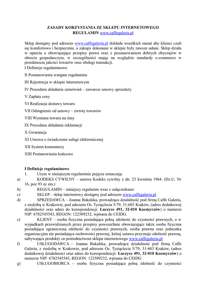 ZASADY KORZYSTANIA ZE SKLEPU INTERNETOWEGO REGULAMIN www.caffegaleria.pl Sklep dostępny pod adresem www.caffegaleria.pl dokłada wszelkich starań aby klienci czuli się komfortowo i bezpiecznie, a zakupy dokonane w sklepie były zawsze udane. Sklep działa w oparciu o obowiązujące przepisy prawa oraz z poszanowaniem dobrych obyczajów w obrocie gospodarczym, w szczególności mając na względzie standardy e-commerce w przedmiocie jakości towarów oraz obsługi transakcji. I Definicje regulaminowe II Postanowienia wstępne regulaminu III Rejestracja w sklepie internetowym IV Procedura składania zamówień – zawarcie umowy sprzedaży V Zapłata ceny VI Realizacja dostawy towaru VII Odstąpienie od umowy – zwroty towarów VIII Wymiana towaru na inny IX Procedura składania reklamacji X Gwarancja XI Umowa o świadczenie usługi elektronicznej XII System komentarzy XIII Postanowienia końcowe I Definicje regulaminowe 1. Użyte w niniejszym regulaminie pojęcia oznaczają: a) KODEKS CYWILNY – ustawa Kodeks cywilny z dn. 23 kwietnia 1964. (Dz.U. Nr 16, poz 93 ze zm.) b) REGULAMIN – niniejszy regulamin wraz z załącznikami c) SKLEP – sklep internetowy dostępny pod adresem www.caffegaleria.pl d) SPRZEDAWCA – Joanna Bukalska, prowadząca działalność pod firmą Caffe Galeria, z siedzibą w Krakowie, pod adresem Os. Tysiąclecia 5/79, 31-603 Kraków, (adres dodatkowej działalności oraz adres do korespondencji: Łuczyce 491, 32-010 Kocmyrzów) o numerze NIP: 6782545543, REGON: 122509232, wpisana do CEIDG. e) KLIENT – osoba fizyczna posiadająca pełną zdolność do czynności prawnych, a w wypadkach przewidzianych przez przepisy powszechnie obowiązujące także osoba fizyczna posiadająca ograniczoną zdolność do czynności prawnych, osoba prawna oraz jednostka organizacyjna nie posiadająca osobowości prawnej, której ustawa przyznaje zdolność prawną, nabywająca produkty za pośrednictwem sklepu internetowego www.caffegaleria.pl f) USŁUGODAWCA – Joanna Bukalska, prowadząca działalność pod firmą Caffe Galeria, z siedzibą w Krakowie, pod adresem Os. Tysiąclecia 5/79, 31-603 Kraków, (adres dodatkowej działalności oraz adres do korespondencji: Łuczyce 491, 32-010 Kocmyrzów) o numerze NIP: 6782545543, REGON: 122509232, wpisana do CEIDG g) USŁUGOBIORCA – osoba fizyczna posiadająca pełną zdolność do czynności h) i) j) k) l) m) n) o) p) prawnych, a w wypadkach przewidzianych przez przepisy powszechnie obowiązujące także osoba fizyczna posiadająca ograniczoną zdolność do czynności prawnych, osoba prawna oraz jednostka organizacyjna nie posiadająca osobowości prawnej, której ustawa przyznaje zdolność prawną, zawierająca umowę o świadczenie usług drogą elektroniczną za pośrednictwem sklepu internetowego www.caffegaleria.pl STRONY – obie strony umowy tj. sprzedawca i klient ZAMÓWIENIE – oświadczenie woli klienta zmierzające bezpośrednio do zawarcia umowy sprzedaży towaru i określające istotne jej warunki UŻYTKOWNIK – każdy podmiot korzystający ze sklepu internetowego KONTO – indywidualny panel administracyjny użytkownika dostępny po dokonaniu rejestracji i zalogowaniu w sklepie internetowym www.caffegaleria.pl, oznaczony loginem i hasłem, służący zawieraniu umów sprzedaży REJESTRACJA – jednorazowa czynność, polegająca na utworzeniu przez klienta konta, dokonana za pomocą formularza rejestracyjnego dostępnego na stronie internetowej sklepu UMOWA SPRZEDAŻY - umowa sprzedaży towaru zawarta pomiędzy sprzedawcą a klientem za pośrednictwem sklepu internetowego USŁUGA ELEKTRONICZNA – usługa świadczona drogą elektroniczną przez usługodawcę na rzecz usługobiorcy za pośrednictwem sklepu internetowego TOWAR – każdy przedmiot sprzedawany za pośrednictwem sklepu internetowego KONSUMENT – osoba fizyczna nabywająca produkty za pośrednictwem sklepu internetowego www.caffegaleria.pl w celu niezwiązanym bezpośrednio z jej działalnością gospodarczą lub zawodową II Postanowienia wstępne regulaminu 1. Niniejszy regulamin, jest regulaminem o którym mowa w art. 8 ustawy z dnia 18 lipca 2002 r. o świadczeniu usług drogą elektroniczną (Dz. U. z 2002 r. Nr 144, poz. 1204 ze zm.), a także reguluje warunki zawierania umów sprzedaży w sklepie internetowym, zgodnie z treścią innych ustaw, regulujących ten obowiązek. 2. Regulamin określa w szczególności zasady korzystania przez użytkowników ze sklepu internetowego www.caffegaleria.pl sposób składania zamówień oraz ich realizacji, a także tryb postępowania reklamacyjnego. 3. Regulamin znajdujący się na stronie internetowej www.caffegaleria.pl, wszelkie materiały się w nim znajdujące, nazwa sklepu oraz inne loga i znaki sklepu stanowią własność prawa autorskiego i stanowią przedmiot ochrony prawnej. Wszelkie próby wykorzystywania, powielania, przetwarzania materiałów znajdujących się na stronie www.caffegaleria.pl bez zgody właściciela są zabronione. 4. Właścicielem oraz administratorem sklepu internetowego dostępnego pod adresem www.caffegaleria.pl jest Joanna Bukalska, prowadząca działalność pod firmą Caffe Galeria, z siedzibą w Krakowie, pod adresem Os. Tysiąclecia 5/79, 31-603 Kraków, (adres dodatkowej działalności oraz adres do korespondencji: Łuczyce 491, 32-010 Kocmyrzów) o numerze NIP: 6782545543, REGON: 122509232, wpisana do CEIDG. 5. Przedmiotem działalności sklepu internetowego www.caffegaleria.pl jest sprzedaż detaliczna i hurtowa kawy, herbaty, czekolad, syropów, filiżanek i pozostałych akcesoriów do kawy i herbaty oraz innych towarów za pośrednictwem sieci Internet. 6. Klient może korzystać ze sklepu za pośrednictwem urządzeń komunikujących się z Internetem (komputer, telefon), z wykorzystaniem przeglądarki internetowej. 7. Umowa sprzedaży pomiędzy sprzedawcą a klientem zawierana jest w języku polskim zgodnie z obowiązującymi przepisami prawa polskiego. 8. W