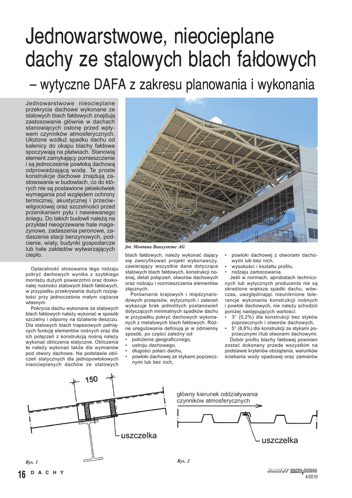 Jednowarstwowe, nieocieplane dachy ze stalowych blach fałdowych – wytyczne DAFA z zakresu planowania i wykonania Jednowarstwowe nieocieplane przekrycia dachowe wykonane ze stalowych blach fałdowych znajdują zastosowanie głównie w dachach stanowiących osłonę przed wpływem czynników atmosferycznych. Ułożone wzdłuż spadku dachu od kalenicy do okapu blachy fałdowe spoczywają na płatwiach. Stanowią element zamykający pomieszczenie i są jednocześnie powłoką dachową odprowadzającą wodę. Te proste konstrukcje dachowe znajdują zastosowanie w budowlach, co do których nie są postawione jakiekolwiek wymagania pod względem ochrony termicznej, akustycznej i przeciwwilgociowej oraz szczelności przed przenikaniem pyłu i nawiewanego śniegu. Do takich budowli należą na przykład nieogrzewane hale magazynowe, zadaszenia peronowe, zadaszenia stacji benzynowych, podcienie, wiaty, budynki gospodarcze lub hale zakładów wytwarzających ciepło. Opłacalność stosowania tego rodzaju pokryć dachowych wynika z szybkiego montażu dużych powierzchni oraz doskonałej nośności stalowych blach fałdowych, w przypadku przekrywania dużych rozpiętości przy jednocześnie małym ciężarze własnym. Pokrycia dachu wykonane ze stalowych blach fałdowych należy wykonać w sposób szczelny i odporny na działanie deszczu. Dla stalowych blach trapezowych pełniących funkcję elementów nośnych oraz dla ich połączeń z konstrukcją nośną należy wykonać obliczenia statyczne. Obliczenia te należy wykonać także dla wymianów pod otwory dachowe. Na podstawie obliczeń statycznych dla jednopowłokowych nieocieplanych dachów ze stalowych Rys. 1 16 D A C H Y fot. Montana Bausysteme AG blach fałdowych, należy wykonać dający się zweryfikować projekt wykonawczy, zawierający wszystkie dane dotyczące stalowych blach fałdowych, konstrukcji nośnej, detali połączeń, otworów dachowych oraz rodzaju i rozmieszczenia elementów złącznych. Porównanie krajowych i międzynarodowych przepisów, wytycznych i zaleceń wykazuje brak jednolitych postanowień dotyczących minimalnych spadków dachu w przypadku pokryć dachowych wykonanych z metalowych blach fałdowych. Różne uregulowania definiują je w odmienny sposób, po części zależny od: • położenia geograficznego, • ustroju dachowego, • długości połaci dachu, • powłoki dachowej ze stykami poprzecznymi lub bez nich, • powłoki dachowej z otworami dachowymi lub bez nich, • wysokości i kształtu profilu, • rodzaju zamocowania. Jeśli w normach, aprobatach technicznych lub wytycznych producenta nie są określone większe spadki dachu, wówczas, uwzględniając nieuniknione tolerancje wykonania konstrukcji nośnych i powłok dachowych, nie należy schodzić poniżej następujących wartości: • 3° (5,2%) dla konstrukcji bez styków poprzecznych i otworów dachowych, • 5° (8,8%) dla konstrukcji ze stykami poprzecznymi i/lub otworami dachowymi. Dobór profilu blachy fałdowej powinien zostać dokonany przede wszystkim na podstawie kryteriów obciążenia, warunków ściekania wody opadowej oraz zamiarów Rys. 2 4/2010 architektonicznych odnośnie kształtu dachu, kolorystki i kształtu profilu. Przydatność wybranej stalowej blachy fałdowej należy potwierdzić obliczeniami statycznymi. W Polsce zgodnie z art. 4 oraz art. 5 ustawy z dnia 16 kwietnia 2004 r. o wyrobach budowlanych (Dz.U. Nr 92/2004 poz. 881), wyroby budowlane mogą być wprowadzone do obrotu i stosowane przy wykonywaniu robót budowlanych w zakresie odpowiadającym ich właściwościom użytkowym i przeznaczeniu, jeżeli są oznakowane znakiem CE lub znakiem budowlanym B. Dobór rodzaju powłok antykorozyjnych na podstawie określenia przewidywanego środowiska korozyjności wewnątrz i na zewnątrz budynku powinien być zawarty w projekcie budowlanym. Dodatkowa ochrona antykorozyjna na powierzchniach cięć nie jest konieczna w przypadku grubości blach do 1,5 mm, jeśli poprzez działania konstrukcyjne lub techniczno-montażowe zagwarantowany zostanie obieg powietrza wokół krawędzi cięć, powodujący ich osuszanie. Długość zakładki w styku poprzecznym powinna wynosić 150 mm przy spadku dachu > 5°. W przypadku spadków dachu mniejszych niż 15° zakładkę w styku poprzecznym należy uszczelnić odpowiednimi uszczelkami, np. uszczelkami o zamkniętych porach, które należy umieścić z przodu i z tyłu zakładki. (patrz rysunek1 ). W przypadku wykonania pokrycia dachu ze stalowych blach fałdowych zakładka styku uszczelniającego, zwanego też wzdłużnym, powinna znajdować się w górnej fałdzie i w miarę możliwości powinna być odwrócona tyłem do głównego kierunku oddziaływania czynników atmosferycznych w tym w szczególności wiatru (patrz rysunek 2). Należy zagwarantować szczelność przed deszczem przy wszystkich kierunkach wiatru. Zakładki styków uszczelniających – wzdłużnych należy łączyć ze sobą w odległościach nie większych niż 666 mm. W przypadku spadku dachu < 7° zaleca się stosowanie ciągłej, niewchłaniającej wody uszczelki i małych odległości między elementami złącznymi. Odwadnianie dachów należy zaprojektować i starannie wykonać w oparciu o stosowne normy. Połączenie stalowych blach fałdowych z konstrukcją nośną należy wykonać stosownie do obliczeń statycznych, przy pomocy samogwintujących lub samowiercących łączników z podkładkami uszczelniającymi. Połączenia zakładek na stykach wzdłużnych i połączenia z innymi cienkościennymi elementami konstrukcyjnymi należy wykonać przy pomocy łączników samogwintujących, samowiercących (z niegwintowanym trzonem pod łbem łącznika) lub jednostronnych nitów szczelnych. Połączenie z konstrukcją nośną może zostać wykonane na dwa sposoby: • połączenie w górnych półkach – taki rodzaj zamocowania zaleca się w przypadku, gdy konstrukcja nośna wykonana jest z drewna. Mocowanie odb