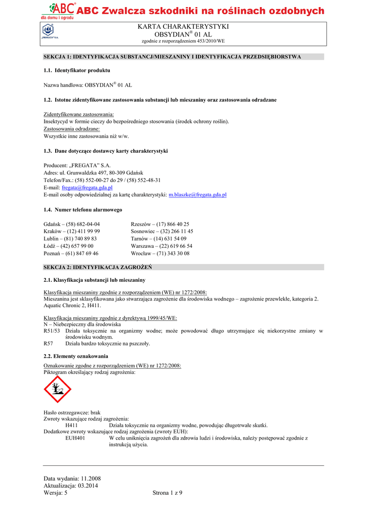 KARTA CHARAKTERYSTYKI OBSYDIAN® 01 AL zgodnie z rozporządzeniem 453/2010/WE SEKCJA 1: IDENTYFIKACJA SUBSTANCJ/MIESZANINY I IDENTYFIKACJA PRZEDSIĘBIORSTWA 1.1. Identyfikator produktu Nazwa handlowa: OBSYDIAN® 01 AL 1.2. Istotne zidentyfikowane zastosowania substancji lub mieszaniny oraz zastosowania odradzane Zidentyfikowane zastosowania: Insektycyd w formie cieczy do bezpośredniego stosowania (środek ochrony roślin). Zastosowania odradzane: Wszystkie inne zastosowania niż w/w. 1.3. Dane dotyczące dostawcy karty charakterystyki Producent: „FREGATA” S.A. Adres: ul. Grunwaldzka 497, 80-309 Gdańsk Telefon/Fax.: (58) 552-00-27 do 29 / (58) 552-48-31 E-mail: [email protected] E-mail osoby odpowiedzialnej za kartę charakterystyki: [email protected] 1.4. Numer telefonu alarmowego Gdańsk – (58) 682-04-04 Kraków – (12) 411 99 99 Lublin – (81) 740 89 83 Łódź – (42) 657 99 00 Poznań – (61) 847 69 46 Rzeszów – (17) 866 40 25 Sosnowiec – (32) 266 11 45 Tarnów – (14) 631 54 09 Warszawa – (22) 619 66 54 Wrocław – (71) 343 30 08 SEKCJA 2: IDENTYFIKACJA ZAGROŻEŃ 2.1. Klasyfikacja substancji lub mieszaniny Klasyfikacja mieszaniny zgodnie z rozporządzeniem (WE) nr 1272/2008: Mieszanina jest sklasyfikowana jako stwarzająca zagrożenie dla środowiska wodnego – zagrożenie przewlekłe, kategoria 2. Aquatic Chronic 2, H411. Klasyfikacja mieszaniny zgodnie z dyrektywą 1999/45/WE: N – Niebezpieczny dla środowiska R51/53 Działa toksycznie na organizmy wodne; może powodować długo utrzymujące się niekorzystne zmiany w środowisku wodnym. R57 Działa bardzo toksycznie na pszczoły. 2.2. Elementy oznakowania Oznakowanie zgodne z rozporządzeniem (WE) nr 1272/2008: Piktogram określający rodzaj zagrożenia: Hasło ostrzegawcze: brak Zwroty wskazujące rodzaj zagrożenia: H411 Działa toksycznie na organizmy wodne, powodując długotrwałe skutki. Dodatkowe zwroty wskazujące rodzaj zagrożenia (zwroty EUH): EUH401 W celu uniknięcia zagrożeń dla zdrowia ludzi i środowiska, należy postępować zgodnie z instrukcją użycia. Data wydania: 11.2008 Aktualizacja: 03.2014 Wersja: 5 Strona 1 z 9 KARTA CHARAKTERYSTYKI OBSYDIAN® 01 AL zgodnie z rozporządzeniem 453/2010/WE Zwroty wskazujące warunki bezpiecznego stosowania: P102 Chronić przed dziećmi. 2.3. Inne zagrożenia Zwroty określające środki ostrożności (zgodnie z załącznikiem III do rozporządzenia UE nr 547/2011): SP 1 Nie zanieczyszczać wód środkiem ochrony roślin lub jego opakowaniem. Unikać zanieczyszczenia wód poprzez rowy odwadniające z gospodarstw i dróg. SPe 8 Niebezpieczne dla pszczół. W celu ochrony pszczół i innych owadów zapylających nie stosować na rośliny uprawne w trakcie kwitnienia. Nie używać w miejscach, gdzie pszczoły maja pożytek. Nie stosować, kiedy występują kwitnące chwasty. SEKCJA 3: SKŁAD / INFORMACJA O SKŁADNIKACH 3.1. Substancje Nie dotyczy. 3.2. Mieszaniny NAZWA NR CAS/ WE STĘŻENIE [%] Butotlenek piperonylu 51-03-6/200-076-7 0,25 Pyretryny KLASYFIKACJA Dyrektywa Rozporządzenie 67/548/EWG 1272/2008 N R50/53 8003-34-7/232-319-8 0,1 Xn, N R20/21/22 R50/53 Aquatic Acute 1, H400 Aquatic Chronic 1, H410 Acute Tox. 4, H332 Acute Tox. 4, H312 Acute Tox. 4, H302 Aquatic Acute 1, H400 Aquatic Chronic 1, H410 Pełne brzmienie zwrotów wskazujących rodzaj zagrożenia podano w sekcji 16 karty. SEKCJA 4: ŚRODKI PIERWSZEJ POMOCY 4.1. Opis środków pierwszej pomocy Narażenie przez drogi oddechowe W przypadku wystąpienia niepokojących objawów - zasięgnąć porady lekarza. Kontakt ze skórą W razie zanieczyszczenia skóry, miejsce zabrudzenia dokładnie umyć wodą z mydłem. Zdjąć zanieczyszczoną odzież. Kontakt z oczami Przepłukać oczy dużą ilością wody. W razie podrażnienia zasięgnąć parady lekarza. Narażenie przez przewód pokarmowy W przypadku połknięcia natychmiast skontaktować się z ośrodkiem zatruć lub z lekarzem. 4.2. Najważniejsze ostre i opóźnione objawy oraz skutki narażenia Brak doniesień o ostrych opóźnionych objawach oraz skutkach narażenia. Data wydania: 11.2008 Aktualizacja: 03.2014 Wersja: 5 Strona 2 z 9 KARTA CHARAKTERYSTYKI OBSYDIAN® 01 AL zgodnie z rozporządzeniem 453/2010/WE 4.3. Wskazania dotyczące wszelkiej natychmiastowej pomocy lekarskiej i szczególnego postępowania z poszkodowanym Antidotum: brak, stosować leczenie objawowe. W przypadku awarii lub jeśli się źle poczujesz, niezwłocznie zasięgnij porady lekarza – jeżeli to możliwe, pokaż etykietę. SEKCJA 5: POSTĘPOWANIE W PRZYPADKU POŻARU 5.1. Środki gaśnicze Odpowiednie środki gaśnicze Piana, rozproszona woda, dwutlenek węgla, proszek gaśniczy. Niewłaściwe środki gaśnicze Nie stosować bezpośredniego strumienia wody. 5.2. Szczególne zagrożenia związane z substancją lub mieszaniną Nie identyfikowano poszczególnych produktów spalania. Podczas spalania składników organicznych mieszaniny mogą tworzyć się charakterystyczne dla typowych reakcji całkowitego i niecałkowitego spalania: tlenki i dwutlenki węgla. 5.3. Informacje dla straży pożarnej Podczas gaszenia pożaru nosić aparaty oddechowe. SEKCJA 6: POSTĘPOWANIE W PRZYPADKU NIEZAMIERZONEGO UWOLNIENIA DO ŚRODOWISKA 6.1. Indywidualne środki ostrożności, wyposażenie ochronne i procedury w sytuacjach awaryjnych Dla osób nienależących do personelu udzielającego pomocy Nie jest wymagana szczególna ochrona. Dla osób udzielających pomocy Nie jest wymagana szczególna ochrona. 6.2. Środki ostrożności w zakresie ochrony środowiska Nie zanieczyszczać wód środkiem ochrony roślin lub jego opakowaniem. Unikać zanieczyszczenia wód poprzez rowy odwadniające z gospodarstw i dróg. 6.3. Metody i materiały zapobiegające rozprzestrzenianiu się skażenia i służące do usuwania skażenia Zebrać wyciek do szczelnych pojemników. Pozostałość po wycieku zebrać za pomocą piasku lub innego absorbentu do szczelnych, oznakowanych pojemników. P