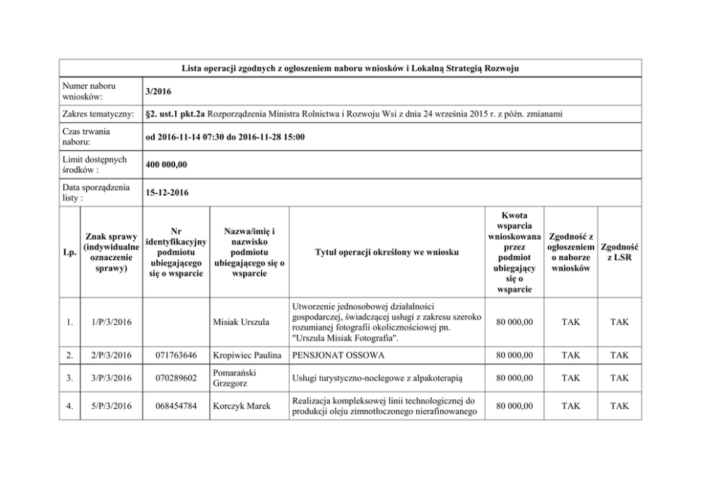Lista operacji zgodnych z ogłoszeniem naboru wniosków i Lokalną Strategią Rozwoju Numer naboru wniosków: 3/2016 Zakres tematyczny: §2. ust.1 pkt.2a Rozporządzenia Ministra Rolnictwa i Rozwoju Wsi z dnia 24 września 2015 r. z późn. zmianami Czas trwania naboru: od 2016-11-14 07:30 do 2016-11-28 15:00 Limit dostępnych środków : 400 000,00 Data sporządzenia listy : 15-12-2016 Nr Nazwa/imię i Znak sprawy identyfikacyjny nazwisko (indywidualne Lp. podmiotu podmiotu oznaczenie ubiegającego ubiegającego się o sprawy) się o wsparcie wsparcie Tytuł operacji określony we wniosku Kwota wsparcia wnioskowana Zgodność z przez ogłoszeniem Zgodność podmiot o naborze z LSR ubiegający wniosków się o wsparcie Misiak Urszula Utworzenie jednosobowej działalności gospodarczej, świadczącej usługi z zakresu szeroko rozumianej fotografii okolicznościowej pn. "Urszula Misiak Fotografia". 80 000,00 TAK TAK 1. 1/P/3/2016 2. 2/P/3/2016 071763646 Kropiwiec Paulina PENSJONAT OSSOWA 80 000,00 TAK TAK 3. 3/P/3/2016 070289602 Pomarański Grzegorz Usługi turystyczno-noclegowe z alpakoterapią 80 000,00 TAK TAK 4. 5/P/3/2016 068454784 Korczyk Marek Realizacja kompleksowej linii technologicznej do produkcji oleju zimnotłoczonego nierafinowanego 80 000,00 TAK TAK 5. 6/P/3/2016 071763852 Olszewska Justyna Utworzenie miejsc noclegowych "Gościniec u Justyny" 80 000,00 TAK TAK 6. 7/P/3/2016 068280852 Lenard Mirosława Mirosława Lenard - hotel i pielęgnacja dla zwierząt domowych 80 000,00 TAK TAK 7. 8/P/3/2016 071795736 Górny Robert Wybudowanie i wyposażenie lokalu do świadczenia usług gastronomicznych 80 000,00 TAK TAK 8. 10/P/3/2016 Szydłowska Wanda USŁUGI WULKANIZACYJNE WANDA SZYDŁOWSKA 80 000,00 TAK TAK 9. 11/P/3/2016 Czapliński Adam Gabinet psychologiczny Adam Czapliński 80 000,00 TAK TAK 10. 12/P/3/2016 Majczyna Mariusz Uruchomienie nowoczesnego warsztatu mechaniki pojazdowej "AUTO-LUX Mariusz Majczyna" 80 000,00 TAK TAK 11. 13/P/3/2016 Demianiuk Magdalena "Powrót do dzieciństwa"- utworzenie bazy turystycznej w Komarówce Podlaskiej 80 000,00 TAK TAK 071848595 031497240