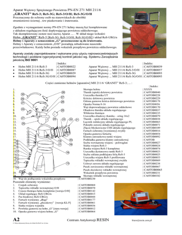 Aparat Wężowy Sprężonego Powietrza PN-EN 271 MH 211/6 „GRANIT” ReS-3; ReS-3G; ReS-3/O/H; ReS-3G/O/H Przeznaczony do ochrony osób na stanowiskach do obróbki strumieniowo ściernej , tzw piaskowanie i śrutowanie. Zgodnie z wymaganiami normy PN-EN 271 hełmy muszą być kompletowane z układem regulującym ilość dopływającego powietrza oddechowego. Tak skompletowany zestaw nosi nazwę Aparat .... . W skład niego wchodzi: Hełm „GRANIT” ReS-3 [ReS-3G; ReS-3/O/H; ReS-3G/O/H] i układ ReS-URG/n Hełmy i Aparaty z oznaczeniem „G” przeznaczone są do śrutowania. Hełmy i Aparaty z oznaczeniem „O/H” posiadają zabudowane nauszniki przeciwhałasowe. Każdy hełm posiada wskaźnik przepływu powietrza oddechowego. Aparaty zostały zaprojektowane i wykonane przy użyciu najnowocześniejszych technologii i poddane rygorystycznej kontroli jakości wg. Systemu Zarządzania jakością ISO 9001 | Indeks: · Hełm MH 211/6 ReS-3 | CA0TOB0022 Aparat Wężowy ... MH 211/6 ReS-3 · Hełm MH 211/6 ReS-3/O/H | CA0TOB0087 Aparat Wężowy ... MH 211/6 ReS-3/O/H · Hełm MH 211/6 ReS-3G | CA0TOB0029 Aparat Wężowy ... MH 211/6 ReS-3G · Hełm MH 211/6 ReS-3G/O/H | CA0TOB0094 Aparat Wężowy ... MH 211/6 ReS-3G/O/H | Indeks: | CA0TOB0039 | CA0TOB0057 | CA0TOB0093 | CA0TOB0095 Części zamienne hełmów [aparatów] MH 211/6 ‘GRANIT” ReS-3; ... : 1. 2. 3. 4. 5. 6. 7. 8. 9. 10. 11. 12. 13. 14. 15. 16. 17. 18. 19. 20. 21. 22. 23. 24. 25. 26. 27. Skorupa hełmu Tłumik (spiek) dolotowy powietrza Uszczelka tłumika UT Króciec dolotowy powietrza Osłona gumowa króćca dolotowego powietrza Opaska Norma 8-16 Wąż doprowadzający powietrze oddechowe Obudowa tłumika układu regulującego Włóknina tłumiąca Uszczelka obudowy tłumika – oring 16x2 Tłumik – spiek układu regulującego Łącznik redukcyjny układu regulującego PL Pokrętło zaworu układu regulującego Złącze błyskawiczne CHS układu regulującego Fartuch ochronny [wymienny] zwykły Opaska gumowa fartucha Klamra zatrzaskowa ramki wizjera Podkładka gumowa klamry zatrzaskowej Szyba wewnętrzna wizjera – poliwęglan Siatka wizjera ReS-3 Ramka wizjera ReS-3 kompletna Uszczelka dystansowa ramki ReS-3 Szyba szklana podklejana folią ReS-3 Uszczelka wizjera ReS-3 profilowana Tapicerka wkładki wewnętrznej zwykła Uchwyt zaworu układu regulującego Pasek zawieszenia wkładki wewnętrznej Pasek dociskowy wkładki wewnętrznej Wskaźnik przepływu powietrza Skorupa wkładki wewnętrznej | CA0TOB0230 28. 29. 30. Wąż do podłączenia wskaźnika przepływu | Indeks: | XXXX | CA0TOB0040 | CA0TOB0228 | CA0TOB0229 | CA0TOB0178 | CA0TOS0056 | CA0TOB0170 | CA0TOB0037 | CA0TOB0235 | CA0TOB0079 | CA0TOB0038 | CA0TOB0063 | CA0TOB0071 | CA0TOB0109 | CA0TOB0016 | CA0TOB0054 | CA0TOB0092 | CA0TOB | CA0TOB0027 | CA0TOB0024 | CA0TOB0074 | CA0TOB0023 | CA0TOB0025 | CA0TOB0053 | CA0TOB0069 | CA0TOB0238 | CA0TOB0067 | CA0TOB0065 | CA0TOB0231 | CA0TOB0182 Pozostałe elementy wymienne: 1. 2. 3. 4. 5. 6. 7. 8. 9. 10. Czepek ochronny Tapicerka wkładki wewnętrznej O/H Czasza tłumiąca hałas kompletne [wersja O/H] Układ regulujący ReS-URG/n Pas biodrowy ReS-URG/n Fartuch wymienny „długi” Fartuch wymienny „plecakowy” [wersja KL/F] Siatka wizjera wypukła Powłoka gumowa na hełm „G” [stara wersja] Opaska gumowa wizjera hełmu „G” A2 C:\Moje dokumenty\Strony do folder\He ReS3 str A2.doc | CA0TOB0060 | CA0TOB0070 | CA0TOB0142 | CA0TOB0015 | CA0TOB0044 | CA0TOB0177 | CA0TOB0061 | CA0TOB0036 | CA0TOB0012 | CA0TOB0064 Centrum Antykorozji RESIN [email protected] PL 32-052 Radziszów JURCZYCE 111 tel/fax +48 12 275 17 45; +48 12 275 17 46 C:\Moje dokumenty\Strony do folder\He ReS3 str A2.doc www.resin.com.pl