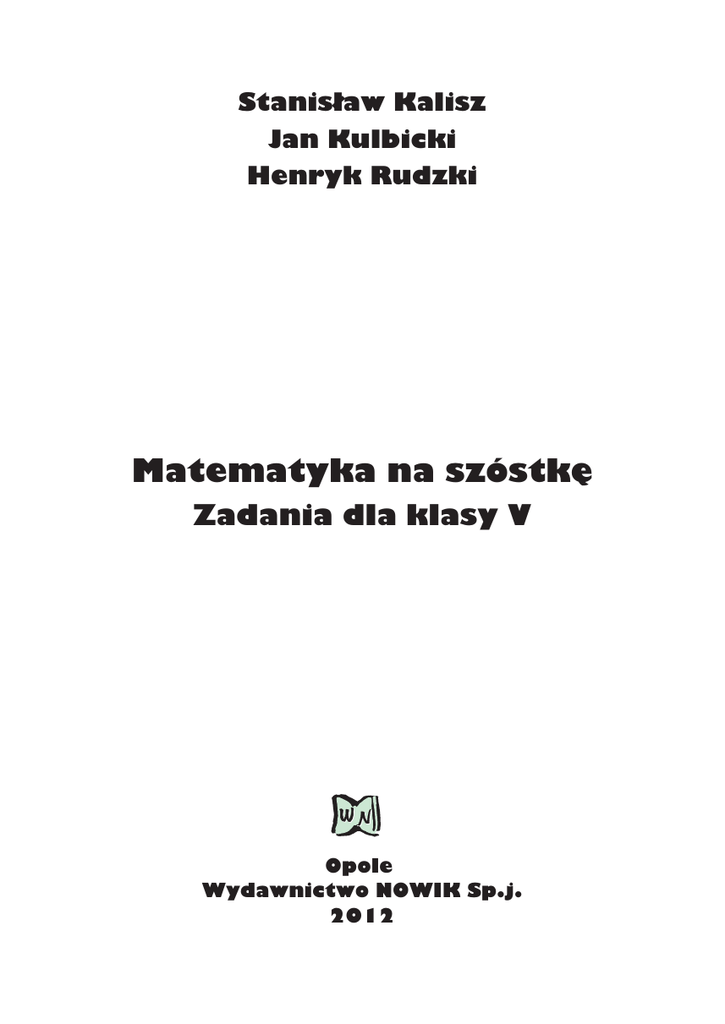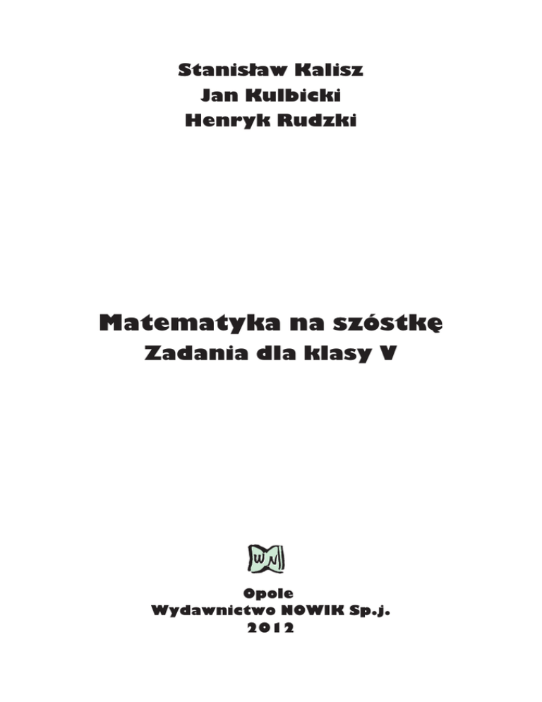 Stanislaw Kalisz Jan Kulbicki Henryk Rudzki Matematyka na szóstke Zadania dla klasy V Opole Wydawnictwo NOWIK Sp.j. 2012 Wstêp . . . . . . . . . . . . . . . . . . . . . . . . . . . . . . . . . . . . . . . . . . . . . . . . . . . . . . . . . 5 1. Liczby naturalne . . . . . . . . . . . . . . . . . . . . . . . . . . . . . . . . . . . . . . . . . . . 7 Rachunek pamiêciowy . ...............................7 Dodawanie i odejmowanie . . . . . . . . . . . . . . . . . . . . . . . . . . 7 Mno¿enie i dzielenie . . . . . . . . . . . . . . . . . . . . . . . . . . . . . . . 8 Kolejnoœæ wykonywania dzia³añ. . . . . . . . . . . . . . . . . . . . . . 9 Zadania ró¿ne . . . . . . . . . . . . . . . . . . . . . . . . . . . . . . . . . . . 10 Rachunek pisemny . . . . . . . . . . . . . . . . . . . . . . . . . . . . . . . . . . 16 5. Dodawanie i odejmowanie . . . . . . . . . . . . . . . . . . . . . . . . . 16 6. Mno¿enie i dzielenie . . . . . . . . . . . . . . . . . . . . . . . . . . . . . . 17 7. Kolejnoœæ wykonywania dzia³añ. . . . . . . . . . . . . . . . . . . . . 19 8. Zadania ró¿ne . . . . . . . . . . . . . . . . . . . . . . . . . . . . . . . . . . . 20 1. 2. 3. 4. 2. Podzielnoœæ . . . . . . . . . . . . . . . . . . . . . . . . . . . . . . . . . . . . . . . . . . . . . . . 23 1. Dzielenie z reszt¹ . . . . . . . . . . . . . . . . . . . . . . . . . . . . . . . . 23 2. Wielokrotnoœci i dzielniki . . . . . . . . . . . . . . . . . . . . . . . . . . 24 3. Cechy podzielnoœci . . . . . . . . . . . . . . . . . . . . . . . . . . . . . . . 25 3. U³amki dziesiêtne ........................................ 29 1. Dodawanie i odejmowanie . . . . . . . . . . . . . . . . . . . . . . . . . 29 2. Mno¿enie i dzielenie u³amków dziesiêtnych przez liczby naturalne. . . . . . . . . . . . . . . . . . . . . . . . . . . . . 30 3. Zadania ró¿ne . . . . . . . . . . . . . . . . . . . . . . . . . . . . . . . . . . . 34 4. U³amki zwyk³e . . . . . . . . . . . . . . . . . . . . . . . . . . . . . . . . . . 37 1. Dodawanie i odejmowanie . . . . . . . . . . . . . . . . . . . . . . . . . 37 2. Mno¿enie i dzielenie u³amków zwyk³ych przez liczbê naturaln¹ . . . . . . . . . . . . . . . . . . . . . . . . . . . . . 39 3. Zadania ró¿ne . . . . . . . . . . . . . . . . . . . . . . . . . . . . . . . . . . . 42 5. U³amki zwyk³e i dziesiêtne . . . . . . . . . . . . . . . . . . . . . . . . . 45 1. Zadania ró¿ne . . . . . . . . . . . . . . . . . . . . . . . . . . . . . . . . . . . 45 3 6. Procenty . . . . . . . . . . . . . . . . . . . . . . . . . . . . . . . . . . . . . . . . 51 1. Procent liczby — zadania ró¿ne . . . . . . . . . . . . . . . . . . . . . 51 7. Figury geometryczne. . . . . . . . . . . . . . . . . . . . . . . . . . . . . . 57 1. 2. 3. 4. K¹ty. . . . . . . . . . . . . . . . . . . . . . . . . . . . . . . . . . . . . . . . . . . 57 Wielok¹ty . . . . . . . . . . . . . . . . . . . . . . . . . . . . . . . . . . . . . . 59 Trójk¹ty. . . . . . . . . . . . . . . . . . . . . . . . . . . . . . . . . . . . . . . . 60 Czworok¹ty. . . . . . . . . . . . . . . . . . . . . . . . . . . . . . . . . . . . . 63 8. Potêgi . . . . . . . . . . . . . . . . . . . . . . . . . . . . . . . . . . . . . . . . . . 69 1. Zadania ró¿ne . . . . . . . . . . . . . . . . . . . . . . . . . . . . . . . . . . . 69 9. Wyra¿enia algebraiczne . . . . . . . . . . . . . . . . . . . . . . . . . . . 73 1. Zadania ró¿ne . . . . . . . . . . . . . . . . . . . . . . . . . . . . . . . . . . . 73 10. Liczby ca³kowite . . . . . . . . . . . . . . . . . . . . . . . . . . . . . . . . 77 1. Zadania ró¿ne . . . . . . . . . . . . . . . . . . . . . . . . . . . . . . . . . . . 77 11. Równania . . . . . . . . . . . . . . . . . . . . . . . . . . . . . . . . . . . . . . 81 1. Zadania ró¿ne . . . . . . . . . . . . . . . . . . . . . . . . . . . . . . . . . . . 81 12. Uk³ad wspó³rzêdnych . . . . . . . . . . . . . . . . . . . . . . . . . . . . 85 1. Zadania ró¿ne . . . . . . . . . . . . . . . . . . . . . . . . . . . . . . . . . . . 85 13. Pola figur. . . . . . . . . . . . . . . . . . . . . . . . . . . . . . . . . . . . . . . 89 1. Zadania ró¿ne . . . . . . . . . . . . . . . . . . . . . . . . . . . . . . . . . . . 89 14. Graniastos³upy . . . . . . . . . . . . . . . . . . . . . . . . . . . . . . . . . . 93 1. Zadania ró¿ne . . . . . . . . . . . . . . . . . . . . . . . . . . . . . . . . . . . 93 15. Elementy statystyki . . . . . . . . . . . . . . . . . . . . . . . . . . . . . . 97 1. Zadania ró¿ne . . . . . . . . . . . . . . . . . . . . . . . . . . . . . . . . . . . 97 16. Odkrywanie prawid³owoœci . . . . . . . . . . . . . . . . . . . . . . 107 1. Zadania ró¿ne . . . . . . . . . . . . . . . . . . . . . . . . . . . . . . . . . . 107 17. Zadania zamkniête . . . . . . . . . . . . . . . . . . . . . . . . . . . . . . 111 1. 2. 3. 4. Liczby naturalne . . . . . . . . . . . . . . . . . . . . . . . . . . . . . . . . 111 U³amki zwyk³e i dziesiêtne . . . . . . . . . . . . . . . . . . . . . . . . 118 Figury geometryczne. . . . . . . . . . . . . . . . . . . . . . . . . . . . . 129 Elementy statystyki . . . . . . . . . . . . . . . . . . . . . . . . . . . . . . 139 Odpowiedzi i wskazówki 4 .................................. 143 Prezentowany zbiór zadañ przeznaczony jest dla uczniów klasy V szko³y podstawowej. Zawiera 399 zadañ otwartych i 160 zadañ zamkniêtych. Napisany zosta³ z uwzglêdnieniem obowi¹zuj¹cej podstawy programowej z matematyki dla szko³y podstawowej. Dostarcza nauczycielom i uczniom zainteresowanym matematyk¹ treœci uzupe³niaj¹cych do podrêczników. Zadania w ksi¹¿ce s¹ zró¿nicowane pod wzglêdem stopnia trudnoœci. Wiele z nich to zadania problemowe, doœæ trudne, wymagaj¹ce pomys³u i cierpliwoœci, ale mo¿liwe do rozwi¹zania przez uczniów maj¹cych ambicjê otrzymania oceny celuj¹cej. S¹ tu równie¿ zadania z konkursów matematycznych. Staraliœmy siê, aby treœæ zadañ i ich forma by³y atrakcyj