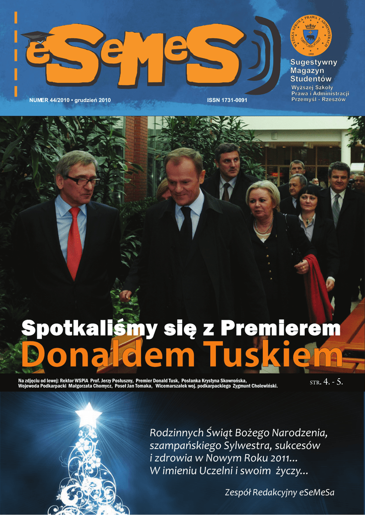 Sugestywny Magazyn Studentów NUMER 44/2010 • grudzień 2010 ISSN 1731-0091 Na zdjęciu od lewej: Rektor WSPiA Prof. Jerzy Posłuszny, Premier Donald Tusk, Posłanka Krystyna Skowrońska, Wojewoda Podkarpacki Małgorzata Chomycz, Poseł Jan Tomaka, Wicemarszałek woj. podkarpackiego Zygmunt Cholewiński. Wy ż s z e j S z k o ł y Prawa i Administracji Przemyśl - Rzeszów STR . 4. - 5. Rodzinnych Świąt Bożego Narodzenia, szampańskiego Sylwestra, sukcesów i zdrowia w Nowym Roku 2011... W imieniu Uczelni i swoim życzy... Zespół Redakcyjny eSeMeSa 2 z życia naszej uczelni 44 /2010 EURO 2012, a bezpieczeństwo... W WSPiA odbyło się Seminarium “EURO 2012 - bezpieczeństwo w teorii, praktyce i świadomości społecznej” z udziałem gości z Polski. Ukrainy i USA. Specjaliści z tego zakresu (zarówno nasi wykładowcy jak i przedstawiciele służb mundurowych) mówili o przygotowaniach do EURO 2012, ewentualnych zagrożeniach i planowanych rozwiązaniach, które ułatwią przejazd przez nasze Województwo kibicom wybierającym się na mecze na Ukrainie. Więcej na ten temat – czytaj str. 10. W SEMINARIUM UDZIAŁ WZIĘLI M. IN.: dr Janusz ONYSZKIEWICZ, Przewodniczący Rady Stowarzyszenia Euro-Atlan tyckiego, b. Minister MON Prof. Zbigniew ĆWIĄKALSKI, b. Minister Sprawiedliwości, Wykładowca WSPiA Allan GREENBERG, Konsul Generalny USA w Krakowie Płk. Siergiej KIDAŁOW, Doradca Prezydenta EURO 2012 we Lwowie Piotr DANIEL, Dyrektor Izby Celnej w Przemyślu, Wykładowca WSPiA Gen. Józef GDAŃSKI, Komendant Wojewódzki Policji w Rzeszowie Dominik TRACZ, Komendant Bieszczadzkiego Oddziału Straży Granicznej w numerze 44 /2010 4- 5 WYDARZENIE ROZMOWA Z PREMIEREM DONALDEM TUSKIEM. PODCZAS WIZYTY NA PODKARPACIU (LISTOPAD BR.) PREMIER ODWIEDZIŁ TAKŻE NASZĄ UCZELNIĘ I PRZY TEJ OKAZJI UDZIELIŁ NAM WYWIADU. 6 WYDARZENIE W WSPIA ODBYŁO SIĘ PIERWSZE KONWERSATORIUM (Z ZAKRESU PRAWA KARNEGO) W RAMACH PODKARPACKIEGO FORUM MYŚLI PRAWNICZEJ - KOLEJNEJ INICJATYWY NAUKOWEJ REALIZOWANEJ PRZEZ NASZĄ UCZELNIĘ. 7 WYDARZENIE MŁODZIEŻOWA AKADEMIA PRAWA – TO POMYSŁ NASZEJ UCZELNI REALIZOWANY PRZY WSPÓŁUDZIALE PODKARPACKIEGO KURATORA OŚWIATY ORAZ KRAJOWEJ SZKOŁY SĄDOWNICTWA I PROKURATURY. W WSPIA ODBYŁA SIĘ INAUGURACJA ROKU AKADEMICKIEGO MAP. 8-9 NASI DOKTORANCI O SOBIE I SWOJEJ PRACY DOKTORSKIEJ OPOWIADA NAM DR ŁUKASZ BUCZKOWSKI I DR AGNIESZKA GAŁAKAN-HALICKA 10 Z ŻYCIA NASZEJ UCZELNI W WSPIA ODBYŁO SIĘ SEMINARIUM: EURO 2012 - BEZPIECZEŃSTWO W TEORII, PRAKTYCE I ŚWIADOMOŚCI SPOŁECZNEJ 11-14 ZAPROSILI NAS MY U WOJEWODY - ESEMES W PODKARPACKIM URZĘDZIE WOJEWÓDZKIM 15 Z ŻYCIA NASZYCH STUDENTÓW WZIĘLIŚMY UDZIAŁ W OBRADACH PARLAMENTU STUDENTÓW RP 16-17 Z ŻYCIA NASZYCH STUDENTÓW OLA PĘKOSZ I ANIA OPAR OPOWIADAJĄ, JAK STUDIUJE SIĘ ZA GRANICĄ 18-19 WYWIAD ROZMOWA Z HALINĄ FRĄCKOWIAK, GWIAZDĄ POLSKIEJ ESTRADY, KTÓRA WYSTĄPIŁA W NASZEJ UCZELNI PRZY OKAZJI INAUGURACJI OBCHODÓW 15-LECIA WSPIA 20-21 WYWIAD ROZMOWA Z PIOTREM BORUTĄ, PÓŁFINALISTĄ PROGRAMU „MAM TALENT”, BRZUCHOMÓWCĄ I AKTOREM, KTÓRY PRZY OKAZJI „DNIA STUDENTA” I „DNIA SPORTU” WSPIA WYSTĄPIŁ W NASZYM KLUBIE STUDENCKIM „ZEMSTA DOCENTA” 22 UŚMIECHNIJ SIĘ 23 WYDARZENIE SAMORZĄD STUDENCKI ZORGANIZOWAŁ IMPREZĘ MIKOŁAJKOWĄ DLA SWOICH PODOPIECZNYCH I MŁODSZYCH PRZYJACIÓŁ – WYCHOWANKÓW Z PLACÓWEK OPIEKUŃCZO-WYCHOWAWCZYCH Z ŁĄKI I WIDEŁKI. 24 Z ŻYCIA NASZYCH STUDENTÓW NIEZŁA ZABAWA - MAGAZYN STUDENTÓW WYŻSZEJ SZKOŁY PRAWA I ADMINISTRACJI PRZEMYŚL - RZESZÓW WYDAWCA: REDAGUJE ZESPÓŁ: WYŻSZA SZKOŁA PRAWA I ADMINISTRACJI PRZEMYŚL - RZESZÓW, UL. WYBRZEŻE OJCA ŚWIĘTEGO JANA PAWŁA II 2. NAKŁAD 5000 EGZ.; ISSN 1731-0091. BEATA BEDNARCZYK, P.O. REDAKTORA NACZELNEGO; [email protected], tel. 517 170 967 SIEDZIBA REDAKCJI: EWA KOCYŁA, P.O. ZASTĘPCY REDAKTORA NACZELNEGO; [email protected], tel 510 454 251 ZAMIEJSCOWY WYDZIAŁ PRAWA I ADMINISTRACJI W RZESZOWIE WYŻSZEJ SZKOŁY PRAWA I ADMINISTRACJI, UL. CEGIELNIANA 14, 35-310 RZESZÓW, POK. 2.02, [email protected] PATRICIA MITRO, IWONA KOCYŁA, PAULA LEMIECHA, JOANNA PEŁDIAK, MAGDALENA MAZURKOW, RENATA MUCHA, ANNA OPAR, ALEKSANDRA PĘKOSZ, ALICJA WOŹNIAK, MICHAŁ JACHYM. 3 4 wydarzenie 44 /2010 Szczerze Wam zazdroszczę Rozmowa z Premierem Donaldem TUSKIEM. Podczas wizyty na Podkarpaciu (listopad br.) Premier odwiedził także naszą Uczelnię i przy tej okazji udzielił nam wywiadu. - Panie Premierze! Dziękujemy za to, że znalazł Pan czas, aby się z nami spotkać. Nasze pierwsze pytanie: często odwiedza Pan uczelnie wyższe. Czy przy okazji t akich wizyt wspomina Pan swoje czasy studenckie? - Tak, te wspomnienia towarzyszą mi niejednokrotnie. Widząc Waszą uczelnię, szczerze mogę powiedzieć, że Wam zazdroszczę. Gdy j a byłem studentem, nie miałem ok azji studiować w t ak wspaniałych warunkach lokalowych. Były to lata 70. Poza tym – statystyki wskazywały wówczas, że tylko 5 proc. obywateli naszego kraju ma wyższe wykształcenie. Dlatego, oceniając okres moich studiów z perspektywy czasu, a t akże obserwując zachodzące pod tym względem zmiany, ogromnie cieszy mnie fakt, że teraz coraz więcej młodych ludzi podejmuje naukę w uczelniach wyższych. GDY PRZYJEŻDŻAM NA PODKARPACIE JESTEM SZCZĘŚLIWY, WIDZĄC TAK SZYBKO ROZWIJAJĄCY SIĘ REGION. TAK AMBITNYCH MŁODYCH LUDZI, DĄŻĄCYCH DO ZAMIERZONEGO CELU. TUTAJ ZAUWAŻAM „ZDROWY GŁÓD” POLEGAJĄCY NA CHĘCI REALIZACJI SWOICH AMBICJI POPRZEZ AKTYWNE DZIAŁANIE. - W idziałyśmy billbord z P ana zdjęciem i hasłem: „Nie róbmy polityki, budujmy szkoły...”. Czy sformułowanie to odnosi się r ównież do uczelni wyższych? - Oczywiście. Wyjaśnię jednak, co m am na myśli, mówiąc o szkołach i uczelniach – dobrych szkołach i uczelniach. Ważne jest, aby dobra szkoła była szkołą posiadającą doskonałą kadrę, zaplecze naukowo dydaktyczne, a przede wszystkim – aby świetnie kształciła w dan ym kierunk