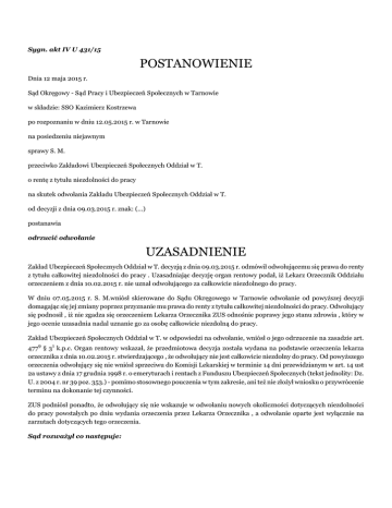 Sygn. akt IV U 431/15 POSTANOWIENIE Dnia 12 maja 2015 r. Sąd Okręgowy - Sąd Pracy i Ubezpieczeń Społecznych w Tarnowie w składzie: SSO Kazimierz Kostrzewa po rozpoznaniu w dniu 12.05.2015 r. w Tarnowie na posiedzeniu niejawnym sprawy S. M. przeciwko Zakładowi Ubezpieczeń Społecznych Oddział w T. o rentę z tytułu niezdolności do pracy na skutek odwołania Zakładu Ubezpieczeń Społecznych Oddział w T. od decyzji z dnia 09.03.2015 r. znak: (...) postanawia odrzucić odwołanie UZASADNIENIE Zakład Ubezpieczeń Społecznych Oddział w T. decyzją z dnia 09.03.2015 r. odmówił odwołującemu się prawa do renty z tytułu całkowitej niezdolności do pracy . Uzasadniając decyzję organ rentowy podał, iż Lekarz Orzecznik Oddziału orzeczeniem z dnia 10.02.2015 r. nie uznał odwołującego za całkowicie niezdolnego do pracy. W dniu 07.05.2015 r. S. M.wniósł skierowane do Sądu Okręgowego w Tarnowie odwołanie od powyższej decyzji domagając się jej zmiany poprzez przyznanie mu prawa do renty z tytułu całkowitej niezdolności do pracy. Odwołujący się podnosił , iż nie zgadza się orzeczeniem Lekarza Orzecznika ZUS odnośnie poprawy jego stanu zdrowia , który w jego ocenie uzasadnia nadal uznanie go za osobę całkowicie niezdolną do pracy. Zakład Ubezpieczeń Społecznych Oddział w T. w odpowiedzi na odwołanie, wniósł o jego odrzucenie na zasadzie art. 4779 § 31 k.p.c. Organ rentowy wskazał, że przedmiotowa decyzja została wydana na podstawie orzeczenia lekarza orzecznika z dnia 10.02.2015 r. stwierdzającego , że odwołujący nie jest całkowicie niezdolny do pracy. Od powyższego orzeczenia odwołujący się nie wniósł sprzeciwu do Komisji Lekarskiej w terminie 14 dni przewidzianym w art. 14 ust 2a ustawy z dnia 17 grudnia 1998 r. o emeryturach i rentach z Funduszu Ubezpieczeń Społecznych (tekst jednolity: Dz. U. z 2004 r. nr 39 poz. 353.) - pomimo stosownego pouczenia w tym zakresie, ani też nie złożył wniosku o przywrócenie terminu na dokonanie tej czynności. ZUS podniósł ponadto, że odwołujący się nie wskazuje w odwołaniu nowych okoliczności dotyczących niezdolności do pracy powstałych po dniu wydania orzeczenia przez Lekarza Orzecznika , a odwołanie oparte jest wyłącznie na zarzutach dotyczących tego orzeczenia. Sąd rozważył co następuje: Odwołanie S. M. od decyzji Zakładu Ubezpieczeń Społecznych Oddział w T. z dnia 09.03.2015 r. podlega odrzuceniu na podstawie art. 477( 9) § 3( 1) kpc. Stosownie do treści powołanego przepisu Sąd odrzuci odwołanie w sprawie o świadczenie z ubezpieczeń społecznych, do którego prawo jest uzależnione od stwierdzenia niezdolności do pracy lub niezdolności do samodzielnej egzystencji, a podstawę do wydania decyzji stanowi orzeczenie lekarza orzecznika Zakładu Ubezpieczeń Społecznych, jeżeli osoba zainteresowana nie wniosła sprzeciwu od tego orzeczenia do komisji lekarskiej Zakładu Ubezpieczeń Społecznych i odwołanie jest oparte wyłącznie na zarzutach dotyczących tego orzeczenia. Jeżeli odwołanie opiera się także na zarzucie nierozpatrzenia wniesionego po terminie sprzeciwu od tego orzeczenia, a wniesienie sprzeciwu po terminie nastąpiło z przyczyn niezależnych od osoby zainteresowanej, Sąd uchyla decyzję, przekazuje sprawę do ponownego rozpoznania organowi rentowemu i umarza postępowanie. W takim przypadku organ rentowy kieruje sprzeciw do rozpatrzenia do komisji lekarskiej Zakładu Ubezpieczeń Społecznych. W niniejszej sprawie orzeczeniem z dnia 10.02.2015 r. Lekarz Orzecznik nie uznał odwołującego za osobę całkowicie niezdolną do pracy. Odpis tego orzeczenia doręczono odwołującemu w dniu 16.02.2015 r. za pośrednictwem (...) (akta ZUS). Przedmiotowe orzeczenie, które organ prawidłowo doręczył odwołującemu zawiera pouczenie w przedmiocie przysługującego badanemu prawa do wniesienia sprzeciwu do Komisji Lekarskiej ZUS, właściwej ze względu na miejsce zamieszkania, w terminie 14 dni od dnia doręczenia orzeczenia. Odwołujący się nie złożył sprzeciwu od orzeczenia Lekarza Orzecznika Oddziału w ustawowym terminie 14 dni . Terać odwołania nie wskazuje, iż odwołujący się w jakikolwiek sposób usprawiedliwia uchybienie terminu, w szczególności przyczynami od niego niezależnymi. Odwołujący się jednocześnie nie wskazuje żadnych nowych okoliczności dotyczących niezdolności do pracy powstałych po dniu wydania orzeczenia przez Lekarza Orzecznika, które miałyby wpływ na zmianę orzeczenia oraz ponowne rozpoznanie sprawy na podstawie art. 4779 § 21 k.p.c. Zgodnie z art. 14 ust 2a ustawy z dnia 17 grudnia 1998 r. o emeryturach i rentach z Funduszu Ubezpieczeń Społecznych (tekst jednolity: Dz. U. z 2004 r. nr 39 poz. 353.) - od orzeczenia lekarza orzecznika osobie zainteresowanej przysługuje sprzeciw do komisji lekarskiej Zakładu, w ciągu 14 dni od dnia doręczenia tego orzeczenia. Ust 2c powołanego przepisu stanowi, iż Komisja Lekarska nie rozpatruje sprzeciwu wniesionego po terminie. W uzasadnionych przypadkach Zakład, na wniosek osoby zainteresowanej, może przywrócić termin na wniesienie sprzeciwu, w tym w szczególności w razie odrzucenia przez Sąd odwołania od decyzji w przypadku określonym w art. 4779 § 31 ustawy z dnia 17 listopada 1964 r. - Kodeks postępowania cywilnego. W świetle powyższego odwołanie S. M. od zaskarżonej decyzji organu rentowego z dnia 09.03.2015 r. należało odrzucić w oparciu o art. 477( 9) § 3( 1) k.p.c. Odwołujący bowiem, mimo prawidłowego pouczenia nie wniósł w ustawowym terminie 14 dni sprzeciwu do Komisji Lekarskiej od orzeczenia Lekarza Orzecznika, a odwołanie od wydanej w wyniku przedmiotowego orzeczenia decyzji oparte jest wyłącznie na zarzutach dotyczących przedmiotowego orzeczenia.