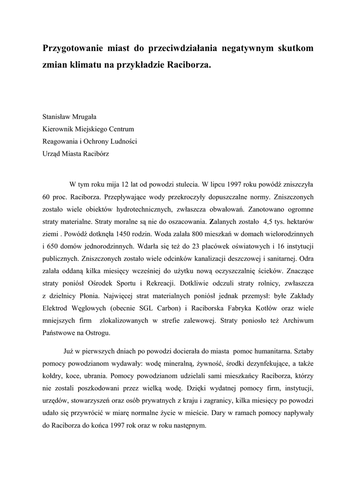 Przygotowanie miast do przeciwdziałania negatywnym skutkom zmian klimatu na przykładzie Raciborza. Stanisław Mrugała Kierownik Miejskiego Centrum Reagowania i Ochrony Ludności Urząd Miasta Racibórz W tym roku mija 12 lat od powodzi stulecia. W lipcu 1997 roku powódź zniszczyła 60 proc. Raciborza. Przepływające wody przekroczyły dopuszczalne normy. Zniszczonych zostało wiele obiektów hydrotechnicznych, zwłaszcza obwałowań. Zanotowano ogromne straty materialne. Straty moralne są nie do oszacowania. Zalanych zostało 4,5 tys. hektarów ziemi . Powódź dotknęła 1450 rodzin. Woda zalała 800 mieszkań w domach wielorodzinnych i 650 domów jednorodzinnych. Wdarła się też do 23 placówek oświatowych i 16 instytucji publicznych. Zniszczonych zostało wiele odcinków kanalizacji deszczowej i sanitarnej. Odra zalała oddaną kilka miesięcy wcześniej do użytku nową oczyszczalnię ścieków. Znaczące straty poniósł Ośrodek Sportu i Rekreacji. Dotkliwie odczuli straty rolnicy, zwłaszcza z dzielnicy Płonia. Najwięcej strat materialnych poniósł jednak przemysł: byłe Zakłady Elektrod Węglowych (obecnie SGL Carbon) i Raciborska Fabryka Kotłów oraz wiele mniejszych firm zlokalizowanych w strefie zalewowej. Straty poniosło też Archiwum Państwowe na Ostrogu. Już w pierwszych dniach po powodzi docierała do miasta pomoc humanitarna. Sztaby pomocy powodzianom wydawały: wodę mineralną, żywność, środki dezynfekujące, a także kołdry, koce, ubrania. Pomocy powodzianom udzielali sami mieszkańcy Raciborza, którzy nie zostali poszkodowani przez wielką wodę. Dzięki wydatnej pomocy firm, instytucji, urzędów, stowarzyszeń oraz osób prywatnych z kraju i zagranicy, kilka miesięcy po powodzi udało się przywrócić w miarę normalne życie w mieście. Dary w ramach pomocy napływały do Raciborza do końca 1997 rok oraz w roku następnym. Z chwilą ustąpienia wody władze miasta, mieszkańcy, wolontariusze oraz podmioty gospodarcze przystąpiły do intensywnych prac związanych z szacowaniem strat i usuwaniem skutków powodzi. W okresie od lipca 1997 do końca 2002 r. na prowadzenie akcji powodziowej, likwidację skutków powodzi oraz ochronę przeciwpowodziową wydatkowano łącznie 54.165.264 zł. Po powodzi w 1997 r. Raciborzu przystąpiono do odbudowy i modernizacji zniszczonych wałów i urządzeń wodnych. W chwili obecnej są one podwyższone i zbudowane według najnowszej technologii. Wyremontowano przepompownie, kanalizację burzową i wyloty do rzeki Odry. Bardzo ważnym elementem ochrony przeciwpowodziowej był remont śluzy przy „Rafako” zamykającej przepływ wody Odrą Śródmiejska i skierowanie jej do kanału Ulga. Odbudowano również Suchy Dok w Studziennej ograniczający przepływ wód deszczowych z pól w rejonie Samborowic i Wojnowic. W grudniu 1997 r., przy wsparciu Banku Światowego, Racibórz przystąpił do projektu likwidacji skutków powodzi ze szczególnym zwróceniem uwagi na program „Prewencja i Ograniczenie Zagrożenia Powodziowego”. Efektem było opracowanie Lokalnego Planu Ograniczania Skutków Powodzi i Profilaktyki Powodziowej dla Miasta Racibórz. Otrzymana pomoc finansowa z Banku Światowego pozwoliła rozbudować i zmodernizować system ostrzegania i alarmowania ludności. W chwili obecnej na terenie strefy zalewowej miasta zamontowanych jest 11 elektronicznych syren alarmowych. W 2009 roku miasto w ramach EWT otrzymało dofinansowanie na rozbudowę i modernizacje systemu ostrzegania i alarmowania w wysokości 35 tyś EUR. W ramach tego przedsięwzięcia planuje się zakup 5 dodatkowych syren elektronicznych, stacji meteo oraz zakup nowoczesnej centrali sterującej. System ten umożliwia przekazywanie komunikatów słownych w czasie wystąpienia zagrożenia związanego z katastrofami, klęskami żywiołowymi i innymi nadzwyczajnymi zagrożeniami ludności i środowiska. Podpisane w ramach tego projektu porozumienie o współpracy w zakresie zarządzania kryzysowego i wczesnego ostrzegania o zagrożeniach z Miastem Bohumin otworzyło nam dostęp do aktualnych danych o zagrożeniach meteorologicznych i hydrologicznych występujących w dorzeczu górnej Odry na terytorium Republiki Czeskiej. Miejski system ostrzegania i alarmowania w przypadku wystąpienia zagrożenia będzie uzupełniany przez lokalne środki masowego przekazu. Porozumienia w tym zakresie Miasto Racibórz podpisało z Radiem” Vanessa” 100,3 FM oraz Raciborską Telewizją Kablową. Również pojazdy Straży Miejskiej są wyposażone w przewoźne syreny elektroniczne. Istotnym elementem ochrony przeciwpowodziowej w Raciborzu było uruchomienie w 2001 roku Powiatowego Systemu Łączności Radiowej, który ma za zadanie zapewnienie wymiany informacji i koordynacji działań służb ratowniczych i jednostek współdziałających oraz gmin z całego powiatu. Użytkownikami sieci łączności radiowej oprócz wcześniej wymienionych są jednostki organizacyjne podlegle Prezydentowi Miasta Racibórz, służby komunalne, większe zakłady przemysłowe zlokalizowane w strefie zalewowej oraz osoby funkcyjne i zespoły ewakuacji. Na wyposażeniu służb miejskich znajduje się 50 radiotelefonów stacjonarnych i przenośnych. W ramach zaopatrywania miasta w specjalistyczny sprzęt do prowadzenia akcji ratowniczych utworzono magazyn przeciwpowodziowy, na wyposażeniu którego znajduje się miedzy innymi 6 łodzi ratowniczo-ewakuacyjnych z osprzętem oraz agregaty prądotwórcze i inny sprzęt niezbędny do prowadzenia działań ratowniczych. Ponadto opracowano plan ewakuacji ludności, zwierząt i maszyn rolniczych z terenów zalewowych. W ramach tego programu wytypowano odpowiednie obiekty na przyjęcie ludności, służb ratowniczych, zwierząt oraz parkingi na samochody osobowe i maszyny rolnicze. Mapki ewakuacji dostarczono mieszkańcom terenów zalewowych w specjalnych apteczkach pierwszej pomocy. Miasto postawiło również na edukację społecze