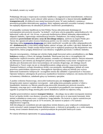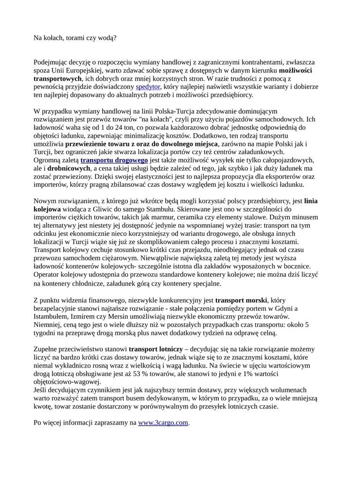 Na kołach, torami czy wodą? Podejmując decyzję o rozpoczęciu wymiany handlowej z zagranicznymi kontrahentami, zwłaszcza spoza Unii Europejskiej, warto zdawać sobie sprawę z dostępnych w danym kierunku możliwości transportowych, ich dobrych oraz mniej korzystnych stron. W razie trudności z pomocą z pewnością przyjdzie doświadczony spedytor, który najlepiej naświetli wszystkie warianty i dobierze ten najlepiej dopasowany do aktualnych potrzeb i możliwości przedsiębiorcy. W przypadku wymiany handlowej na linii Polska-Turcja zdecydowanie dominującym rozwiązaniem jest przewóz towarów ''na kołach'', czyli przy użyciu pojazdów samochodowych. Ich ładowność waha się od 1 do 24 ton, co pozwala każdorazowo dobrać jednostkę odpowiednią do objętości ładunku, zapewniając minimalizację kosztów. Dodatkowo, ten rodzaj transportu umożliwia przewiezienie towaru z oraz do dowolnego miejsca, zarówno na mapie Polski jak i Turcji, bez ograniczeń jakie stwarza lokalizacja portów czy też centrów załadunkowych. Ogromną zaletą transportu drogowego jest także możliwość wysyłek nie tylko całopojazdowych, ale i drobnicowych, a cena takiej usługi będzie zależeć od tego, jak szybko i jak duży ładunek ma zostać przewieziony. Dzięki swojej elastyczności jest to najlepsza propozycja dla eksporterów oraz importerów, którzy pragną zbilansować czas dostawy względem jej kosztu i wielkości ładunku. Nowym rozwiązaniem, z którego już wkrótce będą mogli korzystać polscy przedsiębiorcy, jest linia kolejowa wiodąca z Gliwic do samego Stambułu. Skierowane jest ono w szczególności do importerów ciężkich towarów, takich jak marmur, ceramika czy elementy stalowe. Dużym minusem tej alternatywy jest niestety jej dostępność jedynie na wspomnianej wyżej trasie: transport na tym odcinku jest ekonomicznie nieco korzystniejszy od wariantu drogowego, ale obsługa innych lokalizacji w Turcji wiąże się już ze skomplikowaniem całego procesu i znacznymi kosztami. Transport kolejowy cechuje stosunkowo krótki czas przejazdu, nieodbiegający jednak od czasu przewozu samochodem ciężarowym. Niewątpliwie największą zaletą tej metody jest wyższa ładowność kontenerów kolejowych- szczególnie istotna dla zakładów wyposażonych w bocznice. Operator kolejowy udostępnia do przewozu standardowe kontenery kolejowe; nie można dziś liczyć na kontenery chłodnicze, załadunek górą czy kontenery specjalne. Z punktu widzenia finansowego, niezwykle konkurencyjny jest transport morski, który bezapelacyjnie stanowi najtańsze rozwiązanie - stałe połączenia pomiędzy portem w Gdyni a Istambułem, Izmirem czy Mersin umożliwiają niezwykle ekonomiczny przewóz towarów. Niemniej, ceną tego jest o wiele dłuższy niż w pozostałych przypadkach czas transportu: około 5 tygodni na przeprawę drogą morską plus nawet dodatkowy tydzień na odprawę celną. Zupełne przeciwieństwo stanowi transport lotniczy – decydując się na takie rozwiązanie możemy liczyć na bardzo krótki czas dostawy towarów, jednak wiąże się to ze znacznymi kosztami, które niemal wykładniczo rosną wraz z wielkością i wagą ładunku. Na świecie w ujęciu wartościowym drogą lotniczą obsługiwane jest aż 53 % towarów, ale stanowi to jedyni e 1% wartości objętościowo-wagowej. Jeśli decydującym czynnikiem jest jak najszybszy termin dostawy, przy większych wolumenach warto rozważyć zatem transport busem dedykowanym, w którym to przypadku, za o wiele mniejszą kwotę, towar zostanie dostarczony w porównywalnym do przesyłek lotniczych czasie. Po więcej informacji zapraszamy na www.3cargo.com.
