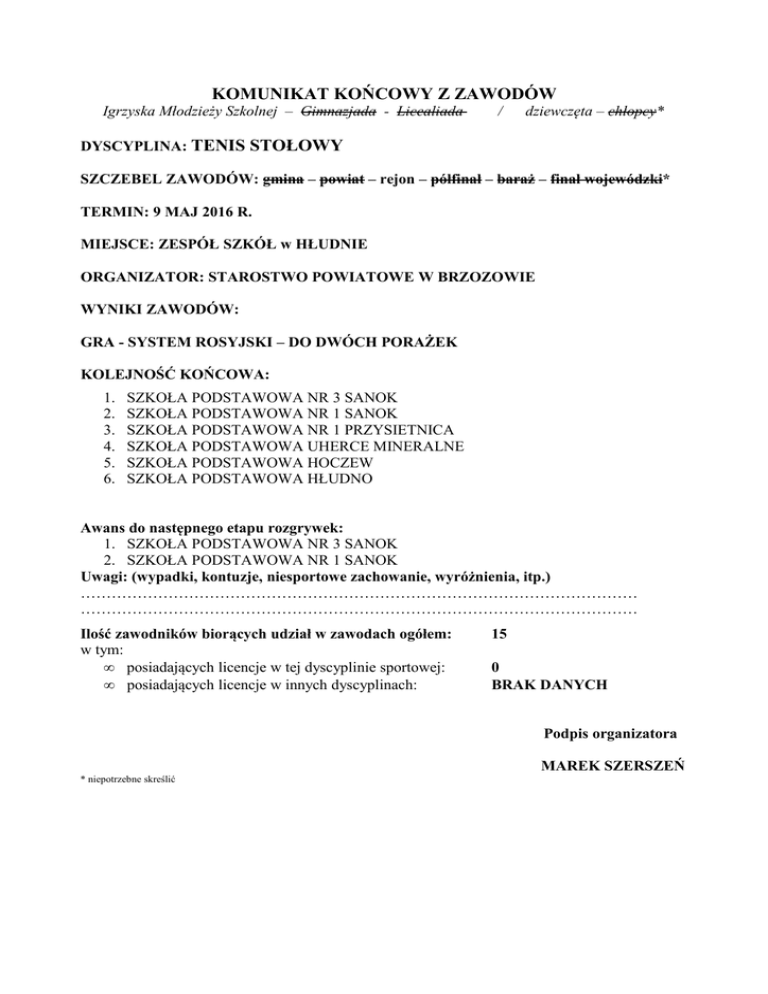 KOMUNIKAT KOŃCOWY Z ZAWODÓW Igrzyska Młodzieży Szkolnej – Gimnazjada - Licealiada / dziewczęta – chłopcy* DYSCYPLINA: TENIS STOŁOWY SZCZEBEL ZAWODÓW: gmina – powiat – rejon – półfinał – baraż – finał wojewódzki* TERMIN: 9 MAJ 2016 R. MIEJSCE: ZESPÓŁ SZKÓŁ w HŁUDNIE ORGANIZATOR: STAROSTWO POWIATOWE W BRZOZOWIE WYNIKI ZAWODÓW: GRA - SYSTEM ROSYJSKI – DO DWÓCH PORAŻEK KOLEJNOŚĆ KOŃCOWA: 1. 2. 3. 4. 5. 6. SZKOŁA PODSTAWOWA NR 3 SANOK SZKOŁA PODSTAWOWA NR 1 SANOK SZKOŁA PODSTAWOWA NR 1 PRZYSIETNICA SZKOŁA PODSTAWOWA UHERCE MINERALNE SZKOŁA PODSTAWOWA HOCZEW SZKOŁA PODSTAWOWA HŁUDNO Awans do następnego etapu rozgrywek: 1. SZKOŁA PODSTAWOWA NR 3 SANOK 2. SZKOŁA PODSTAWOWA NR 1 SANOK Uwagi: (wypadki, kontuzje, niesportowe zachowanie, wyróżnienia, itp.) ……………………………………………………………………………………………… ……………………………………………………………………………………………… Ilość zawodników biorących udział w zawodach ogółem: w tym: • posiadających licencje w tej dyscyplinie sportowej: • posiadających licencje w innych dyscyplinach: 15 0 BRAK DANYCH Podpis organizatora MAREK SZERSZEŃ * niepotrzebne skreślić