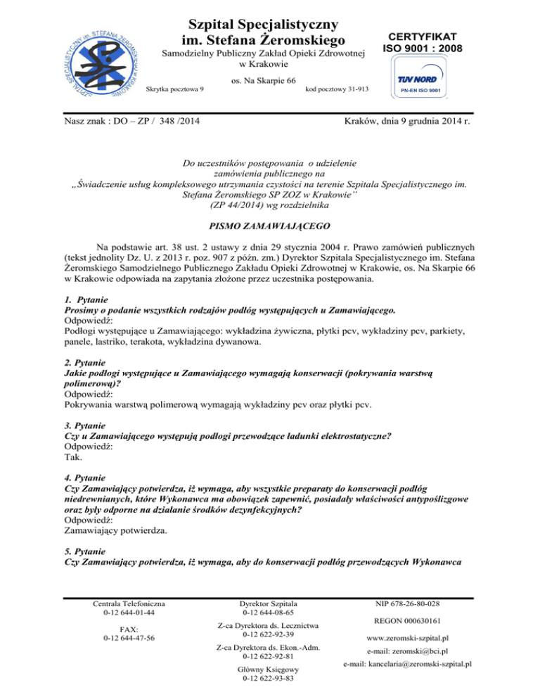 Szpital Specjalistyczny im. Stefana Żeromskiego CERTYFIKAT ISO 9001 : 2008 Samodzielny Publiczny Zakład Opieki Zdrowotnej w Krakowie os. Na Skarpie 66 Skrytka pocztowa 9 kod pocztowy 31-913 Nasz znak : DO – ZP / 348 /2014 Kraków, dnia 9 grudnia 2014 r. Do uczestników postępowania o udzielenie zamówienia publicznego na „Świadczenie usług kompleksowego utrzymania czystości na terenie Szpitala Specjalistycznego im. Stefana Żeromskiego SP ZOZ w Krakowie” (ZP 44/2014) wg rozdzielnika PISMO ZAMAWIAJĄCEGO Na podstawie art. 38 ust. 2 ustawy z dnia 29 stycznia 2004 r. Prawo zamówień publicznych (tekst jednolity Dz. U. z 2013 r. poz. 907 z późn. zm.) Dyrektor Szpitala Specjalistycznego im. Stefana Żeromskiego Samodzielnego Publicznego Zakładu Opieki Zdrowotnej w Krakowie, os. Na Skarpie 66 w Krakowie odpowiada na zapytania złożone przez uczestnika postępowania. 1. Pytanie Prosimy o podanie wszystkich rodzajów podłóg występujących u Zamawiającego. Odpowiedź: Podłogi występujące u Zamawiającego: wykładzina żywiczna, płytki pcv, wykładziny pcv, parkiety, panele, lastriko, terakota, wykładzina dywanowa. 2. Pytanie Jakie podłogi występujące u Zamawiającego wymagają konserwacji (pokrywania warstwą polimerową)? Odpowiedź: Pokrywania warstwą polimerową wymagają wykładziny pcv oraz płytki pcv. 3. Pytanie Czy u Zamawiającego występują podłogi przewodzące ładunki elektrostatyczne? Odpowiedź: Tak. 4. Pytanie Czy Zamawiający potwierdza, iż wymaga, aby wszystkie preparaty do konserwacji podłóg niedrewnianych, które Wykonawca ma obowiązek zapewnić, posiadały właściwości antypoślizgowe oraz były odporne na działanie środków dezynfekcyjnych? Odpowiedź: Zamawiający potwierdza. 5. Pytanie Czy Zamawiający potwierdza, iż wymaga, aby do konserwacji podłóg przewodzących Wykonawca Centrala Telefoniczna 0-12 644-01-44 FAX: 0-12 644-47-56 Dyrektor Szpitala 0-12 644-08-65 Z-ca Dyrektora ds. Lecznictwa 0-12 622-92-39 Z-ca Dyrektora ds. Ekon.-Adm. 0-12 622-92-81 Główny Księgowy 0-12 622-93-83 NIP 678-26-80-028 REGON 000630161 www.zeromski-szpital.pl e-mail: [email protected] e-mail: [email protected] Szpital Specjalistyczny im. Stefana Żeromskiego CERTYFIKAT ISO 9001 : 2008 Samodzielny Publiczny Zakład Opieki Zdrowotnej w Krakowie os. Na Skarpie 66 Skrytka pocztowa 9 kod pocztowy 31-913 zapewnił preparaty profesjonalne, posiadające odpowiednie dopuszczenia do konserwacji tego rodzaju podłóg? Odpowiedź: Zamawiający potwierdza. 6. Pytanie Prosimy o potwierdzenie, iż do czyszczenia sprzętu komputerowego (obudowy, monitory) należy stosować preparaty profesjonalne przeznaczone do tego celu. Odpowiedź: Zamawiający potwierdza. 7. Pytanie Czy u Zamawiającego występują myjnie-dezynfekory do kaczek, basenów itp.? Jeśli tak, prosimy o podanie nazw producentów myjni dezynfektorów występujących w placówkach Zamawiającego. Kto zapewnia preparaty do tych urządzeń? Odpowiedź: Tak u Zamawiającego występują myjnie-dezynfekory do kaczek, basenów itp. Preparaty do urządzeń zapewnia Zamawiający. U Zamawiającego są myjnie następujących producentów: Discher Piccolo 500 PD, TORNADO, EUROMAT. 8. Pytanie Czy do obowiązków Wykonawcy należy ekstrakcyjne pranie żaluzji, rolet, vertikali? Odpowiedź: Tak. 9. Pytanie Czy obowiązkiem Wykonawcy jest zapewnienie tzw. socjalnego zwykłego mydła w płynie? Odpowiedź: Obowiązkiem Wykonawcy jest zapewnienie mydła/ preparatu myjącego do rąk, zgodnie z pkt. III. 3.9 SIWZ. 10. Pytanie Prosimy o potwierdzenie, iż w strefie białej obszaru medycznego w strefach I, III i IV należy stosować preparaty dezynfekcyjne o pełnym spektrum działania, tj. B, Tbc, F, V (Polio), S. Odpowiedź: W strefie białej obszaru medycznego w strefach I, III i IV należy stosować preparaty dezynfekcyjne o pełnym spektrum działania, tj. B, Tbc, F, V (Polio) poszerzone o spektrum działania sporobójczego w przypadku konieczności. 11. Pytanie Prosimy o potwierdzenie, iż w strefie białej obszaru medycznego w strefie II należy stosować preparaty dezynfekcyjne o niskim spektrum działania, tj. B, Tbc, F, V (HIV, HBV, HCV). Odpowiedź: Centrala Telefoniczna 0-12 644-01-44 FAX: 0-12 644-47-56 Dyrektor Szpitala 0-12 644-08-65 Z-ca Dyrektora ds. Lecznictwa 0-12 622-92-39 Z-ca Dyrektora ds. Ekon.-Adm. 0-12 622-92-81 Główny Księgowy 0-12 622-93-83 NIP 678-26-80-028 REGON 000630161 www.zeromski-szpital.pl e-mail: [email protected] e-mail: [email protected] Szpital Specjalistyczny im. Stefana Żeromskiego CERTYFIKAT ISO 9001 : 2008 Samodzielny Publiczny Zakład Opieki Zdrowotnej w Krakowie os. Na Skarpie 66 Skrytka pocztowa 9 kod pocztowy 31-913 W strefie białej obszaru medycznego w strefie II należy stosować preparaty dezynfekcyjne o spektrum działania, tj. B, Tbc, F, V (HIV, HBV, HCV) poszerzone o spektrum działania sporobójczego w przypadku konieczności (sale chorych). 12. Pytanie Prosimy o potwierdzenie, iż w strefie szarej należy stosować preparaty dezynfekcyjne o niskim spektrum działania, tj. B, Tbc, F, V (HIV, HBV, HCV). Odpowiedź: W strefie szarej należy stosować preparaty dezynfekcyjne o niskim spektrum działania, tj. B, F, V (HIV, HBV, HCV) w odniesieniu do wybranych pomieszczeń i potrzeb. 13. Pytanie Czy do obowiązków Wykonawcy należy odkamienianie urządzeń sanitarnych i armatury i zapewnienie środków niezbędnych do wykonania tej czynności? Odpowiedź: Tak. 14. Pytanie Czy do obowiązków Wykonawcy należy udrażniania odpływów kanalizacyjnych i zapewnienie środków niezbędnych do wykonania tej czynności? Odpowiedź: Nie. 15. Pytanie Prosimy o potwierdzenie, iż do oferty przetargowej należy dołączyć wykaz wszystkich środków (dezynfekcyjnych, myjących, czyszczących, konserwujących itp.) niezbędnych do realizacji zamówienia celem weryfikacji czy usługa będzie wykonywana preparatami odpowiednio dobranymi do danej powierzchni? Odpowiedź: Do oferty na