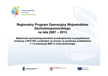 Regionalny Program Operacyjny Województwa Zachodniopomorskiego na lata 2007 – 2013 Aktywność zachodniopomorskich przedsiębiorstw w pozyskiwaniu funduszy z RPO WZ z podziałem na branŜe na podstawie poddziałania 1.1.3 Inwestycje MSP w nowe technologie RPO WZ a innowacyjność W ramach RPO WZ wyróŜniamy 3 poddziałania skierowane na dofinansowanie inwestycji zachodniopomorskich przedsiębiorców, w których innowacyjność wymagana jest w mniejszym, bądź w większym stopniu. Realizowane przez zachodniopomorskie przedsiębiorstwa inwestycje wspierane w ramach RPO WZ powinny cechować się innowacyjnością. Nie we wszystkich poddziałaniach Programu jest ona jednak kryterium dostępowym. RPO WZ a innowacyjność W ramach Poddziałania 1.1.1 Inwestycje w mikroprzedsiębiortswa oraz 1.1.2 Inwestycje w małe i średnie przedsiębiorstwa innowacyjność wymagana jest na poziomie przedsiębiorstwa. Brak innowacyjności wykraczającej poza poziom przedsiębiorstwa skutkuje wyłącznie niską punktacją, nie zaś odrzuceniem projektu. Poddziałaniem w ramach którego wymagania co do innowacyjności są wyŜsze jest Poddziałanie 1.1.3 Inwestycje MSP w nowe technologie – w ramach tego poddziałania innowacyjność na poziomie przedsiębiorstwa lub w skali lokalnej nie jest wystarczająca. JuŜ na etapie oceny formalnej weryfikowane jest, czy Wnioskodawca złoŜył obowiązkowy dokument – Opinię o innowacyjności dotyczącą wdraŜanej w ramach projektu technologii. Na ocenie merytorycznej punktowana jest skala od poziomu regionalnego do poziomu międzynarodowego. Czym jest innowacyjność? Definicja innowacyjności została określona jako zdolność przedsiębiorstw do tworzenia i wdraŜania innowacji oraz faktyczna umiejętność wprowadzania nowych i zmodernizowanych wyrobów, nowych lub zmienionych procesów technologicznych lub organizacyjno – technicznych. WyróŜniamy róŜne typy innowacji ze względu na jej zasięg oraz profil: • zasięg – podstawowym warunkiem uzyskania wsparcia w ramach RPO jest innowacyjność wprowadzana na poziomie przedsiębiorstwa (dotyczy poddziałania 1.1.1 i 1.1.2) – jest to zmiana w stosunku do stanu na dzień złoŜenia wniosku, W zaleŜności o tego, czy innowacja dotyczy rynku lokalnego, regionalnego, krajowego, bądź międzynarodowego projekt otrzymuje odpowiednią wysokość punktów podczas oceny merytorycznej. • profil: procesowa, bądź produktowa. Czym jest innowacyjność? Innowacja produktowa – wprowadzenie na rynek przez dane przedsiębiorstwo nowego produktu lub usługi, lub znaczące ulepszenie oferowanych uprzednio produktów lub usług w odniesieniu do ich charakterystyk lub przeznaczenia. Innowacja procesowa – przyjęcie technologicznie nowych lub znacząco udoskonalonych metod wytwarzania lub świadczenia usług, w tym sposobów docierania z produktem do odbiorców. Celem tych metod moŜe teŜ być zwiększenie efektywności produkcji lub dostarczania istniejących produktów. Jakie są cele dotacji na wdroŜenie nowych technologii? W ramach poddziałania 1.1.3 Inwestycje MSP w nowe technologie wspierane są innowacyjne projekty inwestycyjne zlokalizowane na terenie województwa zachodniopomorskiego, które mają na celu wdroŜenie w przedsiębiorstwie nowych technologii niestosowanych na świecie dłuŜej niŜ 5 lat, umoŜliwiających wytwarzanie nowych lub znacząco ulepszonych produktów, procesów lub usług. Maksymalna wartość dofinansowania, jaką moŜna przeznaczyć na wdroŜenie nowej technologii wynosi 4 mln zł. Jakie są cele dotacji na wdroŜenie nowych technologii? Innowacyjne projekty inwestycyjne, to projekty związane z inwestycją technologiczną zakładające wdroŜenie nowej technologii, rozumianej jako wiedza technologiczna w postaci środków trwałych, wartości niematerialnych i prawnych, wyników badań naukowych, usług badawczo-rozwojowych. Spełnienie powyŜszego warunku musi zostać potwierdzone Opinią o innowacyjności. Dokument ten musi być sporządzony zgodnie ze wzorem oraz musi być wystawiony przez jednostkę naukową w rozumieniu art. 2, pkt 9 z wyłączeniem lit.g ustawy z dnia 8 października 2004 r. o zasadach finansowania nauki (Dz. U. Nr 238, poz. 2390z późn. zmianami) tj: jednostkę naukową - prowadzącą w sposób ciągły badania naukowe lub prace rozwojowe. Jakie są cele dotacji na wdroŜenie nowych technologii? W ramach RPO WZ odbyły się dwa konkursy skierowane stricte na wdroŜenie nowych technologii – w roku 2009 i 2010. - Konkurs RPOWZ/1.1.3/2009/1 W terminie naboru wpłynęło 88 wniosków. Do dofinansowania rekomendowanych zostało 67 projektów, którym przyznano dotację w wysokości 109 277 010,63 zł. - Konkurs RPOWZ/1.1.3/2010/1 W terminie naboru wpłynęło 138 wniosków. Z 78 projektów rekomendowanych do Dofinansowania - dotacja została udzielona 10 projektom na kwotę 24 004 748,49 zł. Łączna wartość dofinansowania z RPO WZ projektów rekomendowanych do dofinansowania w obu konkursach wynosi 218 875 408,88 zł. Jak oceniana jest innowacyjność? Innowacyjny charakter projektu oceniany jest przez Ekspertów na etapie oceny merytoryczno – technicznej. W ramach tego kryterium projekt moŜe uzyskać maksymalnie 24 punkty (na 60 punktów moŜliwych w ramach oceny). Pozytywna ocena na etapie oceny merytoryczno – technicznej oznacza, Ŝe projekt otrzymał co najmniej 50% ogólnej sumy punktów (30 punktów). Do dofinansowania rekomendowane są projekty, które uzyskały co najmniej 50% maksymalnej liczby punktów na etapie oceny ekonomiczno – finansowej oraz merytoryczno - technicznej (50 punktów). W sytuacji kiedy technologia wdraŜana w ramach projektu pozwoli na wprowadzenie w przedsiębiorstwie innowacji produktowej/bądź procesowej Ekspert przydziela następującą ilość punktów ze względu na jej skalę: • skala międzynarodowa - od 12 do 16 pkt; • skala krajowa – od 7 do 11 pkt; • skala regionalna - do 6 pkt. • skala