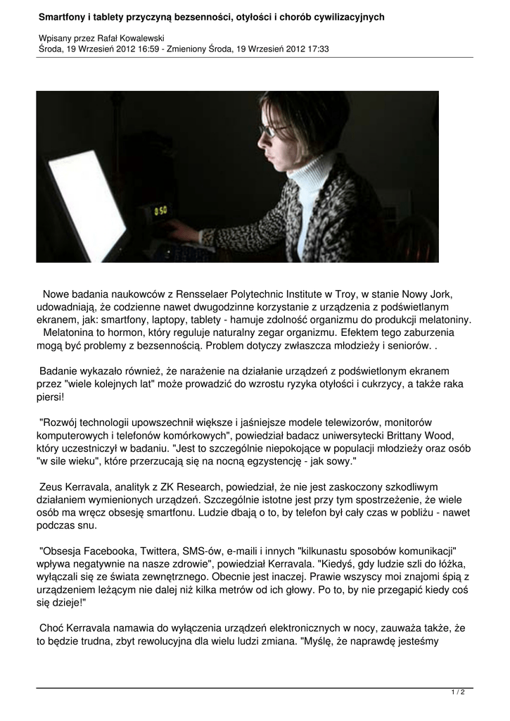 Smartfony i tablety przyczyną bezsenności, otyłości i chorób cywilizacyjnych Wpisany przez Rafał Kowalewski Środa, 19 Wrzesień 2012 16:59 - Zmieniony Środa, 19 Wrzesień 2012 17:33 Nowe badania naukowców z Rensselaer Polytechnic Institute w Troy, w stanie Nowy Jork, udowadniają, że codzienne nawet dwugodzinne korzystanie z urządzenia z podświetlanym ekranem, jak: smartfony, laptopy, tablety - hamuje zdolność organizmu do produkcji melatoniny. Melatonina to hormon, który reguluje naturalny zegar organizmu. Efektem tego zaburzenia mogą być problemy z bezsennością. Problem dotyczy zwłaszcza młodzieży i seniorów. . Badanie wykazało również, że narażenie na działanie urządzeń z podświetlonym ekranem przez "wiele kolejnych lat" może prowadzić do wzrostu ryzyka otyłości i cukrzycy, a także raka piersi! "Rozwój technologii upowszechnił większe i jaśniejsze modele telewizorów, monitorów komputerowych i telefonów komórkowych", powiedział badacz uniwersytecki Brittany Wood, który uczestniczył w badaniu. "Jest to szczególnie niepokojące w populacji młodzieży oraz osób "w sile wieku", które przerzucają się na nocną egzystencję - jak sowy." Zeus Kerravala, analityk z ZK Research, powiedział, że nie jest zaskoczony szkodliwym działaniem wymienionych urządzeń. Szczególnie istotne jest przy tym spostrzeżenie, że wiele osób ma wręcz obsesję smartfonu. Ludzie dbają o to, by telefon był cały czas w pobliżu - nawet podczas snu. "Obsesja Facebooka, Twittera, SMS-ów, e-maili i innych "kilkunastu sposobów komunikacji" wpływa negatywnie na nasze zdrowie", powiedział Kerravala. "Kiedyś, gdy ludzie szli do łóżka, wyłączali się ze świata zewnętrznego. Obecnie jest inaczej. Prawie wszyscy moi znajomi śpią z urządzeniem leżącym nie dalej niż kilka metrów od ich głowy. Po to, by nie przegapić kiedy coś się dzieje!" Choć Kerravala namawia do wyłączenia urządzeń elektronicznych w nocy, zauważa także, że to będzie trudna, zbyt rewolucyjna dla wielu ludzi zmiana. "Myślę, że naprawdę jesteśmy 1/2 Smartfony i tablety przyczyną bezsenności, otyłości i chorób cywilizacyjnych Wpisany przez Rafał Kowalewski Środa, 19 Wrzesień 2012 16:59 - Zmieniony Środa, 19 Wrzesień 2012 17:33 uzależnieni," zauważył. "Smartfon wciąga jak narkotyk. Im częściej go używasz, tym bardziej go potrzebujesz." Abstrahując od psychologicznej warstwy opisywanego problemu, naukowcy z Uniwersytetu w Troy wyrazili nadzieję, że są producenci urządzeń będą wykorzystają wyniki badań do zmiany oświetlenia w ekranach swoich urządzeniach. Źródło: ComputerWorld, HotHardware 2/2