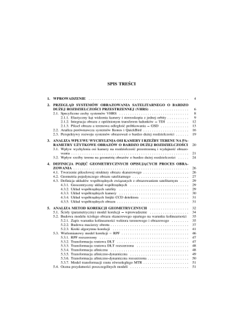 SPIS TREŚCI 1. WPROWADZENIE . . . . . . . . . . . . . . . . . . . . . . . . . . . . . . . . . . . . . . . . . . . . . . 4 2. PRZEGLA˛D SYSTEMÓW OBRAZOWANIA SATELITARNEGO O BARDZO DUŻEJ ROZDZIELCZOŚCI PRZESTRZENNEJ (VHRS) . . . . . . . . . . . . . . . . . . 2.1. Specyficzne cechy systemów VHRS . . . . . . . . . . . . . . . . . . . . . . . . . . . . . . . . 2.1.1. Elastyczny ka˛t widzenia kamery i stereoskopia z jednej orbity . . . . . . . . . . 2.1.2. Integracja obrazu z opóźnionym transferem ładunków TDI . . . . . . . . . . 2.1.3. Piksel obrazu a terenowa odległość próbkowania GSD . . . . . . . . . . . . . 2.2. Analiza porównawcza systemów Ikonos i QuickBird . . . . . . . . . . . . . . . . . . . . . 2.3. Perspektywy rozwoju systemów obrazowań o bardzo dużej rozdzielczości . . . . . . 6 8 9 12 13 16 19 3. ANALIZA WPŁYWU WYCHYLENIA OSI KAMERY I RZEŹBY TERENU NA PARAMETRY UŻYTKOWE OBRAZÓW O BARDZO DUŻEJ ROZDZIELCZOŚCI 3.1. Wpływ wychylenia osi kamery na rozdzielczość przestrzenna˛ i wydajność obrazowania . . . . . . . . . . . . . . . . . . . . . . . . . . . . . . . . . . . . . . . . . . . . . . . . . . . . . . 3.2. Wpływ rzeźby terenu na geometrie˛ obrazów o bardzo dużej rozdzielczości . . . . . 21 24 4. DEFINICJA POJE˛Ć GEOMETRYCZNYCH OPISUJA˛CYCH PROCES OBRAZOWANIA . . . . . . . . . . . . . . . . . . . . . . . . . . . . . . . . . . . . . . . . . . . . . . . . . . . . . 4.1. Tworzenie pikselowej struktury obrazu skanerowego . . . . . . . . . . . . . . . . . . . . . 4.2. Geometria pojedynczego obrazu satelitarnego . . . . . . . . . . . . . . . . . . . . . . . . . . 4.3. Definicja układów współrze˛dnych zwia˛zanych z obrazowaniem satelitarnym . . . . 4.3.1. Geocentryczny układ współrze˛dnych . . . . . . . . . . . . . . . . . . . . . . . . . . . 4.3.2. Układ współrze˛dnych satelity . . . . . . . . . . . . . . . . . . . . . . . . . . . . . . . . 4.3.3. Układ współrze˛dnych kamery . . . . . . . . . . . . . . . . . . . . . . . . . . . . . . . . 4.3.4. Układ współrze˛dnych linijki CCD detektora . . . . . . . . . . . . . . . . . . . . . . 4.3.5. Układ współrze˛dnych obrazu . . . . . . . . . . . . . . . . . . . . . . . . . . . . . . . . . 26 26 27 29 29 29 30 31 31 5. ANALIZA METOD KOREKCJI GEOMETRYCZNYCH . . . . . . . . . . . . . . . . . . 5.1. Ścisły (parametryczny) model korekcji wprowadzenie . . . . . . . . . . . . . . . . . . 5.2. Budowa modelu ścisłego obrazu skanerowego opartego na warunku kolinearności 5.2.1. Zapis warunku kolinearności wektora terenowego i obrazowego . . . . . . . . 5.2.2. Budowa macierzy obrotu . . . . . . . . . . . . . . . . . . . . . . . . . . . . . . . . . . . . 5.2.3. Kroki algorytmu korekcji . . . . . . . . . . . . . . . . . . . . . . . . . . . . . . . . . . . 5.3. Wielomianowy model korekcji RPF . . . . . . . . . . . . . . . . . . . . . . . . . . . . . . . 5.3.1. RPF rozszerzony . . . . . . . . . . . . . . . . . . . . . . . . . . . . . . . . . . . . . . . . . 5.3.2. Transformacja rzutowa DLT . . . . . . . . . . . . . . . . . . . . . . . . . . . . . . . . . 5.3.3. Transformacja rzutowa DLT rozszerzona . . . . . . . . . . . . . . . . . . . . . . . . 5.3.4. Transformacja afiniczna . . . . . . . . . . . . . . . . . . . . . . . . . . . . . . . . . . . . 5.3.5. Transformacja afiniczno-dynamiczna . . . . . . . . . . . . . . . . . . . . . . . . . . . 5.3.6. Transformacja afiniczno-dynamiczna rozszerzona . . . . . . . . . . . . . . . . . . . 5.3.7. Model transformacji rzutu równoległego MTR . . . . . . . . . . . . . . . . . . . . . 5.4. Ocena przydatności poszczególnych modeli . . . . . . . . . . . . . . . . . . . . . . . . . . . 32 34 35 35 37 41 46 47 47 48 48 49 50 51 51 20 Spis treści 6. KOREKCJA GEOMETRYCZNA OBRAZÓW SATELITARNYCH O DUŻEJ ROZDZIELCZOŚCI PRACE EKSPERYMENTALNE . . . . . 6.1. Wybór pól testowych . . . . . . . . . . . . . . . . . . . . . . . . . . . . . . . . . . . 6.2. Ortorektyfikacja scen satelitarnych metodyka i narze˛dzia . . . . . . . . 6.3. Projektowanie fotopunktów i punktów kontrolnych . . . . . . . . . . . . . . 6.4. Terenowy pomiar współrze˛dnych fotopunktów . . . . . . . . . . . . . . . . . 6.5. Wnioski wynikaja˛ce z wyboru i pomiaru fotopunktów . . . . . . . . . . . . 6.6. Numeryczne modele terenu wykorzystane do ortorektyfikacji . . . . . . . 6.7. Ortorektyfikacja i generowanie cyfrowych ortofotomap . . . . . . . . . . . 6.8. Wytwarzanie barwnych kompozycji „wyostrzonych” (Pan-sharpened) . 113 BARDZO ........ ........ ........ ........ ........ ........ ........ ........ ........ 7. ANALIZA CZYNNIKÓW DETERMINUJA˛CYCH DOKŁADNOŚĆ ORTOREKTYFIKACJI OBRAZÓW IKONOS I QUICKBIRD . . . . . . . . . . . . . . . . . . . . . . . 7.1. Badanie wpływu osnowy i modeli korekcyjnych na dokładność ortorektyfikacji . . 7.2. Badanie wpływu jakości NMT na dokładność ortorektyfikacji . . . . . . . . . . . . . . 7.3. Badanie możliwości wytworzenia ortofotomap z obrazów pozyskanych z układu optycznego o dużym ka˛cie wychylenia . . . . . . . . . . . . . . . . . . . . . . . . . . . . . . . 7.4. Ocena korekcji geometrycznej obrazów Ikonos i QuickBird . . . . . . . . . . . . . . . . 8. OCENA MOŻLIWOŚCI TWORZENIA BAZY DANYCH TOPOGRAFICZNYCH NA PODSTAWIE OBRAZÓW SATELITARNYCH O BARDZO DUŻEJ ROZDZIELCZOŚCI . . . . . . . . . . . . . . . . . . . . . . . . . . . . . . . . . . . . . . . . . . . . . . . . . 8.1. Cel i sformułowanie zakresu badań . . . . . . . . . . . . . . . . . . . . . . . . . . . . . . . . . 8.2. Krytyczny przegla˛d publikacji dotycza˛cych tematyki wykorzystania obrazów o bardzo dużej rozdzielczości do tworzenia wektorowych baz danych topograficznych . . . . . . . . . . . . . . . . . . . . . . . . . . . . . . . . . . . . . . . . . . . . . . . . . . . . . . 8.3. Metodyka weryfikacji potencjału interpretacyjnego obrazów o bardzo dużej rozdzielczości . . . . . . . . . . . . . . . . . . . . . . . . . . . . . . . . . . . . . . . . . . 