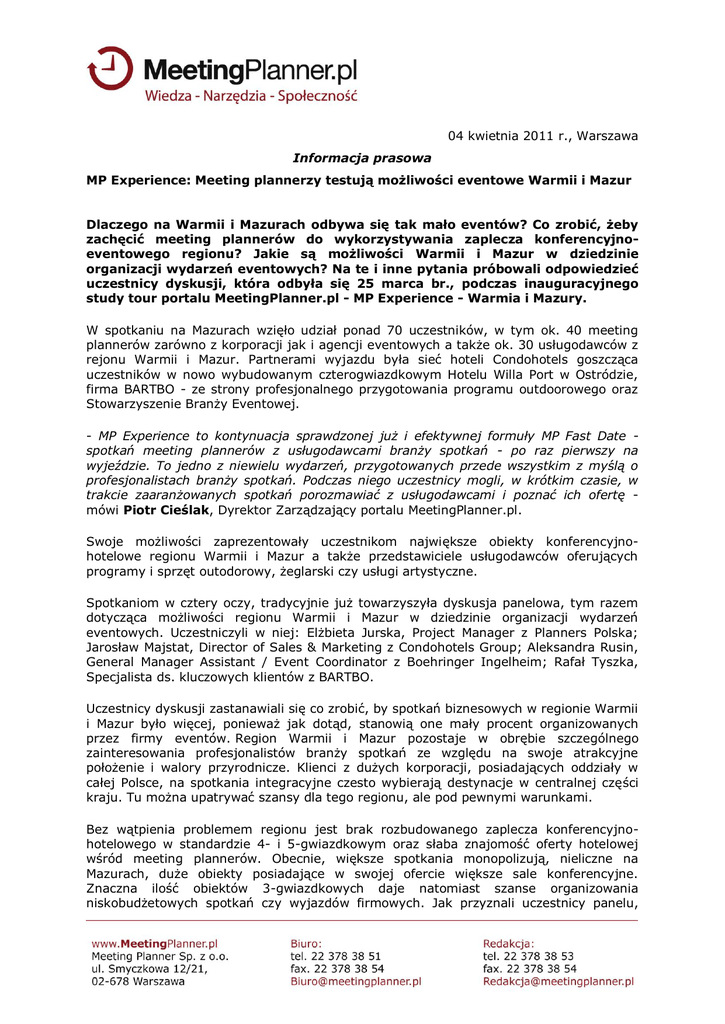 04 kwietnia 2011 r., Warszawa Informacja prasowa MP Experience