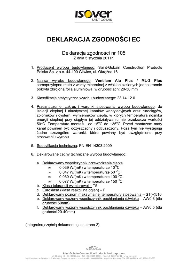 DEKLARACJA ZGODNOŚCI EC Deklaracja zgodności nr 105 Z dnia 5 stycznia 2011r. 1. Producent wyrobu budowlanego: Saint-Gobain Construction Products Polska Sp. z o.o. 44-100 Gliwice, ul. OkręŜna 16 2. Nazwa wyrobu budowlanego: Ventilam Alu Plus / ML-3 Plus samoprzylepna mata z wełny mineralnej z włókien szklanych jednostronnie pokryta zbrojoną folią aluminiową; w grubościach: 20-50 mm 3. Klasyfikacja statystyczna wyrobu budowlanego: 23.14.12.0 4. Przeznaczenie, zakres i warunki stosowania wyrobu budowlanego: do izolacji cieplnej i akustycznej kanałów wentylacyjnych oraz rurociągów, zbiorników i cystern, wymienników ciepła, w których temperatura nośnika energii cieplnej przy ciągłym jej oddziaływaniu nie przekracza wartości 500C. Temperatura montaŜu: od +50C do +350C. Przed montaŜem maty kanał powinien być oczyszczony i odtłuszczony. Poza tym nie występują Ŝadne szczególne warunki, które powinny być uwzględnione przy stosowaniu wyrobu. 5. Specyfikacja techniczna: PN-EN 14303:2009 6. Deklarowane cechy techniczne wyrobu budowlanego: a. Deklarowany współczynnik przewodzenia ciepła • 0,039 W/(mK) w temperaturze 10OC • 0,047 W/(mK) w temperaturze 50 OC • 0,060 W/(mK) w temperaturze 100 OC • 0,077 W/(mK) w temperaturze 150 OC b. Klasa tolerancji wymiarowej – T5 c. Euroklasa (klasa reakcji na ogień) – F d. Deklarowany poziom maksymalnej temperatury stosowania – ST(+)510 e. Deklarowany waŜony współczynnik pochłaniania dźwięku – AW0,8 (dla grubości 50mm) f. Deklarowany waŜony współczynnik pochłaniania dźwięku – AW0,5 (dla grubości 20-40mm) (integralną częścią dokumentu jest strona 2) Saint-Gobain Construction Products Polska sp. z o.o. Ul. OkręŜna 16 • 44-100 Gliwice • Tel. +48 32 339 63 00 • Faks +48 32 339 64 44 • www.isover.pl Sąd Rejonowy w Gliwicach, X Wydział Gospodarczy pod numerem KRS: 0000086064 • Kapitał zakładowy: 314 627 500 PLN • NIP: 522-01-01-585 Nazwa produktu Długość „a” Szerokość [mm] „b” [mm] Grubość „c” [mm] Ventilam Alu Plus/ ML-3 12000 1000 20 Ventilam Alu Plus/ ML-3 8000 1000 30 Ventilam Alu Plus/ ML-3 6000 1000 40 Ventilam Alu Plus/ ML-3 5000 1000 50 Deklaruję z pełną odpowiedzialnością, Ŝe wyrób budowlany jest zgodny ze specyfikacją techniczną wskazaną w pkt. 5 Deklaruję, Ŝe wyrób spełnia postanowienia załącznika ZA PN-EN 14303.2009 Gliwice 05/01/2011 Henryk Kwapisz MenadŜer Biura Informacji Technicznej Isover&Rigips Saint-Gobain Construction Products Polska sp. z o.o. Ul. OkręŜna 16 • 44-100 Gliwice • Tel. +48 32 339 63 00 • Faks +48 32 339 64 44 • www.isover.pl Sąd Rejonowy w Gliwicach, X Wydział Gospodarczy pod numerem KRS: 0000086064 • Kapitał zakładowy: 314 627 500 PLN • NIP: 522-01-01-585