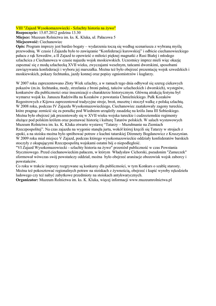 VIII "Zajazd Wysokomazowiecki - Szlachty historia na żywo" Rozpoczęcie: 15.07.2012 godzina 13.30 Miejsce: Muzeum Rolnictwa im. ks. K. Kluka, ul. Pałacowa 5 Miejscowość: Ciechanowiec Opis: Program imprezy jest bardzo bogaty – wydarzenia toczą się według scenariusza z wybraną myślą przewodnią. W czasie I Zajazdu było to zawiązanie “Konfederacji kurowskiej” i odbicie ciechanowieckiego pałacu z rąk Szwedów, a II Zajazd to opowieść o miłości pięknej magnatki z Rusi Białej i młodego szlachcica z Ciechanowca w czasie najazdu wojsk moskiewskich. Uczestnicy imprez mieli więc okazję zapoznać się z modą szlachecką XVII wieku, zwyczajami weselnym, tańcami dworskimi, sposobami zawiązywania konfederacji i wyboru jej marszałka. Można też było obejrzeć prezentację wojsk szwedzkich i moskiewskich, pokazy fechtunku, jazdy konnej oraz popisy ogniomistrzów i kuglarzy. W 2007 roku zaprezentowano Złoty Wiek szlachty, a w ramach tego dnia odbywał się szereg ciekawych pokazów (m.in. fechtunku, mody, strzelania z broni palnej, tańców szlacheckich i dworskich), występów, konkursów dla publiczności oraz inscenizacji o charakterze historycznym. Główną atrakcją festynu był wymarsz wojsk ks. Janusza Radziwiłła na Kozaków z powstania Chmielnickiego. Pułk Kozaków Regestrowych z Kijowa zaprezentował tradycyjne stroje, broń, musztrę i stoczył walkę z polską szlachtą. W 2008 roku, podczas IV Zajazdu Wysokomazowieckiego, Ciechanowiec zaatakowały zagony tureckie, które pragnąc zemścić się za porażkę pod Wiedniem urządziły zasadzkę na króla Jana III Sobieskiego. Można było obejrzeć jak prezentowały się w XVII wieku wojska tureckie i cudzoziemskie regimenty służące pod polskim królem oraz poznawać historię i kulturę Tatarów polskich. W salach wystawowych Muzeum Rolnictwa im. ks. K. Kluka otwarto wystawę “Tatarzy – Muzułmanie na Ziemiach Rzeczpospolitej”. Na czas zajazdu na wygonie stanęła jurta, wokół której kręcili się Tatarzy w strojach z epoki, a na stoisku można było spróbować potraw z kuchni tatarskiej Dżennety Bogdanowicz z Kruszynian. W 2009 roku miał miejsce V Zajazd, podczas którego wysokomazowieckie oddziały konfederatów barskich stoczyły z okupującymi Rzeczpospolitą wojskami ostatni bój o niepodległość. "VI Zajazd Wysokomazowiecki - szlachty historia na żywo" przeniósł publiczność w czas Powstania Styczniowego. Przed ciechanowieckim pałacem, w którym Władysław Cichorski, pseudonim "Zameczek" sformował wówczas swój powstańczy oddział, można było obejrzeć aranżacje obozowisk wojsk zaborcy i powstańców. Co roku w trakcie imprezy rozgrywane są konkursy dla publiczności, w tym Konkurs o szablę starosty. Można też pokosztować regionalnych potraw na stoiskach z żywnością, obejrzeć i kupić wyroby rękodzieła ludowego czy też nabyć zabytkowe przedmioty na stoiskach antykwarycznych. Organizator: Muzeum Rolnictwa im. ks. K. Kluka, więcej informacji www.muzeumrolnictwa.pl