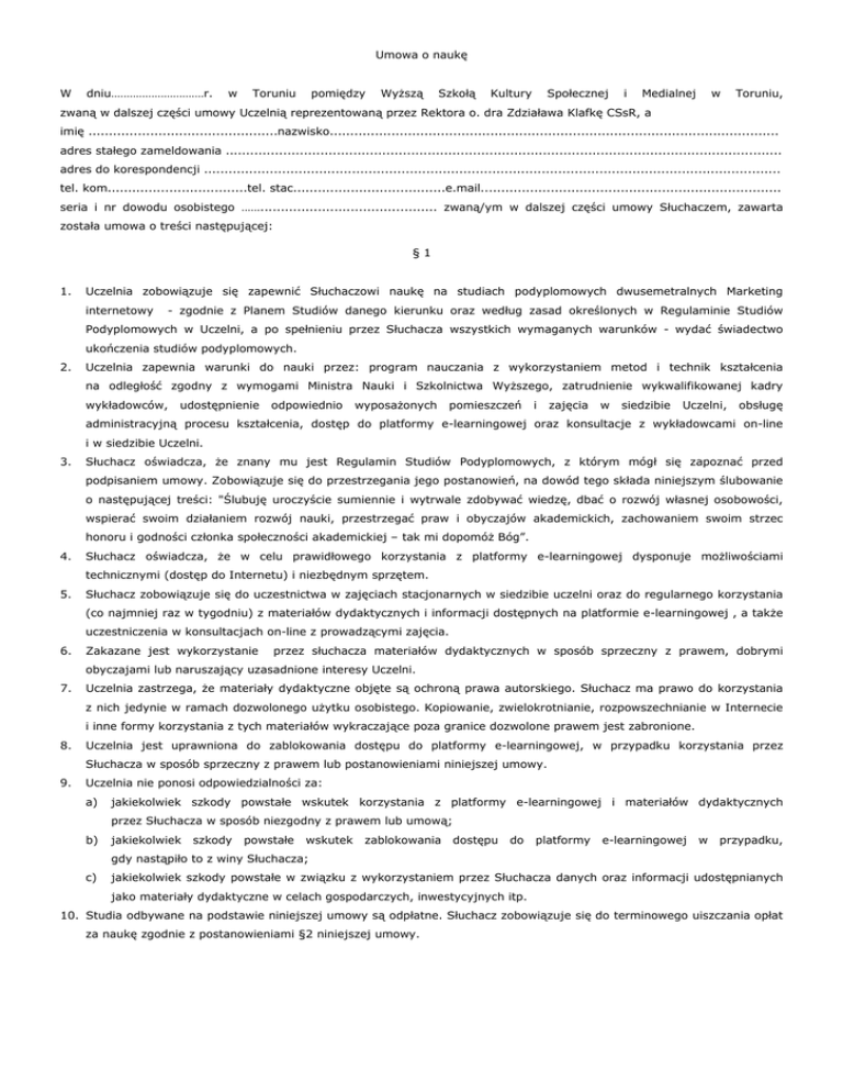 Umowa o naukę W dniu…………………………r. w Toruniu pomiędzy Wyższą Szkołą Kultury Społecznej i Medialnej w Toruniu, zwaną w dalszej części umowy Uczelnią reprezentowaną przez Rektora o. dra Zdziaława Klafkę CSsR, a imię ..............................................nazwisko............................................................................................................. adres stałego zameldowania ....................................................................................................................................... adres do korespondencji ............................................................................................................................................ tel. kom..................................tel. stac.....................................e.mail......................................................................... seria i nr dowodu osobistego ……........................................... zwaną/ym w dalszej części umowy Słuchaczem, zawarta została umowa o treści następującej: §1 1. Uczelnia zobowiązuje się zapewnić Słuchaczowi naukę na studiach podyplomowych dwusemetralnych Marketing internetowy - zgodnie z Planem Studiów danego kierunku oraz według zasad określonych w Regulaminie Studiów Podyplomowych w Uczelni, a po spełnieniu przez Słuchacza wszystkich wymaganych warunków - wydać świadectwo ukończenia studiów podyplomowych. 2. Uczelnia zapewnia warunki do nauki przez: program nauczania z wykorzystaniem metod i technik kształcenia na odległość zgodny z wymogami Ministra Nauki i Szkolnictwa Wyższego, zatrudnienie wykwalifikowanej kadry wykładowców, udostępnienie odpowiednio wyposażonych pomieszczeń i zajęcia w siedzibie Uczelni, obsługę administracyjną procesu kształcenia, dostęp do platformy e-learningowej oraz konsultacje z wykładowcami on-line i w siedzibie Uczelni. 3. Słuchacz oświadcza, że znany mu jest Regulamin Studiów Podyplomowych, z którym mógł się zapoznać przed podpisaniem umowy. Zobowiązuje się do przestrzegania jego postanowień, na dowód tego składa niniejszym ślubowanie o następującej treści: "Ślubuję uroczyście sumiennie i wytrwale zdobywać wiedzę, dbać o rozwój własnej osobowości, wspierać swoim działaniem rozwój nauki, przestrzegać praw i obyczajów akademickich, zachowaniem swoim strzec honoru i godności członka społeczności akademickiej – tak mi dopomóż Bóg”. 4. Słuchacz oświadcza, że w celu prawidłowego korzystania z platformy e-learningowej dysponuje możliwościami technicznymi (dostęp do Internetu) i niezbędnym sprzętem. 5. Słuchacz zobowiązuje się do uczestnictwa w zajęciach stacjonarnych w siedzibie uczelni oraz do regularnego korzystania (co najmniej raz w tygodniu) z materiałów dydaktycznych i informacji dostępnych na platformie e-learningowej , a także uczestniczenia w konsultacjach on-line z prowadzącymi zajęcia. 6. Zakazane jest wykorzystanie przez słuchacza materiałów dydaktycznych w sposób sprzeczny z prawem, dobrymi obyczajami lub naruszający uzasadnione interesy Uczelni. 7. Uczelnia zastrzega, że materiały dydaktyczne objęte są ochroną prawa autorskiego. Słuchacz ma prawo do korzystania z nich jedynie w ramach dozwolonego użytku osobistego. Kopiowanie, zwielokrotnianie, rozpowszechnianie w Internecie i inne formy korzystania z tych materiałów wykraczające poza granice dozwolone prawem jest zabronione. 8. Uczelnia jest uprawniona do zablokowania dostępu do platformy e-learningowej, w przypadku korzystania przez 9. Uczelnia nie ponosi odpowiedzialności za: Słuchacza w sposób sprzeczny z prawem lub postanowieniami niniejszej umowy. a) jakiekolwiek szkody powstałe wskutek korzystania z platformy e-learningowej i materiałów dydaktycznych b) jakiekolwiek przez Słuchacza w sposób niezgodny z prawem lub umową; szkody powstałe wskutek zablokowania dostępu do platformy e-learningowej w przypadku, gdy nastąpiło to z winy Słuchacza; c) jakiekolwiek szkody powstałe w związku z wykorzystaniem przez Słuchacza danych oraz informacji udostępnianych jako materiały dydaktyczne w celach gospodarczych, inwestycyjnych itp. 10. Studia odbywane na podstawie niniejszej umowy są odpłatne. Słuchacz zobowiązuje się do terminowego uiszczania opłat za naukę zgodnie z postanowieniami §2 niniejszej umowy. §2 1. Opłata ze semestr nauki wynosi 1700 zł. 2. Opłata za powtarzanie semestru wynosi 1700 zł ( w przypadku powtarzania 3 i więcej przedmiotów) lub 800 zł ( w przypadku powtarzania dwóch przedmiotów) lub 400 zł ( przypadku powtarzania jednego przedmiotu). 3. Uczelnia nie pobiera opłat za rejestrację na kolejny semestr lub rok studiów, egzaminy, w tym egzamin poprawkowy, egzamin komisyjny, egzamin dyplomowy, wydanie dziennika praktyk zawodowych, złożenie i ocenę pracy dyplomowej. Jedyną opłatą – oprócz czesnego – jest opłata w wysokości 30 zł za wydanie dyplomu. 4. Słuchacze wnoszący semestralne opłaty za studia jednorazowo, w pełnej wysokości, uiszczają je w następujących terminach: za semestr zimowy – do 30 września 2015r. lub w terminie do 3 dni przed rozpoczęciem zajęć, za semestr letni – do 28 lutego 2016r. 5. W drugim semestrze studiów istnieje możliwość wniesienia opłaty w ratach w następujących częściach i terminach: za semestr letni: 6. a) I rata w wysokości 50 proc. – do 28 lutego b) II rata w wysokości 50 proc. – do 15 kwietnia Opłaty wynikające z niniejszej umowy Słuchacz wnosi na konto bankowe Uczelni, podane do jego wiadomości wraz z przyjęciem na studia. 7. Słuchacz zobowiązany jest do okazania dowodu wpłaty na wezwanie upoważnionych pracowników Uczelni. 8. Za datę uiszczenia opłaty uważa się datę wpływu zapłaconej kwoty na konto bankowe Uczelni. 9. W razie zaległości w regulowaniu opłat wg zasad powyżej określonych w §2 Uczelnia może nie dopuścić Słuchacza d