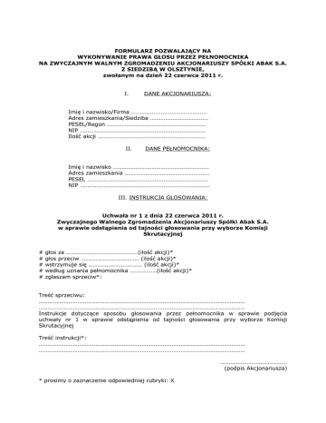 FORMULARZ POZWALAJĄCY NA WYKONYWANIE PRAWA GŁOSU PRZEZ PEŁNOMOCNIKA NA ZWYCZAJNYM WALNYM ZGROMADZENIU AKCJONARIUSZY SPÓŁKI ABAK S.A. Z SIEDZIBĄ W OLSZTYNIE, zwołanym na dzień 22 czerwca 2011 r. I. DANE AKCJONARIUSZA: Imię i nazwisko/Firma …………………………………………… Adres zamieszkania/Siedziba ………………………………… PESEL/Regon ………………………………………………………… NIP ………………………………………………………………………… Ilość akcji ……………………………………………………………… II. DANE PEŁNOMOCNIKA: Imię i nazwisko ………………………………………….…………… Adres zamieszkania ………………………………………………… PESEL ……………………………………………………………………… NIP …………………………………………………………………………… III. INSTRUKCJA GŁOSOWANIA: Uchwała nr 1 z dnia 22 czerwca 2011 r. Zwyczajnego Walnego Zgromadzenia Akcjonariuszy Spółki Abak S.A. w sprawie odstąpienia od tajności głosowania przy wyborze Komisji Skrutacyjnej # # # # # głos za …………………………………………(ilość akcji)* głos przeciw ………………………………… (ilość akcji)* wstrzymuje się ……………………………… (ilość akcji)* według uznania pełnomocnika ………………(ilość akcji)* zgłaszam sprzeciw*: Treść sprzeciwu: ………………………………………………………………………………………………………………………… ………………………………………………………………………………………………………………………… Instrukcje dotyczące sposobu głosowania przez pełnomocnika w sprawie podjęcia uchwały nr 1 w sprawie odstąpienia od tajności głosowania przy wyborze Komisji Skrutacyjnej Treść instrukcji*: ………………………………………………………………………………………………………………………… ………………………………………………………………………………………………………………………… ……………………………………… (podpis Akcjonariusza) * prosimy o zaznaczenie odpowiedniej rubryki: X Uchwała nr 2 z dnia 22 czerwca 2011 r. Zwyczajnego Walnego Zgromadzenia Akcjonariuszy Spółki Abak S.A. w sprawie wyboru Komisji Skrutacyjnej. # # # # # głos za …………………………………………(ilość akcji)* głos przeciw …………………………………(ilość akcji)* wstrzymuje się ………………………………(ilość akcji)* według uznania pełnomocnika ………………(ilość akcji)* zgłaszam sprzeciw*: Treść sprzeciwu: ………………………………………………………………………………………………………………………… ………………………………………………………………………………………………………………………… Instrukcje dotyczące sposobu głosowania przez pełnomocnika w sprawie podjęcia uchwały nr 2 w sprawie wyboru Komisji Skrutacyjnej. Treść instrukcji*: ………………………………………………………………………………………………………………………… ………………………………………………………………………………………………………………………… …………………………………… (podpis Akcjonariusza) * prosimy o zaznaczenie odpowiedniej rubryki: X Uchwała nr 3 z dnia 22 czerwca 2011 r. Zwyczajnego Walnego Zgromadzenia Akcjonariuszy Spółki Abak S.A. w sprawie wyboru Przewodniczącego Zgromadzenia. # # # # # głos za …………………………………………(ilość akcji)* głos przeciw …………………………………(ilość akcji)* wstrzymuje się ……………………………….(ilość akcji)* według uznania pełnomocnika ………………(ilość akcji)* zgłaszam sprzeciw*: Treść sprzeciwu: ………………………………………………………………………………………………………………………… ………………………………………………………………………………………………………………………… Instrukcje dotyczące sposobu głosowania przez pełnomocnika w sprawie podjęcia uchwały nr 3 w sprawie wyboru Przewodniczącego Zgromadzenia Treść instrukcji*: ………………………………………………………………………………………………………………………… ………………………………………………………………………………………………………………………… ……………………………………… (podpis Akcjonariusza) * prosimy o zaznaczenie odpowiedniej rubryki: X Uchwała nr 4 z dnia 22 czerwca 2011 r. Zwyczajnego Walnego Zgromadzenia Akcjonariuszy Spółki Abak S.A. w sprawie przyjęcia porządku obrad. # # # # # głos za …………………………………………(ilość akcji)* głos przeciw …………………………………...(ilość akcji)* wstrzymuje się ………………………………...(ilość akcji)* według uznania pełnomocnika ………………..(ilość akcji)* zgłaszam sprzeciw*: Treść sprzeciwu: ………………………………………………………………………………………………………………………… ………………………………………………………………………………………………………………………… Instrukcje dotyczące sposobu głosowania przez pełnomocnika w sprawie podjęcia uchwały nr 4 w sprawie przyjęcia porządku obrad. Treść instrukcji*: ……………………………………………………