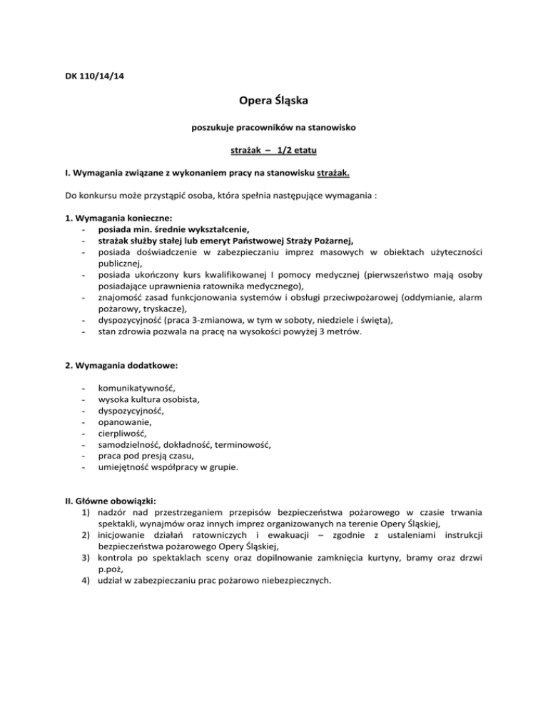 DK 110/14/14 Opera Śląska poszukuje pracowników na stanowisko strażak – 1/2 etatu I. Wymagania związane z wykonaniem pracy na stanowisku strażak. Do konkursu może przystąpić osoba, która spełnia następujące wymagania : 1. Wymagania konieczne: - posiada min. średnie wykształcenie, - strażak służby stałej lub emeryt Państwowej Straży Pożarnej, - posiada doświadczenie w zabezpieczaniu imprez masowych w obiektach użyteczności publicznej, - posiada ukończony kurs kwalifikowanej I pomocy medycznej (pierwszeństwo mają osoby posiadające uprawnienia ratownika medycznego), - znajomość zasad funkcjonowania systemów i obsługi przeciwpożarowej (oddymianie, alarm pożarowy, tryskacze), - dyspozycyjność (praca 3-zmianowa, w tym w soboty, niedziele i święta), - stan zdrowia pozwala na pracę na wysokości powyżej 3 metrów. 2. Wymagania dodatkowe: - komunikatywność, wysoka kultura osobista, dyspozycyjność, opanowanie, cierpliwość, samodzielność, dokładność, terminowość, praca pod presją czasu, umiejętność współpracy w grupie. II. Główne obowiązki: 1) nadzór nad przestrzeganiem przepisów bezpieczeństwa pożarowego w czasie trwania spektakli, wynajmów oraz innych imprez organizowanych na terenie Opery Śląskiej, 2) inicjowanie działań ratowniczych i ewakuacji – zgodnie z ustaleniami instrukcji bezpieczeństwa pożarowego Opery Śląskiej, 3) kontrola po spektaklach sceny oraz dopilnowanie zamknięcia kurtyny, bramy oraz drzwi p.poż, 4) udział w zabezpieczaniu prac pożarowo niebezpiecznych. III. Wymagane dokumenty i oświadczenia : - curriculum vitae, - list motywacyjny, - dokumenty potwierdzające wykształcenie, - dokumenty potwierdzające doświadczenie zawodowe kandydata oraz ukończone kursy, - oświadczenie o wyrażeniu zgody na przetwarzanie danych osobowych do celów rekrutacji. IV. Oferujemy: - pracę w renomowanej instytucji o ugruntowanej pozycji, - umowę o pracę, - możliwość rozwoju zawodowego. Sposób i termin składania ofert. Oferty należy składać w Dziale Kadr w Operze Śląskiej, ul. Moniuszki 21/23, 41-902 Bytom, lub drogą elektroniczną, na adres mailowy [email protected] - z dopiskiem „Konkurs na stanowisko strażaka”, do dnia 17 grudnia 2014 r. do godziny 15.00. Składając aplikację proszę powołać się na źródło informacji o ofercie. Konkurs przeprowadzi komisja powołana przez Dyrektora Opery Śląskiej. O wynikach postępowania konkursowego kandydaci zostaną powiadomieni indywidualnie.