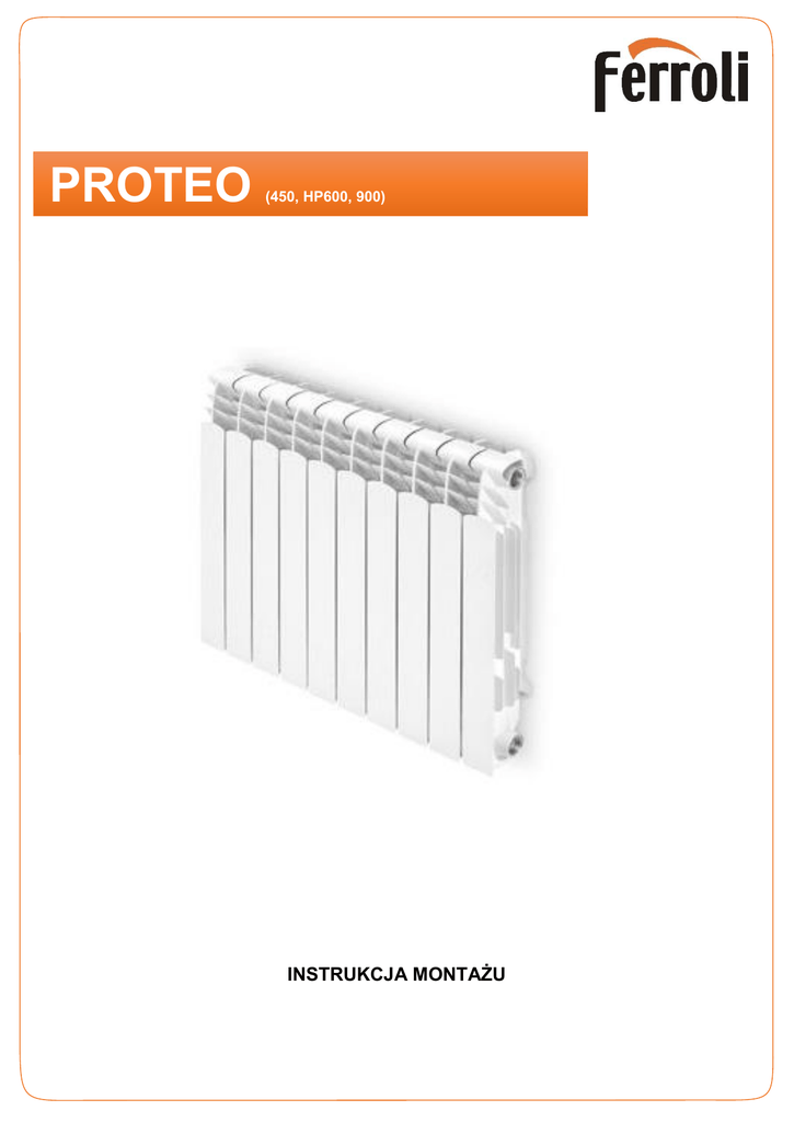 PROTEO (450, HP600, 900) INSTRUKCJA MONTAŻU PROTEO Charakterystyka Nowoczesna instalacja c.o. powinna charakteryzować się oszczędną i wieloletnia eksploatacja. Należy ja zatem wyposażyć w grzejniki o niskiej bezwładności cieplnej umożliwiające szybka reakcje układu grzewczego na zmiany zapotrzebowania ciepła, co przekłada się na oszczędność energii. Jeszcze lepiej jeśli grzejniki te pracują długo i bezproblemowo. PROTEO są owocem wieloletniego doświadczenia Ferroli w produkcji grzejników i posiadają obie te cechy. Ale to nie wszystko – oprócz doskonałych parametrów, PROTEO również świetnie wyglądają! Zalety ELEGANCKIE GRZEJNIKI ZE SPECJALNEGO STOPU ALUMINIUM Eleganckie grzejniki charakteryzujące się atrakcyjnym, nowoczesnym wzornictwem Niewielka pojemność wodna, zapewniającą niska bezwładność cieplna Sprawne osiąganie właściwej temperatury roboczej i szybka reakcja na zmiany zapotrzebowania ciepła Zabezpieczenie przed korozja, dzięki zjawisku naturalnej pasywacji na powierzchni specjalnego stopu aluminium firmy Ferroli Odpowiednie ukształtowanie żeberek grzejników zapewniające dużą powierzchnie wymiany ciepła Wysoka wydajność cieplna Niezawodność potwierdzona 10-letnia gwarancja Miejsce montażu Zaleca się montowanie grzejnika w najchłodniejszym miejscu pomieszczenia. Najlepszym miejscem montażu grzejnika w pomieszczeniu są ściany zewnętrzne budynku pod oknem. Dzięki takiemu montażowi grzejniki pracują efektywnie zapewniając równomierną cyrkulację ciepłego powietrza w pomieszczeniu. Odległości od ściany, podłogi oraz parapetu Dla grzejnika aluminiowego PROTEO wymaganą, minimalną odległością od ściany 3 cm, minimalna odległością od podłogi 12cm. Wymaganą minimalną odległość grzejnika PROTEO od spodu parapetu 10cm. Jeśli grzejnik nie jest montowany pod parapetem należy zapewnić 10cm wolnej przestrzeni nad grzejnikiem. Podłączenie do instalacji Grzejnik aluminiowy PROTEO może być montowany we wszystkich rodzajach instalacji wodnych zamkniętych jak i otwartych (instalacje otwarte do mocy cieplnej 30 kW) zawierających elementy wykonane z tworzyw sztucznych, stali miedzi i stopów miedzi. Wymagania dotyczące instalacji oraz wody obiegowej 2 Maksymalna temperatura robocza 95C Maksymalne ciśnienie robocze 1,6MPa Parametry wody w instalacji powinny być zgodne z normą PN-93/C-04607, przy czym pH wody powinno zawierać się w przedziale od 7 do 8 Unikanie bezpośredniego kontaktu stali, miedzi i stopów miedzi z aluminium przez stosowanie w połączeniach uszczelnień wykonanych z taśmy teflonowej oraz unikania szczeliwa konopnego. Zalecane jest stosowanie oryginalnych złączek redukcyjnych i zaślepek FERROLI Woda obiegowa powinna być odpowiednio uzdatniona, w tym celu należy stosować odpowiednie inhibitory korozji posiadające właściwe dopuszczenia do stosowania w instalacjach wodnych. Warunek ten jest konieczny w przypadku instalacji zawierających elementy wykonane z miedzi, stopów miedzi i stali. Instalacji grzewcza oczyszczenia i zastosowania odpowiedniego inhibitora korozji w przypadku stwierdzenia przekroczenia dopuszczalnej zawartości jonów agresywnych w wodzie. PROTEO Wymiary grzejnika aluminiowego PROTEO Układ podłączeń grzejnika PROTEO Układ połączenia boczny (z prawej lub lewej strony) – rozwiązanie takie jest stosowane przy poprowadzeniu rur w ścianach. Rozstaw wyprowadzeń przyłączeniowych instalacji do grzejnika powinien odpowiadać końcówek przyłączeniowych grzejnika T Układ połączenia boczny krzyżowy – rozwiązanie takie jest stosowane przy zmontowaniu dużej ilości grzejników (długie grzejniki). Takie rozwiązanie zapewnia równomierny rozkład temperatury na całej powierzchni grzejnika T 3 PROTEO Dane Techniczne Warunki Gwarancji 1. Niniejszym firma Ferroli Poland Sp. z o.o. (zwana dalej Gwarantem) gwarantuje dobrą jakość i zachowanie cech użytkowych grzejnika aluminiowego PROTEO przez okres 10 lat 2. Gwarancja udzielna jest wyłącznie użytkownikowi końcowemu, przez którego rozumie się osobę, u której grzejnik został zamontowany 3. Okres gwarancji liczony jest od daty zakupu grzejnika przez użytkownika końcowego. 4. Użytkownik jest zobowiązany posiadać dokument potwierdzający dokonanie zakupu – np. fakturę zakupu lub paragon. 5. Gwarancja obejmuje jedynie naprawę lub wymianę grzejników lub ich części, które uznane zostaną przez Gwaranta za wadliwe. W szczególności gwarancja obejmuje: nieszczelność spowodowaną wadami produkcyjnymi, tworzenie się rdzy lub innych uszkodzeń na polakierowanych powierzchniach grzejnika będących wadą fabryczną. 6. Gwarancją objęty jest grzejnik pod następującymi warunkami: a) Grzejnik zamontowany został w niskotemperaturowych wodnych instalacjach centralnego ogrzewania i użytkowany jest w warunkach eksploatacyjnych odpowiadających ich przeznaczeniu, w szczególności służy do ogrzewania pomieszczeń mieszkalnych, biurowych, usługowych i innych wewnętrznych w których nie ma w powietrzu szkodliwych substancji oddziaływujących korozyjnie na grzejnik, które nie są zawilgocone, gdzie nie dopuszcza się spadku temperatury umożliwiającej zamarznięcie grzejnika. b) Woda w instalacji spełnia wszelkie wymagane parametry dla wody stosowanej w instalacji centralnego ogrzewania. W szczególności jest zgodna z wymaganiami normy: PN-93/C-04607 woda w instalacji ogrzewania. Wymagania jakości wody. c) Ciśnienie robocze w instalacji centralnego ogrzewania jest stabilne i nie przekracza 16 bar d) Maksymalna temperatura robocza nie przekracza 95 °C e) Instalacja, w której pracuje grzejnik, została wykonana przez osobę posiadającą wszystkie wymagane przepisami prawa uprawnienia i dopuszczenia. Instalacja spełnia wszelkie krajowe normy i przepisy techniczne. 7. Gwarancja nie obejmuje grzejnika w następujących przypadkach: a) Gdy grzejnik został zamontowany w śr