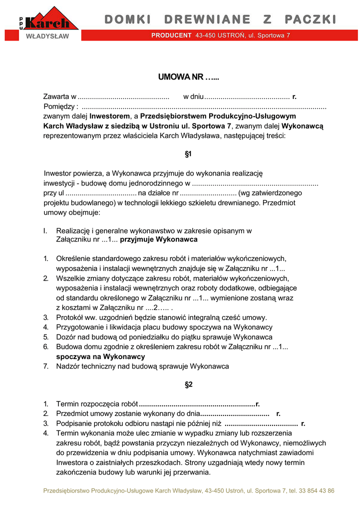 UMOWA NR …... Zawarta w ............................................. w dniu .......................................... r. Pomiędzy : ........................................................................................................................ zwanym dalej Inwestorem, a Przedsiębiorstwem Produkcyjno-Usługowym Karch Władysław z siedzibą w Ustroniu ul. Sportowa 7, zwanym dalej Wykonawcą reprezentowanym przez właściciela Karch Władysława, następującej treści: §1 Inwestor powierza, a Wykonawca przyjmuje do wykonania realizację inwestycji - budowę domu jednorodzinnego w .............................................................. przy ul ................................... na działce nr ............................ (wg zatwierdzonego projektu budowlanego) w technologii lekkiego szkieletu drewnianego. Przedmiot umowy obejmuje: I. Realizację i generalne wykonawstwo w zakresie opisanym w Załączniku nr ...1... przyjmuje Wykonawca 1. Określenie standardowego zakresu robót i materiałów wykończeniowych, wyposażenia i instalacji wewnętrznych znajduje się w Załączniku nr ...1... Wszelkie zmiany dotyczące zakresu robót, materiałów wykończeniowych, wyposażenia i instalacji wewnętrznych oraz roboty dodatkowe, odbiegające od standardu określonego w Załączniku nr ...1... wymienione zostaną wraz z kosztami w Załączniku nr ....2….. . Protokół ww. uzgodnień będzie stanowić integralną cześć umowy. Przygotowanie i likwidacja placu budowy spoczywa na Wykonawcy Dozór nad budową od poniedziałku do piątku sprawuje Wykonawca Budowa domu zgodnie z określeniem zakresu robót w Załączniku nr ...1... spoczywa na Wykonawcy Nadzór techniczny nad budową sprawuje Wykonawca 2. 3. 4. 5. 6. 7. §2 1. 2. 3. 4. Termin rozpoczęcia robót ......................................................... r. Przedmiot umowy zostanie wykonany do dnia.................................. r. Podpisanie protokołu odbioru nastąpi nie później niż .................................... r. Termin wykonania może ulec zmianie w wypadku zmiany lub rozszerzenia zakresu robót, bądź powstania przyczyn niezależnych od Wykonawcy, niemożliwych do przewidzenia w dniu podpisania umowy. Wykonawca natychmiast zawiadomi Inwestora o zaistniałych przeszkodach. Strony uzgadniają wtedy nowy termin zakończenia budowy lub warunki jej przerwania. Przedsiębiorstwo Produkcyjno-Usługowe Karch Władysław, 43-450 Ustroń, ul. Sportowa 7, tel. 33 854 43 86 §3 1. 2. 3. 4. 5. 6. 7. Inwestycja w całości realizowana będzie ze środków finansowych Inwestora. Inwestor wpłacać będzie na konto Wykonawcy zaliczki na poczet wykonania poszczególnych etapów robót. Terminy wpłat oraz ich wysokość określono w punkcie 4. Wartość robót budowlanych określa się na kwotę ……………………….... wraz z podatkiem VAT 8%. W rozliczeniu końcowym wykonawca może uwzględnić wzrost cen materiałów, kosztów transportu, paliw, nośników energii, stawek ubezpieczeniowych i podatkowych itp., jeżeli w trakcie trwania umowy nastąpiły zmiany mające wpływ na uzgodnione wcześniej stawki lub ceny. Zaliczki na poczet robót budowlanych będą wpłacane w następujących etapach: a) 10% kosztu Inwestycji w momencie zawarcia umowy z ustaleniem terminu rozpoczęcia i zakresu wykonania robót, b) 30% kosztu Inwestycji na zakup materiałów na elementy konstrukcyjne, c) 30% kosztu Inwestycji po wykonaniu elementów domu przygotowanych do montażu i spakowanych do transportu. d) 25% kosztów inwestycji przed rozpoczęciem końcowego etapu wykończenia budynku ustalonego w załącznikach 1 i 2. e) 5 % kosztu Inwestycji po podpisaniu protokółu odbioru domu w terminie do 7 dni ...................................... Rozliczenia będą następowały sukcesywnie, po zakończeniu kolejnych etapów robót, nie hamując ich postępu. Wykonawca wystawi Inwestorowi faktury za wykonane etapy robót (na kwotę określoną w umowie) Inwestor będzie dokonywał kolejnych wpłat na konto Wykonawcy w ING Bank Śląski S.A. nr 30 1050 1096 1000 0001 0109 4464 Przedsiębiorstwo Produkcyjno-Usługowe Karch Władysław, 43-450 Ustroń, ul. Sportowa 7, tel. 33 854 43 86 §4 1. Inwestor oświadcza, że gwarantuje środki finansowe na opłacenie zleconych prac określonych w §1 oraz wycenionych w §3 i pod rygorem kar umownych określonych w §5, będzie finansował roboty budowlane zgodnie z harmonogramem wpłat określonych w §3 p.4. 2. Odstąpienie przez Inwestora od umowy spowoduje przepadek zaliczki określonej w §3 p.4 a) oraz zwrot kosztów poniesionych przez Wykonawcę i naliczenie kar umownych za okres do chwili rozliczenia. 3. Za niedotrzymanie przez Wykonawcę terminów ustalonych w §2, Inwestor może naliczyć Wykonawcy kary umowne za każdy dzień zwłoki wg zasad określonych w §5. W przypadku powstania przyczyn niezależnych od Wykonawcy, mogących spowodować wzrost kosztów, opóźnienie robót lub ich przerwanie, strony uzgodnią nowy termin zakończenia budowy lub warunki lub warunki przerwania budowy oraz uzasadniony wzrost kosztów. §5 1. Wysokość kar umownych dla obu stron za każdy dzień zwłoki uzgadnia się w wysokości 0,1% wartości zaległości. 2. Za nieterminowe usunięcie usterek Wykonawca zapłaci Inwestorowi karę umowną w wysokości 0,5% wartości usunięcia usterki za każdy dzień zwłoki. §6 W przypadku szkody wyrządzonej z tytułu niewykonania lub nienależytego wykonania umowy w kwocie przekraczającej wysokość kar umownych strony mogą dochodzić swych roszczeń na zasadach ogólnych wynikających z kodeksu cywilnego. §7 Wykonawca udzieli gwarancji na wykonane roboty: - na konstrukcję 30 lat(gwarancja nie obejmuje przypadków wystąpienia niemożliwych do przewidzenia klęsk żywiołowych jak np. powódź, tornado itp.) - na instalacje, pokrycia, tynki, okładziny i inne roboty wykończeniowe - dwanaście miesięcy od daty końcowego odbioru oraz 3 lata
