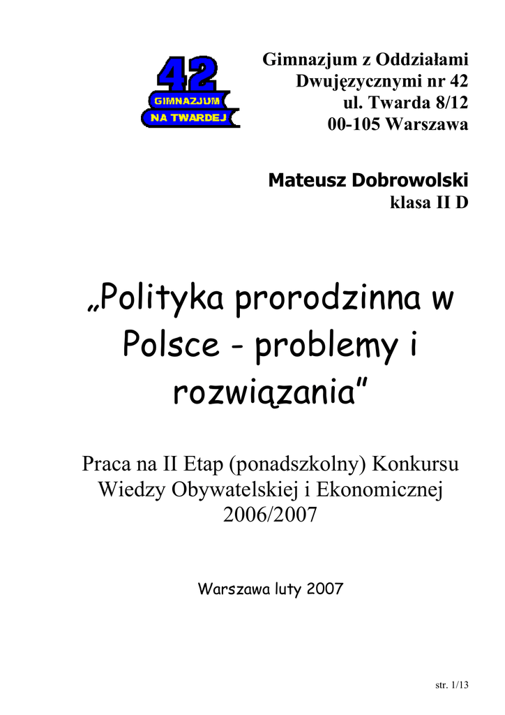 Gimnazjum z Oddziałami Dwujęzycznymi nr 42 ul. Twarda 8/12 00-105 Warszawa Mateusz Dobrowolski klasa II D „Polityka prorodzinna w Polsce - problemy i rozwiązania” Praca na II Etap (ponadszkolny) Konkursu Wiedzy Obywatelskiej i Ekonomicznej 2006/2007 Warszawa luty 2007 str. 1/13 1. Wprowadzenie Polityka rodzinna, nazywana jest niekiedy „polityką prorodzinną”. A cóż to takiego? W „Wikipedii” – największej wolnej encyklopedii - pod hasłem „polityka rodzinna” czytamy: „Polityka rodzinna – dająca się (względnie) wyodrębnić część polityki społecznej stanowiąca system długofalowych zamierzeń i towarzyszący mu system rozwiązań prawnych, przyjętych i realizowanych przez władzę publiczną na rzecz rodziny jako podstawowej komórki społecznej.” Z kolei w przyjętym 3 listopada 1999 roku dokumencie „Polityka prorodzinna państwa” [Bibliografia poz. 1] jest ona opisywana następująco : „Polityka prorodzinna ma na celu zapewnienie trwania i rozwoju rodziny oraz poszanowanie należnych jej praw, w tym prawa do samodzielności ekonomicznej oraz decydowania o wychowaniu dzieci. Dlatego też polityka prorodzinna i skuteczna polityka socjalna powinny się rozwijać w stosunku do rodzin dysfunkcyjnych i znajdujących się w trudnej sytuacji, powinna mieć charakter interwencyjny i uzupełniający.” Na podstawie źródeł pisanych (patrz Bibliografia), opinii eksperta i przeprowadzonej ankiety (niereprezentatywna 50 osobowa grupa) chciałbym przybliżyć czytelnikowi problemy z jakimi borykają się polskie rodziny i ewentualne koncepcje rozwiązań. 2. Depresja demograficzna po roku 1984 Liczba urodzeń w Polsce maleje nieprzerwanie od 1984 r. GUS szacuje , że w 2006 r. urodziło się tylko ok. 374 tys. dzieci, co prawda to ponad 10 tys. więcej niż w 2005 r., ale i tak ok. 1/3 mniej niż w 1990 r. i blisko połowę mniej niż w 1983 r., który był szczytowym rokiem ostatniego wyżu demograficznego (723 tys. urodzeń). W 2006 r. współczynnik urodzeń wyniósł 9,8‰ i był o 4,5 pkt. niższy niż w 1990 r. (w 2005 r. wynosił 9,6‰). Pomimo rosnącej liczby urodzeń – ten poziom przyrostu nadal nie gwarantuje prostej zastępowalności pokoleń. Od 1989 r. utrzymuje się w Polsce okres głębokiej depresji urodzeniowej. W 2005 r. współczynnik dzietności wynosił 1,24, co oznacza minimalny wzrost (o 0,02) w stosunku do odnotowanego w 2003 r. - najniższego od ponad 50 lat. Za najbardziej korzystną sytuację demograficzną uważa się taką, w której współczynnik ten kształtuje się przynajmniej na poziomie 2,1-2,15, tzn. kiedy w danym roku na jedną kobietę w wieku 15-49 lat przypada średnio 2 dzieci. Jak wynika z poniższego wykresu sytuacja taka na wsi była jeszcze do 1994 r. str. 2/13 Współczynniki dzietności w latach 1990-2003 3,0 Miasta Wieś Ogółem 2,5 2,0 1,5 1,0 0,5 0,0 1990 1991 1992 1993 1994 1995 1996 1997 1998 1999 2000 2001 2002 2003 Przeobrażenia demograficzne z lat 90-tych wskazują na przesunięcie najwyższej płodności kobiet z grupy wieku 20-24 lata do grupy 25-29 lat. Jest to wynikiem wyboru, jakiego coraz częściej dokonują młodzi ludzie decydując się najpierw na osiągnięcie określonego poziomu wykształcenia oraz stabilizacji ekonomicznej, a dopiero potem na założenie rodziny oraz jej powiększanie. Wyniki badań GUS-u wskazują, że przeciętny wiek kobiet, które w 2005 r. urodziły dziecko to 27,4 lat, tj. o prawie 1,5 roku więcej niż na początku lat 90-tych. Wiek kobiet rodzących swoje pierwsze dziecko wzrósł o prawie 2,5 roku, tj. z 23 do 25,4 lat. Tak więc obserwowany w ostatnich latach (2004-2006) – wzrost liczby urodzeń może być spowodowany realizacją urodzeń „odłożonych”, ale jest także efektem korzystnych zmian w strukturze wieku prokreacyjnego kobiet. Z przeprowadzonej przeze mnie ankiety (patrz wykres poniżej) wynika, że przyczyny depresji demograficznej należy upatrywć przede wszystkim w 4 dużych problemach: a) Zmiany w stylu życia (kariera, zapracowanie) - zdaniem połowy ankietowanych to najistotniejszy powód spadku liczby urodzeń, b) Bezrobocie, brak perspektyw - jeden na sześciu ankietowanych ten problem uważa za najważniejszy, a dla 31% ankieowanych jest on drugim najważniejszym powodem spadku urodzeń, c) Rosnące koszty wychowania dzieci - dla co piątego ankietowanego to drugi co do wazności problem, dla 25% to problem nr.3, d) Sytuacja na rynku mieszkań - dla co czwartego ankietowanego to problem nr. 3, a dla 25% ankietowanych jest czwartym w kolejności. str. 3/13 Co Pana/Pani zdaniem w największym stopniu wpłynęło na spadek liczby urodzeń w Polsce po 1994r.? Zmiana stylu życia 5,56 2,78 Bezrobocie 5,56 Rosnące koszty wychowania dziecka 8,33 Sytuacja na rynku mieszkań Brak pomocy ze strony państwa 2,78% 5,56 50,00% Spadek liczby zawieranych małżeństw Niedojrzałość rodzicielska młodych Polaków Wzrost liczby rozwodów 16,67 Emigracja Polaków Zniechęcenie nowym ustrojem Opinia eksperta – pani Teresy Kapeli, członka zarządu Związku Dużych Rodzin Trzy Plus - zdaje się potwierdzać wyniki ankiety. Na pytanie: „Dlaczego mimo ustabilizowania się sytuacji społeczno-ekonomiczno-politycznej po 1994 r. nadal spada liczba urodzeń?” pani Kapela odpowiada: „Niestety wszystkie badania wskazują na to iż stabilizacja raczej zmniejsza ilość dzieci niż ją zwiększa. Przyczyn zmniejszania się ilości dzieci poszukuje się w zmianach wzorców kulturowych, w tym tych związanych z modelem rodziny, zmianach na rynku pracy. Charakterystyczna piramida demograficzna dla społeczeństw bogatych to mała ilość dzieci i zwiększająca się ilość osób w wieku emerytalnym. przeciwnie społeczeństwa ubogie mają dużą podstawę - ilość małych dzieci, i tylko nieliczni dożywają do wieku emerytalnego. Ponadto sprawa dzietności jest sprawą bardzo osobistą i uzależnioną od tak wielu czynników, że bardzo trudno 