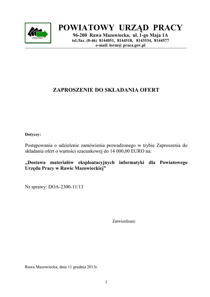 POWIATOWY URZĄD PRACY 96-200 Rawa Mazowiecka, ul. 1-go Maja 1A tel./fax. (0-46) 8144051, 8144518, 8143534, 8144577 e-mail: lorm@ praca.gov.pl ZAPROSZENIE DO SKŁADANIA OFERT Dotyczy: Postępowania o udzielenie zamówienia prowadzonego w trybie Zaproszenia do składania ofert o wartości szacunkowej do 14 000,00 EURO na: „Dostawa materiałów eksploatacyjnych informatyki dla Powiatowego Urzędu Pracy w Rawie Mazowieckiej” Nr sprawy: DOA-2300-11/13 Zatwierdzam: Rawa Mazowiecka, dnia 11 grudnia 2013r. 1 I. NAZWA ORAZ ADRES ZAMAWIAJĄCEGO 1. Powiatowy Urząd Pracy w Rawie Mazowieckiej, zwany dalej „Zamawiający”, 2. Adres Zamawiającego: Powiatowy Urząd Pracy ul. 1-go Maja 1A 96-200 Rawa Mazowiecka 3. REGON: 750201901 4. NIP: 835-10-04-915 5. Tel. 046- 8144051 6. Fax: 046-8143534 7. e-mail: [email protected]; [email protected] 8. Adres strony internetowej, na której Zamawiający udostępnia Zaproszenie: http://pup.rawamazowiecka.ibip.pl 9. Godziny pracy Zamawiającego: od 8.00 do 16.00 w dni robocze od poniedziałku do piątku 10. Zamawiający wymaga, aby wszelkie pisma związane z postępowaniem były kierowane wyłącznie na wyżej wskazany adres we wskazanych godzinach pracy Zamawiającego. II. TRYB UDZIELENIA ZAMÓWIENIA Zaproszenie do składania ofert (dalej Zaproszenie) o szacunkowej wartości zamówienia poniżej 14.000 euro. III. OPIS PRZEDMIOTU ZAMÓWIENIA 1. 2. 3. 4. Przedmiotem zamówienia jest: „Dostawa materiałów eksploatacyjnych informatyki dla Powiatowego Urzędu Pracy w Rawie Mazowieckiej”, zgodnie z załączonym opisem przedmiotu zamówienia – Załącznik nr 1. Wymagana jest należyta staranność przy realizacji zamówienia. Zamawiający nie dopuszcza składania ofert częściowych. Zamawiający nie dopuszcza składania ofert wariantowych. IV. TERMIN WYKONANIA ZAMÓWIENIA Termin wykonania zamówienia: do 23 grudnia 2013r. VII. INFORMACJE O SPOSOBIE POROZUMIEWANIA SIĘ ZAMAWIAJĄCEGO Z WYKONAWCAMI ORAZ PRZEKAZYWANIA OŚWIADCZEŃ LUB DOKUMENTÓW, A TAKŻE WSKAZANIE OSÓB UPRAWNIONYCH DO POROZUMIEWANIA SIĘ Z WYKONAWCAMI 1. Zapytania, oświadczenia, wnioski, zawiadomienia oraz inne informacje Zamawiający i Wykonawcy przekazują pisemnie lub przy użyciu poczty elektronicznej e-mail, faksu lub telefonicznie. Oferty należy składać pisemnie, dopuszcza się przesłanie treści oferty przy użyciu faksu lub poczty elektronicznej e-mail. 2. Osobą uprawnioną do kontaktowania się z Wykonawcami jest: Marcin Kalinowski, Alina Starzec. 2 VIII. TERMIN ZWIĄZANIA OFERTĄ 1. 2. Termin, do którego Wykonawcy będą związani złożoną ofertą ustala się na 20 dni licząc od dnia upływu ostatecznego terminu do składania ofert. Bieg terminu związania ofertą rozpoczyna się wraz z upływem terminu składania ofert. IX. OPIS SPOSOBU PRZYGOTOWANIA OFERTY 1. 2. 3. 4. 5. 6. Oferta winna być sporządzona na formularzu Oferty (Załącznik Nr 2). Koszty związane z przygotowaniem i złożeniem oferty ponosi Wykonawca. Oferta winna być sporządzona w języku polskim na maszynie do pisania, komputerze lub ręcznie – pismem czytelnym, np. długopisem, atramentem, tuszem lub innym trwałym sposobem. Oferta oraz wszelkie załączniki do oferty winny być podpisane przez Wykonawcę lub upoważnionych przedstawicieli Wykonawcy. W przypadku podpisania dokumentów składających się na Ofertę przez pełnomocnika Wykonawcy do oferty należy dołączyć pełnomocnictwo. Zamawiający informuje, że oferty składane w postępowaniu są jawne i podlegają udostępnianiu od chwili ich otwarcia, na wniosek Wykonawcy. Wyjątkiem są informacje stanowiące tajemnicę przedsiębiorstwa w rozumieniu przepisów o zwalczaniu nieuczciwej konkurencji, jeśli Wykonawca nie później niż w terminie składania ofert zastrzegł, ze nie mogą one być udostępniane. a) Przez tajemnicę przedsiębiorstwa w rozumieniu art. 11 ust. 4 ustawy z dnia 16 kwietnia 1993r. o zwalczaniu nieuczciwej konkurencji (Dz.U. Nr 47 z 08.06.1993r., poz. 211 ze zm.) rozumie się nieujawnione do wiadomości publicznej informacje techniczne, technologiczne, organizacyjne przedsiębiorstwa lub inne informacje posiadające wartość gospodarczą, co do których przedsiębiorca podjął niezbędne działania w celu zachowania ich poufałości. b) Zamawiający zaleca, aby informacje zastrzeżone jako tajemnica przedsiębiorstwa były przez Wykonawcę złożone w oddzielnej kopercie z oznakowaniem „Tajemnica przedsiębiorstwa“ lub spięte (zszyte) oddzielnie od pozostałych jawnych elementów oferty. c) Zastrzeżenie informacji, które nie stanowią tajemnicy przedsiębiorstwa w rozumieniu ww. ustawy skutkować będzie wyłączeniem w stosunku do takich informacji rygoru tajemnicy przedsiębiorstwa. d) Wykonawca m.in. nie może zastrzec informacji dotyczących: ceny, terminu wykonania zamówienia, warunków płatności zawartych w ofercie. X. MIEJSCE ORAZ TERMIN SKŁADANIA OFERT 1. 2. 3. Oferty należy składać na adres podany w Zaproszeniu do składania ofert w sekretariacie Powiatowego Urzędu Pracy w Rawie Mazowieckiej, pokój nr 17, nie później niż do dnia 13.12.2013r. do godz. 10:00. Dopuszcza się przesłanie treści oferty faksem: nr (46) 8143534 lub pocztą elektroniczną: [email protected] W przypadku przesłania Oferty pocztą, decydująca jest data i godzina wpływu do siedziby Powiatowego Urzędu Pracy w Rawie Mazowieckiej potwierdzona pieczęcią kancelaryjną Zamawiającego. Zamawiający zastrzega sobie prawo do wezwania Wykonawców w celu udzielenia dodatkowych wyjaśnień na temat złożonej oferty. 3 XI. OPIS SPOSOBU OBLICZENIA CENY 1. 2. 3. 4. Ceną podlegającą ocenie przez Zamawiającego jest CENA BRUTTO. Cenę oferty należy wpisać do formularza oferty. Cena obejmuje wszelkie koszty realizacji przedmiotu zamówienia, dostawy do siedziby zamawiającego oraz winna uwzględniać ewentualne rabaty i upusty. Cenę oferty należy podać w złotych polskich (PLN). XII. OPIS KRYTERIÓW, KTÓRYMI Z