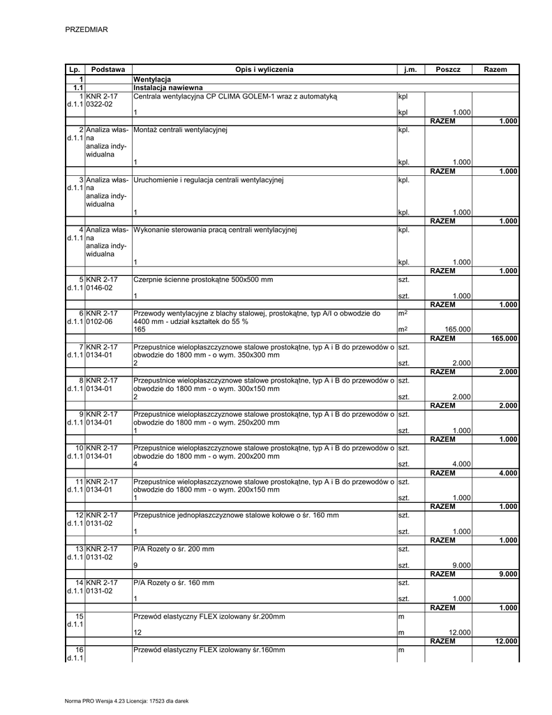 PRZEDMIAR Lp. Podstawa 1 1.1 1 KNR 2-17 d.1.1 0322-02 Opis i wyliczenia Wentylacja Instalacja nawiewna Centrala wentylacyjna CP CLIMA GOLEM-1 wraz z automatyką j.m. kpl 1 kpl 2 Analiza włas- MontaŜ centrali wentylacyjnej d.1.1 na analiza indywidualna 1 kpl. 3 Analiza włas- Uruchomienie i regulacja centrali wentylacyjnej d.1.1 na analiza indywidualna 1 kpl. 4 Analiza włas- Wykonanie sterowania pracą centrali wentylacyjnej d.1.1 na analiza indywidualna 1 kpl. 5 KNR 2-17 d.1.1 0146-02 Czerpnie ścienne prostokątne 500x500 mm szt. 1 szt. Przewody wentylacyjne z blachy stalowej, prostokątne, typ A/I o obwodzie do 4400 mm - udział kształtek do 55 % 165 m2 6 KNR 2-17 d.1.1 0102-06 7 KNR 2-17 d.1.1 0134-01 8 KNR 2-17 d.1.1 0134-01 9 KNR 2-17 d.1.1 0134-01 10 KNR 2-17 d.1.1 0134-01 11 KNR 2-17 d.1.1 0134-01 12 KNR 2-17 d.1.1 0131-02 13 KNR 2-17 d.1.1 0131-02 14 KNR 2-17 d.1.1 0131-02 15 d.1.1 16 d.1.1 kpl. kpl. kpl. m2 Przepustnice wielopłaszczyznowe stalowe prostokątne, typ A i B do przewodów o szt. obwodzie do 1800 mm - o wym. 350x300 mm 2 szt. Przepustnice wielopłaszczyznowe stalowe prostokątne, typ A i B do przewodów o szt. obwodzie do 1800 mm - o wym. 300x150 mm 2 szt. Przepustnice wielopłaszczyznowe stalowe prostokątne, typ A i B do przewodów o szt. obwodzie do 1800 mm - o wym. 250x200 mm 1 szt. Przepustnice wielopłaszczyznowe stalowe prostokątne, typ A i B do przewodów o szt. obwodzie do 1800 mm - o wym. 200x200 mm 4 szt. Przepustnice wielopłaszczyznowe stalowe prostokątne, typ A i B do przewodów o szt. obwodzie do 1800 mm - o wym. 200x150 mm 1 szt. Przepustnice jednopłaszczyznowe stalowe kołowe o śr. 160 mm szt. 1 szt. P/A Rozety o śr. 200 mm szt. 9 szt. P/A Rozety o śr. 160 mm szt. 1 szt. Przewód elastyczny FLEX izolowany śr.200mm m 12 m Przewód elastyczny FLEX izolowany śr.160mm m Norma PRO Wersja 4.23 Licencja: 17523 dla darek Poszcz Razem 1.000 RAZEM 1.000 1.000 RAZEM 1.000 1.000 RAZEM 1.000 1.000 RAZEM 1.000 1.000 RAZEM 1.000 165.000 RAZEM 165.000 2.000 RAZEM 2.000 2.000 RAZEM 2.000 1.000 RAZEM 1.000 4.000 RAZEM 4.000 1.000 RAZEM 1.000 1.000 RAZEM 1.000 9.000 RAZEM 9.000 1.000 RAZEM 1.000 12.000 RAZEM 12.000 PRZEDMIAR Lp. Podstawa Opis i wyliczenia 1 17 KNR 2-17 d.1.1 0123-02 18 KNR 2-17 d.1.1 0139-04 19 KNR 2-17 d.1.1 0139-04 j.m. m Przewody wentylacyjne z blachy stalowej,kolowe,typ S(Spiro) o śr.150 i 160 mm - m2 udzial kształtek do 55 % LINDAB 8.8 m2 Nawiewnik sufitowy 4-stronny 300x300 szt. 2 szt. Nawiewnik sufitowy 4-stronny 300x250 szt. 1 szt. 20 KNR-W 2-17 P/A Dostawa i montaŜ komory wyrównawczej do nawiewnika sufitowego 300x300 szt. d.1.1 0153-03 mm 2 szt. 21 KNR-W 2-17 P/A Dostawa i montaŜ komory wyrównawczej do nawiewnika sufitowego 300x250 szt. d.1.1 0153-03 mm 1 szt. 22 KNR 2-17 d.1.1 0138-02 23 KNR 2-17 d.1.1 0140-02 24 KNR 2-17 d.1.1 0140-01 25 KNR 2-16 d.1.1 0305-01 26 KNR 2-17 d.1.1 0102-06 1.2 27 KNR 2-17 d.1.2 0143-03 Kratki wentylacyjne typ A lub N o obwodzie do 1200 mm - do przewodów stalowych i aluminiowych - kratka o wym. 300x150 mm 2 szt. Anemostat nawiewny o śr. 200 mm szt. 6 szt. Anemostat nawiewny o śr. 160 mm szt. 1 szt. Izolacja Rockwool KLIMAFIX gr.20mm kanałów wentylacyjnych m2 179 m2 szt. P/A Wykonanie płaszcza z blachy ocynkowanej kanałów wentylacyjnych - kanały m2 na zewnątrz budynku 49 m2 Instalacja wyciągowa Czerpnie lub wyrzutnie dachowe prostokątne typ A i B o obwodzie do 2520 mm - szt. o wym. 500x500 mm 1 szt. 28 Analiza włas- System mocowania wyrzutni dachowej d.1.2 na analiza indywidualna 1 kpl. 29 KNR 2-17 d.1.2 0102-06 m2 30 KNR 2-17 d.1.2 0134-01 31 KNR 2-17 d.1.2 0134-01 32 KNR 2-17 d.1.2 0134-01 Przewody wentylacyjne z blachy stalowej, prostokątne, typ A/I o obwodzie do 4400 mm - udział kształtek do 55 % 162 kpl. m2 Przepustnice wielopłaszczyznowe stalowe prostokątne, typ A i B do przewodów o szt. obwodzie do 1800 mm - o wym. 300x200 mm 2 szt. Przepustnice wielopłaszczyznowe stalowe prostokątne, typ A i B do przewodów o szt. obwodzie do 1800 mm - o wym. 300x150 mm 1 szt. Przepustnice wielopłaszczyznowe stalowe prostokątne, typ A i B do przewodów o szt. obwodzie do 1800 mm - o wym. 200x200 mm 1 szt. Norma PRO Wersja 4.23 Licencja: 17523 dla darek Poszcz 1.000 RAZEM Razem 1.000 8.800 RAZEM 8.800 2.000 RAZEM 2.000 1.000 RAZEM 1.000 2.000 RAZEM 2.000 1.000 RAZEM 1.000 2.000 RAZEM 2.000 6.000 RAZEM 6.000 1.000 RAZEM 1.000 179.000 RAZEM 179.000 49.000 RAZEM 49.000 1.000 RAZEM 1.000 1.000 RAZEM 1.000 162.000 RAZEM 162.000 2.000 RAZEM 2.000 1.000 RAZEM 1.000 1.000 RAZEM 1.000 PRZEDMIAR Lp. Podstawa 33 KNR 2-17 d.1.2 0134-01 34 KNR 2-17 d.1.2 0134-01 35 KNR 2-17 d.1.2 0138-02 36 KNR 2-17 d.1.2 0138-02 37 KNR 2-17 d.1.2 0138-02 38 KNR 2-17 d.1.2 0138-02 39 KNR 2-17 d.1.2 0140-02 40 KNR 2-17 d.1.2 0140-01 41 KNR 2-17 d.1.2 0131-02 42 KNR 2-17 d.1.2 0131-02 43 d.1.2 44 d.1.2 45 KNR 2-16 d.1.2 0305-01 46 KNR 2-17 d.1.2 0102-06 1.3 47 KNR 2-17 d.1.3 0205-01 48 d.1.3 49 KNR 2-17 d.1.3 0120-01 Opis i wyliczenia j.m. Przepustnice wielopłaszczyznowe stalowe prostokątne, typ A i B do przewodów o szt. obwodzie do 1800 mm - o wym. 200x150 mm 1 szt. Przepustnice wielopłaszczyznowe stalowe prostokątne, typ A i B do przewodów o szt. obwodzie do 1800 mm - o wym. 150x150 mm 2 szt. Kratki wentylacyjne typ A lub N o obwodzie do 1200 mm - do przewodów stalowych i aluminiowych - kratka o wym. 300x250 mm 1 szt. Kratki wentylacyjne typ A lub N o obwodzie do 1200 mm - do przewodów stalowych i aluminiowych - kratka o wym. 300x150 mm 1 szt. Kratki wentylacyjne typ A lub N o obwodzie do 1200 mm - do przewodów stalowych i aluminiowych - kratka o wym. 200x200 mm 1 szt. Kratki wentylacyjne typ A lub N o obwodzie do 1200 mm - do przewodów stalowych i aluminiowych - kratka o wym. 150x100 mm 1 szt. Anemostat wywiewny o śr. 200 mm szt. 5 szt. Anemostat wywiewny o śr. 160 mm szt. 1 szt. P/A Rozety o śr. 200 mm szt. 5 szt. P/A Rozety o śr. 160 mm szt. 1 szt. Przewód elastyczny FLEX izolowany śr.200mm m 5