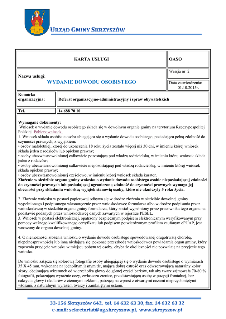 KARTA USŁUGI OASO Wersja nr 2 Nazwa usługi: WYDANIE DOWODU OSOBISTEGO Data zatwierdzenia: 01.10.2015r. Komórka organizacyjna: Referat organizacyjno-administracyjny i spraw obywatelskich Tel. 14 688 70 10 Wymagane dokumenty: Wniosek o wydanie dowodu osobistego składa się w dowolnym organie gminy na terytorium Rzeczypospolitej Polskiej. Pobierz wniosek: 1. Wniosek składa osobiście osoba ubiegająca się o wydanie dowodu osobistego, posiadająca pełną zdolność do czynności prawnych, z wyjątkiem: • osoby małoletniej, której do ukończenia 18 roku życia zostało więcej niż 30 dni, w imieniu której wniosek składa jeden z rodziców lub opiekun prawny; • osoby ubezwłasnowolnionej całkowicie pozostającą pod władzą rodzicielską, w imieniu której wniosek składa jeden z rodziców; • osoby ubezwłasnowolnionej całkowicie niepozostającej pod władzą rodzicielską, w imieniu której wniosek składa opiekun prawny; • osoby ubezwłasnowolnionej częściowo, w imieniu której wniosek składa kurator. Złożenie w siedzibie organu gminy wniosku o wydanie dowodu osobistego osobie nieposiadającej zdolności do czynności prawnych lub posiadającej ograniczoną zdolność do czynności prawnych wymaga jej obecności przy składaniu wniosku; wyjątek stanowią osoby, które nie ukończyły 5 roku życia. 2. Złożenie wniosku w postaci papierowej odbywa się w drodze złożenia w siedzibie dowolnej gminy wypełnionego i podpisanego własnoręcznie przez wnioskodawcę formularza albo w drodze podpisania przez wnioskodawcę w siedzibie organu gminy formularza, który został wypełniony przez pracownika tego organu na podstawie podanych przez wnioskodawcę danych zawartych w rejestrze PESEL. 3. Wniosek w postaci elektronicznej, opatrzony bezpiecznym podpisem elektronicznym weryfikowanym przy pomocy ważnego kwalifikowanego certyfikatu lub podpisem potwierdzonym profilem zaufanym ePUAP, jest wnoszony do organu dowolnej gminy. 4. O niemożności złożenia wniosku o wydanie dowodu osobistego spowodowanej długotrwałą chorobą, niepełnosprawnością lub inną niedającą się pokonać przeszkodą wnioskodawca powiadamia organ gminy, który zapewnia przyjęcie wniosku w miejscu pobytu tej osoby, chyba że okoliczności nie pozwalają na przyjęcie tego wniosku. Do wniosku załącza się kolorową fotografię osoby ubiegającej się o wydanie dowodu osobistego o wymiarach 35 X 45 mm, wykonaną na jednolitym jasnym tle, mającą dobrą ostrość oraz odwzorowującą naturalny kolor skóry, obejmującą wizerunek od wierzchołka głowy do górnej części barków, tak aby twarz zajmowała 70-80 % fotografii, pokazującą wyraźnie oczy, zwłaszcza źrenice, przedstawiającą osobę w pozycji frontalnej, bez nakrycia głowy i okularów z ciemnymi szkłami, patrzącą na wprost z otwartymi oczami nieprzysłoniętymi włosami, z naturalnym wyrazem twarzy i zamkniętymi ustami. W uzasadnionych przypadkach organ gminy może wydać dowód osobisty na wniosek, do którego została dołączona fotografia przedstawiająca osobę z zamkniętymi oczami, innym niż naturalny wyrazem twarzy lub z otwartymi ustami. Do wniosku składanego w postaci elektronicznej załącza się plik zawierający fotografię o wymiarach co najmniej 492 x 610 pikseli i wielkości nie przekraczającej 2,5 MB. Fotografia powinna być wykonana nie wcześniej niż 6 miesięcy przed dniem złożenia wniosku. Tożsamość osoby ubiegającej się o wydanie dowodu osobistego ustala się na podstawie przedłożonego przez wnioskodawcę dotychczasowego dowodu osobistego lub ważnego paszportu tej osoby, a w przypadku osób, które nabyły obywatelstwo polskie, na podstawie dokumentu podróży lub innego dokumentu stwierdzającego tożsamość. Organ gminy, przyjmując wniosek o wydanie dowodu osobistego sprawdza zgodność danych zawartych we wniosku z danymi zgromadzonymi w Rejestrze Dowodów Osobistych oraz rejestrze PESEL. Wniosek o wydanie dowodu osobistego należy złożyć; • co najmniej 30 dni przed upływem terminu ważności dokumentu tożsamości; • niezwłocznie w przypadku zmiany danych osobowych (np. nazwiska), utraty, uszkodzenia dowodu osobistego. Termin załatwiania sprawy 30 dni od daty złożenia wniosku o wydanie dowodu osobistego. Miejsce załatwienia sprawy: pokój 15 I piętro Miejsce złożenia dokumentów: pokój 15 I piętro Opłaty : nie pobiera się. Tryb odwoławczy: Od decyzji o odmowie wydania dowodu osobistego służy stronom odwołanie do Wojewody Małopolskiego w Krakowie za pośrednictwem Wójta Gminy Skrzyszów w terminie 14 dni od dnia otrzymania decyzji. Podstawa prawna Ustawa z dnia 6 sierpnia 2010 r. o dowodach osobistych (DZ.U. z dnia 10 września 2010 roku, Nr 167, poz. 1131), Rozporządzenie Ministra Spraw Wewnętrznych z dnia 29 stycznia 2015 r. w sprawie wzoru dowodu osobistego oraz trybu postępowania w sprawach wydawania dowodów osobistych, ich unieważniania (Dz.U. z dnia 16 lutego 2015 roku, poz. 212), Ustawa z dnia 18 lipca 2002 r. o świadczeniu usług drogą elektroniczną ( Dz.U. z 2002 r. Nr 144, poz. 1204). Odbiór dowodu osobistego: 1. Dowód osobisty odbiera się osobiście w siedzibie organu gminy, w którym został złożony wniosek. 2. Dowód osobisty wydawany osobie nieposiadającej zdolności do czynności prawnych odbiera rodzic albo opiekun prawny. 3. Dowód osobisty wydawany osobie posiadającej ograniczoną zdolność do czynności prawnych odbiera osoba ubiegająca się o wydanie dowodu osobistego, rodzic albo kurator. Ważność dowodu osobistego: Dowód osobisty wydany osobie, która nie ukończyła 5 roku życia, jest ważny przez okres 5 lat od daty wydania dowodu. Dowód osobisty wydany osobie, która ukończyła 5 rok życia, jest ważny 10 lat od daty wydania dowodu. Utrata dowodu osobistego: Posiadacz dowodu osobistego, którego dowód osobisty został utracony lub uszkodzony, zgłasza niezwłocznie, osobiście ten fakt organowi dowolnej gmi