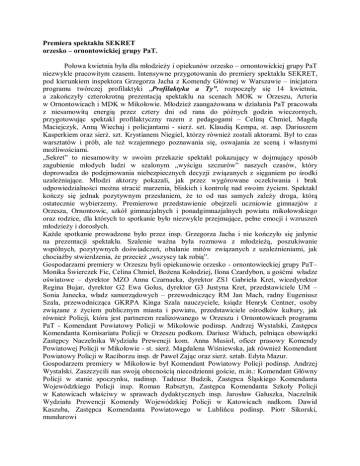 Premiera spektaklu SEKRET orzesko – ornontowickiej grupy PaT. Połowa kwietnia była dla młodzieży i opiekunów orzesko – ornontowickiej grupy PaT niezwykle pracowitym czasem. Intensywne przygotowania do premiery spektaklu SEKRET, pod kierunkiem inspektora Grzegorza Jacha z Komendy Głównej w Warszawie – inicjatora programu twórczej profilaktyki „Profilaktyka a Ty”, rozpoczęły się 14 kwietnia, a zakończyły czterokrotną prezentacją spektaklu na scenach MOK w Orzeszu, Arteria w Ornontowicach i MDK w Mikołowie. Młodzież zaangażowana w działania PaT pracowała z niesamowitą energią przez cztery dni od rana do późnych godzin wieczornych, przygotowując spektakl profilaktyczny razem z pedagogami – Celiną Chmiel, Magdą Maciejczyk, Anną Wiechaj i policjantami - sierż. szt. Klaudią Kempa, st. asp. Dariuszem Kasperkiem oraz sierż. szt. Krystianem Niegiel, którzy również zostali aktorami. Był to czas warsztatów i prób, ale też wzajemnego poznawania się, oswajania ze sceną i własnymi możliwościami. „Sekret” to niesamowity w swoim przekazie spektakl pokazujący w dojmujący sposób zagubienie młodych ludzi w szalonym „wyścigu szczurów” naszych czasów, który doprowadza do podejmowania niebezpiecznych decyzji związanych z sięganiem po środki uzależniające. Młodzi aktorzy pokazali, jak przez wygórowane oczekiwania i brak odpowiedzialności można stracić marzenia, bliskich i kontrolę nad swoim życiem. Spektakl kończy się jednak pozytywnym przesłaniem, że to od nas samych zależy droga, którą ostatecznie wybierzemy. Premierowe przedstawienie obejrzeli uczniowie gimnazjów z Orzesza, Ornontowic, szkół gimnazjalnych i ponadgimnazjalnych powiatu mikołowskiego oraz rodzice, dla których to spotkanie było niezwykle przejmujące, pełne emocji i wzruszeń młodzieży i dorosłych. Każde spotkanie prowadzone było przez insp. Grzegorza Jacha i nie kończyło się jedynie na prezentacji spektaklu. Szalenie ważna była rozmowa z młodzieżą, poszukiwanie wspólnych, pozytywnych doświadczeń, obalanie mitów związanych z uzależnieniami, jak chociażby stwierdzenia, że przecież „wszyscy tak robią”. Gospodarzami premiery w Orzeszu byli opiekunowie orzesko - ornontowieckiej grupy PaT– Monika Świerczek Fic, Celina Chmiel, Bożena Kołodziej, Ilona Czardybon, a gośćmi władze oświatowe – dyrektor MZO Anna Czarnacka, dyrektor ZS1 Gabriela Kret, wicedyrektor Regina Bujar, dyrektor G2 Ewa Golus, dyrektor G3 Justyna Kret, przedstawiciele UM – Sonia Janecka, władz samorządowych – przewodniczący RM Jan Mach, radny Eugeniusz Szala, przewodnicząca GKRPA Kinga Szala nauczyciele, ksiądz Henryk Centner, osoby związane z życiem publicznym miasta i powiatu, przedstawiciele ośrodków kultury, jak również Policji, która jest partnerem realizowanego w Orzeszu i Ornontowicach programu PaT - Komendant Powiatowy Policji w Mikołowie podinsp. Andrzej Wystalski, Zastępca Komendanta Komisariatu Policji w Orzeszu podkom. Dariusz Widuch, pełniąca obowiązki Zastępcy Naczelnika Wydziału Prewencji kom. Anna Musioł, oficer prasowy Komendy Powiatowej Policji w Mikołowie - st. sierż. Magdalena Wiśniewska, jak również Komendant Powiatowy Policji w Raciborzu insp. dr Paweł Zając oraz sierż. sztab. Edyta Mazur. Gospodarzem premiery w Mikołowie był Komendant Powiatowy Policji podinsp. Andrzej Wystalski. Zaszczycili nas swoją obecnością niecodzienni goście, m.in.: Komendant Główny Policji w stanie spoczynku, nadinsp. Tadeusz Budzik, Zastępca Śląskiego Komendanta Wojewódzkiego Policji insp. Roman Rabsztyn, Zastępca Komendanta Szkoły Policji w Katowicach właściwy w sprawach dydaktycznych insp. Jarosław Gałuszka, Naczelnik Wydziału Prewencji Komendy Wojewódzkiej Policji w Katowicach nadkom. Dawid Kaszuba, Zastępca Komendanta Powiatowego w Lublińcu podinsp. Piotr Sikorski, mundurowi z Komendy Głównej Policji, Komendy Wojewódzkiej Policji w Katowicach, słuchacze Szkoły Policji w Katowicach, policjanci z Komendy Powiatowej Policji w Mikołowie. Obecni byli samorządowcy na czele z Burmistrzem Miasta Mikołów Stanisławem Piechulą, Zastępca Burmistrza Miasta Łaziska Górne Jan Ratka, Wójt Gminy Ornontowice Kazimierz Adamczyk, Prezes Stowarzyszenia Bezpieczny Powiat Mikołowski Henryk Zawiszowski. Wszystkim osobom i instytucjom, które zaangażowały się w realizację tego przedsięwzięcia i były nam przychylne, serdecznie dziękujemy. Dzięki Wam wiemy, że działania realizowane przez orzesko – ornontowicką grupę PaT mają sens. Wiele ciepłych słów, podziękowań i pozytywnych relacji skierowanych w stronę młodzieży utwierdza nas w przekonaniu, że twórcza profilaktyka w powiecie mikołowskim ma „zielone światło”. Ilona Czardybon
