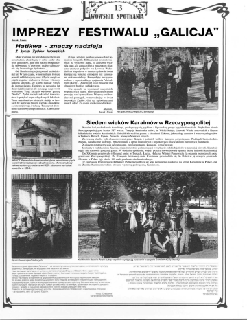 IMPREZY FESTIWALU „GALICJA" Jacek Szwic Hatikwa - znaczy nadzieja Z życia Żydów lwowskich Moja wystawa nie jest dokumentem ani reportażem, choć łączy w sobie cechy obu tych gatunków, jest ona raczej fotograficzną opowieścią o pewnym etapie odradzania się lwowskiego żydostwa. Od Shoah minęło już ponad sześćdziesiąt lat. W tym czasie, w normalnym świecie powoli zabliźniały się rany i Żydzi mogli co piątek zapalać szabasowe świece. Niestety historia sprawiła, że Lwów należał wtedy do innego świata. Dopiero na początku lat dziewięćdziesiątych do synagogi na powrót wniesiono Torę, zaczęto wydawać gazetę "Szofar", Żydzi zaczęli zakładać towarzystwa i spotykać się w odzyskanych lokalach. Teraz najmłodsi co niedzielę siadają w ławkach by uczyć się historii i języka dziadków, a potem śpiewają i tańczą. Tańczą też dorośli na szabasowych spotkaniach. Zakwita nadzieja. O tym właśnie próbuję opowiedzieć językiem fotografii. Kilkadziesiąt prezentowanych na wystawie zdjęć, to zaledwie wycinek tego, co zobaczyłem i przeżyłem podczas częstych pobytów we Lwowie. Wchodziłem stopniowo w tamten żydowski świat kierując się bardziej emocjami niż kanonami dokumentalisty. Fotografując zrezygnowałem z reporterskiego spojrzenia "chłodnym okiem". Dlatego też to co pokazuję ma charakter bardzo subiektywny. Nie sposób tu wymienić wszystkich wspaniałych ludzi, których poznawałem pracując nad tym cyklem. Wszyscy oni bardzo mi pomagali, wprowadzając w świat lwowskich Żydów. Oni też są bohaterami moich zdjęć. Za co im serdecznie dziękuję. Shalom, Jacek Szwic Na spacerze po wyjściu z synagogi, Siedem wieków Karaimów w Rzeczypospolitej HALICZ. Pierwotnie drewniana świątynia zwana kinesą była wielokrotnie niszczona i odbudowywana. Murowany budynek wzniesiony po pożarze w 1830 r. zburzono na rozkaz sowietów w 1984 r. Karaimki w strojach ludowych. Karaimi lud pochodzenia tureckiego, posługujący się językiem z kipczackiej grupy Języków tureckich. Przybyli na ziemie Rzeczypospolitej pod koniec XIV wieku. Tradycja karaimska mówi, że Wielki Książę Litewski Witold sprowadził z Krymu kilkadziesiąt rodzin karaimskich. Osiedlił ich wzdłuż granic z ziemiami Zakonu, jako załogi zamków i warownych grodów w Trokach, Birżach, Upicie, Poswolu. Nowym Mieście i Innych. Za wierną służbę byli obdarowywani przez Księcia i polskich królów licznymi przywilejami. Podlegali bezpośrednio Księciu, na ich czele stał wójt. Byli zwolnieni z opłat miastowych i rogatkowych oraz z danin i niektórych podatków. Z czasem z żołnierzy stali się rolnikami, rzemieślnikami, kupcami. Utrzymywali kontakty z rodakami na Krymie, niejednokrotnie pośredniczyli w wykupie polskich jeńców z tatarskiej niewoli. Liczebnie nigdy nie stanowili potężnej grupy. W dodatku epidemie, wojny, pożary spowodowały spadek liczby ludności karaimskiej. Do XX wieku przetrwało tylko pięć gmin: w Trokach, Łucku, Haliczu, Wilnie i Poniewieżu (ta ostatnia pozostawała poza granicami Rzeczypospolitej). Po II wojnie światowej część Karaimów przesiedliła się do Polski w jej nowych granicach. Obecnie w Polsce żyje około 100 osób pochodzenia karaimskiego. 17 czerwca w Przemyślu w Bibliotece Publicznej odbyła się sesja popularno-naukowa na temat Karaimów w Polsce, zaś na Zamku Kazimierzowskim otwarto wystawę poświęconą Karaimom. Kaidimskie dzieci z Polski i Litwy wspólnie występują na scenie w zespole SANDUHACZ (Słowik)
