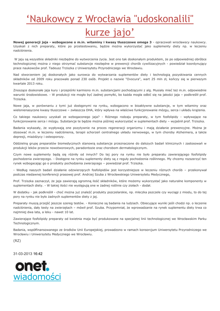‘Naukowcy z Wrocławia "udoskonalili" kurze jajo’ Nowej generacji jaja - wzbogacone o m.in. witaminy i kwasy tłuszczowe omega 3 - opracowali wrocławscy naukowcy. Uzyskali z nich preparaty, które po przetestowaniu, będzie można wykorzystać jako suplementy diety np. w leczeniu nadciśnienia. W jaju są wszystkie składniki niezbędne do wytworzenia życia. Jest ono tak doskonałym produktem, że po odpowiedniej obróbce technologicznej można z niego otrzymać substancje niezbędne w prewencji chorób cywilizacyjnych - powiedział koordynujący prace naukowców prof. Tadeusz Trziszka z Uniwersytetu Przyrodniczego we Wrocławiu. Nad stworzeniem jaj doskonałych jako surowca do wytwarzania suplementów diety i technologią pozyskiwania cennych składników od 2009 roku pracowało ponad 230 osób. Projekt o nazwie "Ovocura", wart 25 mln zł, kończy się w pierwszym kwartale 2013 roku. Znoszące doskonałe jaja kury i przepiórki karmiono m.in. substancjami pochodzącymi z alg. Musiały mieć też m.in. odpowiednie warunki środowiskowe. - W produkcji nie mogło być żadnej pomyłki, bo każda mogła odbić się na jakości jaja – podkreślił prof. Trziszka. Nowe jaja, w porównaniu z tymi już dostępnymi na rynku, wzbogacono w bioaktywne substancje, w tym witaminy oraz wielonienasycone kwasy tłuszczowe – zwłaszcza DHA, który wpływa na właściwe funkcjonowanie mózgu, serca i układu krążenia. Co takiego naukowcy uzyskali ze wzbogaconego jaja? - Różnego rodzaju preparaty, w tym fosfolipidy - wpływające na funkcjonowanie serca i mózgu. Substancje te będzie można później wykorzystać w suplementach diety – wyjaśnił prof. Trziszka. Badania wykazały, że wypływają one pozytywnie na proces regeneracji organizmu i mają działanie prewencyjne. Można je stosować m.in. w leczeniu nadciśnienia, terapii schorzeń centralnego układu nerwowego, w tym choroby Alzheimera, a także depresji, miażdżycy i osteoporozy. Oddzielną grupę preparatów biomedycznych stanowią substancje przeznaczone do dalszych badań klinicznych i zastosowań w produkcji leków przeciw nowotworowych, paradontozie oraz chorobom dermatologicznym. Czym nowe suplementy będą się różniły od innych? Do tej pory na rynku nie było preparatu zawierającego fosfolipidy pochodzenia zwierzęcego. - Dostępne na rynku suplementy diety są z reguły pochodzenia roślinnego. My chcemy rozszerzyć ten rynek wzbogacając go o produkty pochodzenia zwierzęcego – powiedział prof. Trziszka. - Według naszych badań działanie odzwierzęcych fosfolipidów jest korzystniejsze w leczeniu różnych chorób – przekonywał podczas niedawnej konferencji prasowej prof. Andrzej Szuba z Wrocławskiego Uniwersytetu Medycznego, Prof. Trziszka zaznaczył, że jaja zawierają ogromną ilość składników, które możemy wykorzystać jako naturalne komponenty w suplementach diety. - W takiej ilości nie występują one w żadnej roślinie czy ziołach - dodał. W dodatku - jak podkreślił - choć można już znaleźć produkty pszczelarskie, np. mleczka pszczele czy wyciągi z miodu, to do tej pory na rynku nie było żadnych suplementów diety z jaj. Preparaty muszą przejść jeszcze szereg testów. - Konieczne są badania na ludziach. Obiecujące wyniki jeśli chodzi np. o leczenie nadciśnienia, dały testy na zwierzętach – mówił prof. Szuba. Przypomniał, że wprowadzanie na rynek suplementu diety trwa co najmniej dwa lata, a leku - nawet 10 lat. Zawierające fosfolipidy preparaty od kwietnia maja być produkowane na specjalnej linii technologicznej we Wrocławskim Parku Technologicznym. Badania, współfinansowanego ze środków Unii Europejskiej, prowadzono w ramach konsorcjum Uniwersytetu Przyrodniczego we Wrocławiu i Uniwersytetu Medycznego we Wrocławiu. (RZ) 31-03-2013 16:42 wiadomości