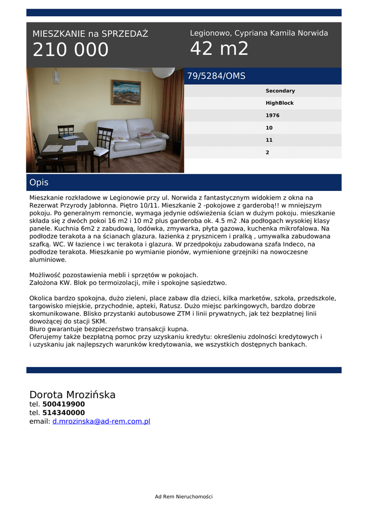 MIESZKANIE na SPRZEDAŻ 210 000 Legionowo, Cypriana Kamila Norwida 42 m2 79/5284/OMS Secondary HighBlock 1976 10 11 2 Opis Mieszkanie rozkładowe w Legionowie przy ul. Norwida z fantastycznym widokiem z okna na Rezerwat Przyrody Jabłonna. Piętro 10/11. Mieszkanie 2 -pokojowe z garderobą!! w mniejszym pokoju. Po generalnym remoncie, wymaga jedynie odświeżenia ścian w dużym pokoju. mieszkanie składa się z dwóch pokoi 16 m2 i 10 m2 plus garderoba ok. 4.5 m2 .Na podłogach wysokiej klasy panele. Kuchnia 6m2 z zabudową, lodówka, zmywarka, płyta gazowa, kuchenka mikrofalowa. Na podłodze terakota a na ścianach glazura. łazienka z prysznicem i pralką , umywalka zabudowana szafką. WC. W łazience i wc terakota i glazura. W przedpokoju zabudowana szafa Indeco, na podłodze terakota. Mieszkanie po wymianie pionów, wymienione grzejniki na nowoczesne aluminiowe. Możliwość pozostawienia mebli i sprzętów w pokojach. Założona KW. Blok po termoizolacji, miłe i spokojne sąsiedztwo. Okolica bardzo spokojna, dużo zieleni, place zabaw dla dzieci, kilka marketów, szkoła, przedszkole, targowisko miejskie, przychodnie, apteki, Ratusz. Dużo miejsc parkingowych, bardzo dobrze skomunikowane. Blisko przystanki autobusowe ZTM i linii prywatnych, jak też bezpłatnej linii dowożącej do stacji SKM. Biuro gwarantuje bezpieczeństwo transakcji kupna. Oferujemy także bezpłatną pomoc przy uzyskaniu kredytu: określeniu zdolności kredytowych i i uzyskaniu jak najlepszych warunków kredytowania, we wszystkich dostępnych bankach. Dorota Mrozińska tel. 500419900 tel. 514340000 email: [email protected] Ad Rem Nieruchomości Powered by TCPDF (www.tcpdf.org)