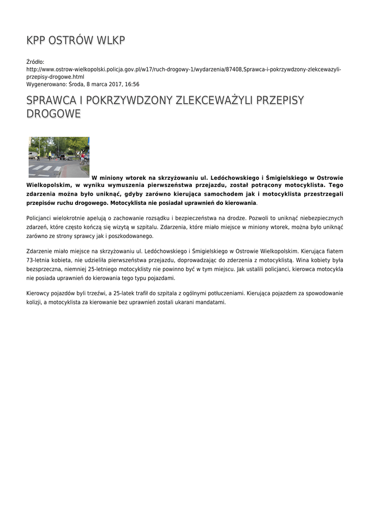 KPP OSTRÓW WLKP Źródło: http://www.ostrow-wielkopolski.policja.gov.pl/w17/ruch-drogowy-1/wydarzenia/87408,Sprawca-i-pokrzywdzony-zlekcewazyliprzepisy-drogowe.html Wygenerowano: Środa, 8 marca 2017, 16:56 SPRAWCA I POKRZYWDZONY ZLEKCEWAŻYLI PRZEPISY DROGOWE W miniony wtorek na skrzyżowaniu ul. Ledóchowskiego i Śmigielskiego w Ostrowie Wielkopolskim, w wyniku wymuszenia pierwszeństwa przejazdu, został potrącony motocyklista. Tego zdarzenia można było uniknąć, gdyby zarówno kierująca samochodem jak i motocyklista przestrzegali przepisów ruchu drogowego. Motocyklista nie posiadał uprawnień do kierowania. Policjanci wielokrotnie apelują o zachowanie rozsądku i bezpieczeństwa na drodze. Pozwoli to uniknąć niebezpiecznych zdarzeń, które często kończą się wizytą w szpitalu. Zdarzenia, które miało miejsce w miniony wtorek, można było uniknąć zarówno ze strony sprawcy jak i poszkodowanego. Zdarzenie miało miejsce na skrzyżowaniu ul. Ledóchowskiego i Śmigielskiego w Ostrowie Wielkopolskim. Kierująca fiatem 73-letnia kobieta, nie udzieliła pierwszeństwa przejazdu, doprowadzając do zderzenia z motocyklistą. Wina kobiety była bezsprzeczna, niemniej 25-letniego motocyklisty nie powinno być w tym miejscu. Jak ustalili policjanci, kierowca motocykla nie posiada uprawnień do kierowania tego typu pojazdami. Kierowcy pojazdów byli trzeźwi, a 25-latek trafił do szpitala z ogólnymi potłuczeniami. Kierująca pojazdem za spowodowanie kolizji, a motocyklista za kierowanie bez uprawnień zostali ukarani mandatami. Opr. asp. szt. Artur Kurczaba Ocena: 0/5 (0) Tweetnij