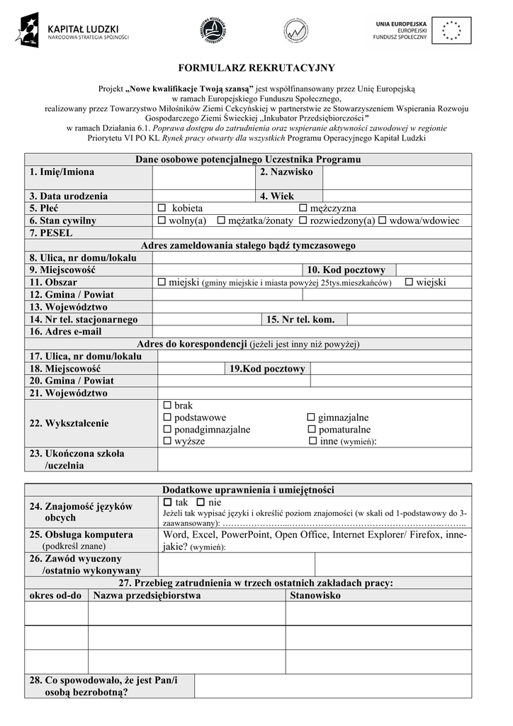 FORMULARZ REKRUTACYJNY Projekt „Nowe kwalifikacje Twoją szansą” jest współfinansowany przez Unię Europejską w ramach Europejskiego Funduszu Społecznego, realizowany przez Towarzystwo Miłośników Ziemi Cekcyńskiej w partnerstwie ze Stowarzyszeniem Wspierania Rozwoju Gospodarczego Ziemi Świeckiej „Inkubator Przedsiębiorczości” w ramach Działania 6.1. Poprawa dostępu do zatrudnienia oraz wspieranie aktywności zawodowej w regionie Priorytetu VI PO KL Rynek pracy otwarty dla wszystkich Programu Operacyjnego Kapitał Ludzki 1. Imię/Imiona 3. Data urodzenia 5. Płeć 6. Stan cywilny 7. PESEL Dane osobowe potencjalnego Uczestnika Programu 2. Nazwisko 4. Wiek kobieta mężczyzna wolny(a) mężatka/żonaty rozwiedzony(a) wdowa/wdowiec Adres zameldowania stałego bądź tymczasowego 8. Ulica, nr domu/lokalu 9. Miejscowość 10. Kod pocztowy 11. Obszar miejski (gminy miejskie i miasta powyżej 25tys.mieszkańców) 12. Gmina / Powiat 13. Województwo 14. Nr tel. stacjonarnego 15. Nr tel. kom. 16. Adres e-mail Adres do korespondencji (jeżeli jest inny niż powyżej) 17. Ulica, nr domu/lokalu 18. Miejscowość 19.Kod pocztowy 20. Gmina / Powiat 21. Województwo brak podstawowe gimnazjalne 22. Wykształcenie ponadgimnazjalne pomaturalne wyższe inne (wymień): 23. Ukończona szkoła /uczelnia 24. Znajomość języków obcych 25. Obsługa komputera (podkreśl znane) wiejski Dodatkowe uprawnienia i umiejętności tak nie Jeżeli tak wypisać języki i określić poziom znajomości (w skali od 1-podstawowy do 3zaawansowany): …………………...…………………………………………………….. Word, Excel, PowerPoint, Open Office, Internet Explorer/ Firefox, innejakie? (wymień): 26. Zawód wyuczony /ostatnio wykonywany 27. Przebieg zatrudnienia w trzech ostatnich zakładach pracy: okres od-do Nazwa przedsiębiorstwa Stanowisko 28. Co spowodowało, że jest Pan/i osobą bezrobotną? Obecny status uczestnika projektu: 29. Należę do następujących/-ej grup/-y: osoby bezrobotne pozostające bez zatrudnienia łącznie przez okres ponad 12 tak nie miesięcy w ciągu ostatnich 2 lat (długotrwale bezrobotne) osoby pozostające bez zatrudnienia zarejestrowane w powiatowym urzędzie tak nie pracy jako bezrobotne osoby pozostające bez zatrudnienia zarejestrowane w powiatowym urzędzie tak nie pracy jako poszukujące pracy kobiety wchodzące po raz pierwszy na rynek pracy po przerwie związanej tak nie z urodzeniem i wychowaniem dzieci tak nie tak nie tak nie osoby pozostające bez zatrudnienia zamieszkujące w gminach wiejskich, miejskowiejskich lub miastach do 25 tys. mieszkańców zamierzających podjąć zatrudnienie w obszarach nie związanych z produkcją roślinną i/lub zwierzęcą osoby do 25 roku życia osoby niepełnosprawne 30. Czy jest Pan/i zarejestrowana w Powiatowym Urzędzie Pracy jako osoba bezrobotna? 31. W jakim zawodzie poszukuje Pan/i pracy? tak nie 32. W jaki sposób poszukuje Pan/i pracy? ........................................................................................................... 33. Co w największym stopniu utrudnia Panu/i znalezienie pracy? ........................................................................................................... 34. Uzasadnij zainteresowanie uczestnictwem w powyższym programie: 35. Z jakich szkoleń w ramach programu chciał/aby Pan/i skorzystać? ........................................................................................................... ........................................................................................................... ........................................................................................................... ........................................................................................................... ........................................................................................................... ........................................................................................................... asystent ekonomiczny (wymagane co najmniej średnie wykształcenie) pracownik biurowy obsługa kasy fiskalnej obsługa wózków widłowych kucharz małej gastronomii 36. Czy wychowuje Pan/i samotnie dzieci lub opiekuje się osobą zależną? 37. Czy uczestniczył/a Pan/i w ciągu ostatnich 12 miesięcy w szkoleniach/ kursach z Europejskiego Funduszu Społecznego mających na celu podnoszenie kwalifikacji osób bezrobotnych? tak nie tak nie Wyrażam zgodę na wykorzystywanie i przetwarzanie moich danych osobowych w procesie rekrutacji i promocji projektu „Nowe kwalifikacje Twoją szansą” realizowanego przez Towarzystwo Miłośników Ziemi Cekcyńskiej w partnerstwie z Stowarzyszeniem Wspierania Rozwoju Gospodarczego Ziemi Świeckiej „Inkubator Przedsiębiorczości”, do celów monitoringu oraz ewaluacji Programu Operacyjnego Kapitał Ludzki (zgodnie z przepisami ustawy z dnia 29 sierpnia 1997 r. o ochronie danych osobowych - Dz. U. z 2002 r., Nr 101, poz. 926 z późn. zm.). Data i czytelny podpis potencjalnego Uczestnika Podpis osoby przyjmującej wniosek Programu: