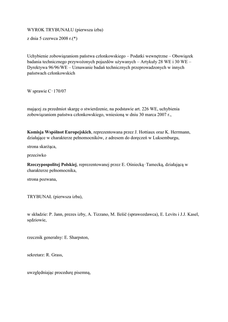 WYROK TRYBUNAŁU (pierwsza izba) z dnia 5 czerwca 2008 r.(*) Uchybienie zobowiązaniom państwa członkowskiego – Podatki wewnętrzne – Obowiązek badania technicznego przywożonych pojazdów używanych – Artykuły 28 WE i 30 WE – Dyrektywa 96/96/WE – Uznawanie badań technicznych przeprowadzonych w innych państwach członkowskich W sprawie C‑170/07 mającej za przedmiot skargę o stwierdzenie, na podstawie art. 226 WE, uchybienia zobowiązaniom państwa członkowskiego, wniesioną w dniu 30 marca 2007 r., Komisja Wspólnot Europejskich, reprezentowana przez J. Hottiaux oraz K. Herrmann, działające w charakterze pełnomocników, z adresem do doręczeń w Luksemburgu, strona skarżąca, przeciwko Rzeczypospolitej Polskiej, reprezentowanej przez E. Ośniecką‑Tamecką, działającą w charakterze pełnomocnika, strona pozwana, TRYBUNAŁ (pierwsza izba), w składzie: P. Jann, prezes izby, A. Tizzano, M. Ilešič (sprawozdawca), E. Levits i J.J. Kasel, sędziowie, rzecznik generalny: E. Sharpston, sekretarz: R. Grass, uwzględniając procedurę pisemną, podjąwszy, po wysłuchaniu rzecznika generalnego, decyzję o rozstrzygnięciu sprawy bez opinii, wydaje następujący Wyrok 1 Komisja Wspólnot Europejskich wnosi w skardze do Trybunału o stwierdzenie, że poprzez wprowadzenie wymogu pierwszego badania technicznego przywożonych na terytorium Rzeczypospolitej Polskiej pojazdów używanych przed ich pierwszą rejestracją na tym terytorium (zwanego dalej „spornym badaniem technicznym”), wobec braku podobnego wymogu w stosunku do krajowych pojazdów znajdujących się w tych samych okolicznościach, Rzeczpospolita Polska uchybiła zobowiązaniom, które ciążą na niej na mocy art. 28 WE. Ramy prawne Uregulowania wspólnotowe 2 Artykuł 3 ust. 1 i 2 dyrektywy Rady 96/96/WE z dnia 20 grudnia 1996 r. w sprawie zbliżenia ustawodawstw państw członkowskich dotyczących badań przydatności do ruchu drogowego pojazdów silnikowych i ich przyczep (Dz.U. 1997, L 46, s. 1) stanowi: „1. Państwa członkowskie podejmują takie środki, jakie uznają za niezbędne, w celu umożliwienia wykazania, że pojazd przeszedł badania techniczne z pozytywnym rezultatem, które co najmniej odpowiadają wymogom niniejszej dyrektywy. Środki te są notyfikowane pozostałym państwom członkowskim oraz Komisji. 2. Każde państwo członkowskie uznaje dowód wydany w innym państwie członkowskim świadczący, że pojazd silnikowy zarejestrowany na terytorium tego państwa, razem z przyczepą lub naczepą, przeszedł z pozytywnym rezultatem badania techniczne, które co najmniej odpowiadają wymogom niniejszej dyrektywy”. 3 Zgodnie z art. 5 dyrektywy 96/96: „Nie naruszając przepisów zawartych w załącznikach I i II, państwa członkowskie mogą: – oznaczyć wcześniejszą datę pierwszego obowiązkowego badania technicznego oraz, jeżeli jest to wskazane, badania przed rejestracją pojazdu, […] – zwiększyć ilość podzespołów podlegających badaniu, […] – wprowadzić obowiązek specjalnych dodatkowych badań technicznych, […]”. 4 Artykuł 4 dyrektywy Rady 1999/37/WE z dnia 29 kwietnia 1999 r. w sprawie dokumentów rejestracyjnych pojazdów (Dz.U. L 138, s. 57) ma następujące brzmienie: „Do celów niniejszej dyrektywy świadectwo rejestracji wydane przez państwo członkowskie jest uznawane przez inne państwa członkowskie do celów identyfikacji pojazdu w ruchu międzynarodowym lub jego ponownej rejestracji w innym państwie członkowskim”. Uregulowania polskie 5 Zgodnie z art. 73 ust. 1 ustawy z dnia 20 czerwca 1997 r. Prawo o ruchu drogowym (Dz.U. z 2005 r., nr 108, poz. 908) rejestracji pojazdu dokonuje, na wniosek właściciela, starosta – organ posiadający kompetencje między innymi w zakresie rejestracji pojazdów – właściwy ze względu na miejsce jego zamieszkania (siedzibę), wydając dowód rejestracyjny i zalegalizowane tablice (tablicę) rejestracyjne oraz nalepkę kontrolną, jeżeli jest wymagana. Na mocy art. 72 ust. 1 pkt 4 tej ustawy starosta dokonuje tej rejestracji w szczególności na podstawie zaświadczenia o pozytywnym wyniku badania technicznego rzeczonego pojazdu, jeżeli jest wymagane. 6 Artykuł 81V wskazanej ustawy stanowi: „1. Właściciel pojazdu samochodowego […] jest obowiązany przedstawiać go do badania technicznego. 2. Pierwsze badanie techniczne jest przeprowadzane przed pierwszą rejestracją. Badaniu temu nie podlega nowy pojazd, na którego typ zostało wydane świadectwo homologacji lub decyzja zwalniająca z obowiązku homologacji, z wyjątkiem taksówki osobowej, pojazdu uprzywilejowanego lub pojazdu odpowiednio przystosowanego lub wyposażonego zgodnie z przepisami o przewozie drogowym towarów niebezpiecznych”. 7 Paragraf 2 rozporządzenia Ministra Infrastruktury z dnia 16 grudnia 2003 r. w sprawie zakresu i sposobu przeprowadzania badań technicznych pojazdów oraz wzorów dokumentów stosowanych przy tych badaniach (Dz.U. z 2003 r., nr 227, poz. 2250), zmienionego rozporządzeniem Ministra Infrastruktury z dnia 9 listopada 2004 r. (Dz.U. z 2004 r., nr 249, poz. 2499), ustanawia następujące kategorie badań technicznych: „2.1. Badania techniczne dzieli się na: 1) okresowe; 2) pierwsze dotyczące: a) pojazdu odpowiednio przystosowanego lub wyposażonego zgodnie z przepisami o przewozie drogowym towarów niebezpiecznych, b) taksówki osobowej, c) pojazdu uprzywilejowanego, d) pojazdu zarejestrowanego po raz pierwszy za granicą (przed rejestracją w kraju), e) nowego pojazdu wyprodukowanego lub importowanego w ilości jednej sztuki rocznie; […] 4) dodatkowe – dotyczące pojazdu skierowanego na badanie techniczne przez starostę w celu ustalenia danych pojazdu niezbędnych do jego rejestracji; […] 11) dodatkowe – dotyczące pojazdu sprowadzonego z zagranicy i noszącego ślady uszkodzeń lub którego stan techniczny wskazuje na naruszenie elementów nośnych konstrukcji pojazdu, mogących stw