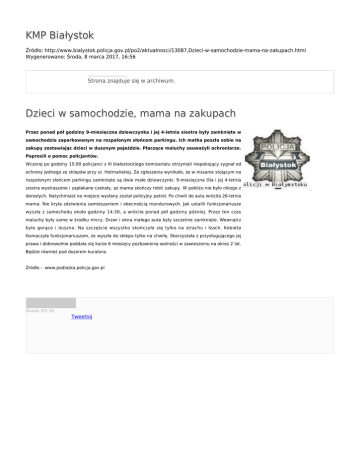 KMP Białystok Źródło: http://www.bialystok.policja.gov.pl/po2/aktualnosci/13087,Dzieci-w-samochodzie-mama-na-zakupach.html Wygenerowano: Środa, 8 marca 2017, 16:56 Strona znajduje się w archiwum. Dzieci w samochodzie, mama na zakupach Przez ponad pół godziny 9-miesięczna dziewczynka i jej 4-letnia siostra były zamknięte w samochodzie zaparkowanym na rozpalonym słońcem parkingu. Ich matka poszła sobie na zakupy zostawiając dzieci w dusznym pojeździe. Płaczące maluchy zauważyli ochroniarze. Poprosili o pomoc policjantów. Wczoraj po godziny 15:00 policjanci z III białostockiego komisariatu otrzymali niepokojący sygnał od ochrony jednego ze sklepów przy ul. Hetmańskiej. Ze zgłoszenia wynikało, że w nissanie stojącym na rozpalonym słońcem parkingu zamknięte są dwie małe dziewczynki. 9-miesięczna Ola i jej 4-letnia siostra wystraszone i zapłakane czekały, aż mama skończy robić zakupy. W pobliżu nie było nikogo z dorosłych. Natychmiast na miejsce wysłany został policyjny patrol. Po chwili do auta wróciła 26-letnia mama. Nie kryła zdziwienia zamieszaniem i obecnością mundurowych. Jak ustalili funkcjonariusze wyszła z samochodu około godziny 14:30, a wróciła ponad pół godziny później. Przez ten czas maluchy były same w środku micry. Drzwi i okna małego auta były szczelnie zamknięte. Wewnątrz było gorąco i duszno. Na szczęście wszystko skończyło się tylko na strachu i łzach. Kobieta tłumaczyła funkcjonariuszom, że wyszła do sklepu tylko na chwilę. Skorzystała z przysługującego jej prawa i dobrowolnie poddała się karze 6 miesięcy pozbawienia wolności w zawieszeniu na okres 2 lat. Będzie również pod dozorem kuratora. Źródło - www.podlaska.policja.gov.pl Ocena: 0/5 (0) Tweetnij