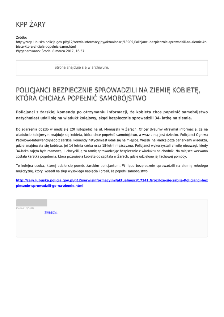 KPP ŻARY Źródło: http://zary.lubuska.policja.gov.pl/g12/serwis-informacyjny/aktualnosci/18909,Policjanci-bezpiecznie-sprowadzili-na-ziemie-ko biete-ktora-chciala-popelnic-samo.html Wygenerowano: Środa, 8 marca 2017, 16:57 Strona znajduje się w archiwum. POLICJANCI BEZPIECZNIE SPROWADZILI NA ZIEMIĘ KOBIETĘ, KTÓRA CHCIAŁA POPEŁNIĆ SAMOBÓJSTWO Policjanci z żarskiej komendy po otrzymaniu informacji, że kobieta chce popełnić samobójstwo natychmiast udali się na wiadukt kolejowy, skąd bezpiecznie sprowadzili 34- latkę na ziemię. Do zdarzenia doszło w niedzielę (20 listopada) na ul. Moniuszki w Żarach. Oficer dyżurny otrzymał informację, że na wiadukcie kolejowym znajduje się kobieta, która chce popełnić samobójstwo, a wraz z nią jest dziecko. Policjanci Ogniwa Patrolowo-Interwencyjnego z żarskiej komendy natychmiast udali się na miejsce. Weszli na kładkę poza barierkami wiaduktu, gdzie znajdowała się kobieta, jej 14 letnia córka oraz 18-letni mężczyzna. Policjanci wykorzystali chwilę nieuwagi, kiedy 34-latka zajęta była rozmową i chwycili ją za ramię sprowadzając bezpiecznie z wiaduktu na chodnik. Na miejsce wezwana została karetka pogotowia, która przewiozła kobietę do szpitala w Żarach, gdzie udzielono jej fachowej pomocy. To kolejna osoba, której udało się pomóc żarskim policjantom. W lipcu bezpiecznie sprowadzili na ziemię młodego mężczyznę, który wszedł na słup wysokiego napięcia i groził, że popełni samobójstwo. http://zary.lubuska.policja.gov.pl/g12/serwisinformacyjny/aktualnosci/17141,Grozil-ze-sie-zabije-Policjanci-bez piecznie-sprowadzili-go-na-ziemie.html Ocena: 0/5 (0) Tweetnij