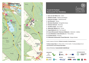 ZWIER ZYNIEC 4 4 Land Art Festiwal Roztoczański Park Narodowy 13 3 2 6 4 12 1 8 9 7 5 2-12 lipca 2014 ROZTOCZAÑSKI PARK NARODOWY 1 Karin van der Molen (NL) - Listen 2 Waldemar Rudyk - Obiekty przenikające 3 Katarzyna Szczypior - Nieskończoność 4 Ked Olszewski - Pokusa 5 Mirosław Maszlanko -Tomografia drzewa 6 Bolesław Stelmach - Rozmowa 7 Jarosław Lustych - Axis mundi 8 Aleksander Nikitiuk (UA) - Forma 9 Sergiy Radkevich (UA) - Św. Krzysztof 10 Cezary Klimaszewski i Katarzyna Wójtowicz - Zależności - obiekty 11 Laura Bistrakova i Iveta Heinacka (LV) - Time surface 12 Jarosław Koziara - Procesja 13 Aleksandra Szulimowska i Paweł Marcinek - Grające drzewo kurator programu festiwalu / Barbara Luszawska / Jarosław Koziara Fundacja Latająca Ryba / ul. Olejna 10/4 / 20-114 Lublin / [email protected] www.facebook.com/FundacjaLatajacaRyba 10 strona festiwalu / www.landart.lubelskie.pl WSPÓŁORGANIZATOR 11 FLOR IANK A SPONSOR