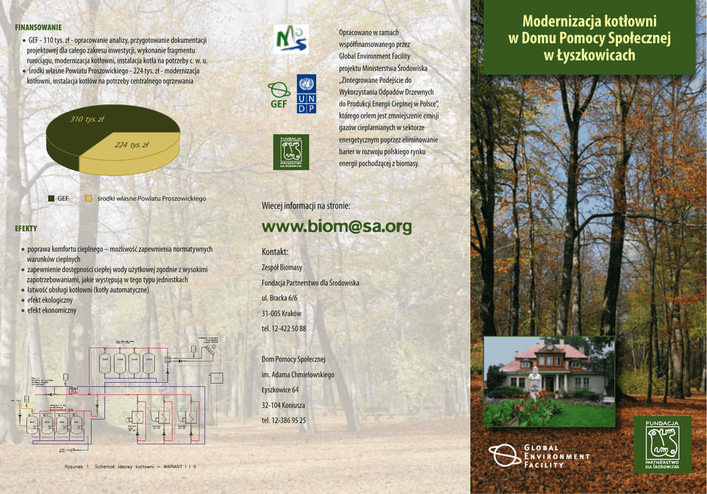 FINANSOWANIE GEF - 310 tys. zł - opracowanie analizy, przygotowanie dokumentacji projektowej dla całego zakresu inwestycji, wykonanie fragmentu rurociągu, modernizacja kotłowni, instalacja kotła na potrzeby c. w. u. środki własne Powiatu Proszowickiego - 224 tys. zł - modernizacja kotłowni, instalacja kotłów na potrzeby centralnego ogrzewania Opracowano w ramach współfinansowanego przez Global Environment Facility projektu Ministerstwa Środowiska „Zintegrowane Podejście do Wykorzystania Odpadów Drzewnych do Produkcji Energii Cieplnej w Polsce”, którego celem jest zmniejszenie emisji gazów cieplarnianych w sektorze energetycznym poprzez eliminowanie barier w rozwoju polskiego rynku energii pochodzącej z biomasy. • • 310 tys. zł 224 tys. zł GEF środki własne Powiatu Proszowickiego Wiecej informacji na stronie: EFEKTY • poprawa komfortu cieplnego – możliwość zapewnienia normatywnych warunków cieplnych • zapewnienie dostępności ciepłej wody użytkowej zgodnie z wysokimi zapotrzebowaniami, jakie występują w tego typu jednostkach • łatwość obsługi kotłowni (kotły automatyczne) • efekt ekologiczny • efekt ekonomiczny Kontakt: Zespół Biomasy Fundacja Partnerstwo dla Środowiska ul. Bracka 6/6 31-005 Kraków tel. 12-422 50 88 Dom Pomocy Społecznej im. Adama Chmielowskiego Łyszkowice 64 32-104 Koniusza tel. 12-386 95 25 Modernizacja kotłowni w Domu Pomocy Społecznej w Łyszkowicach Dom Pomocy Społecznej im. Adama Chmielowskiego położony jest w Małopolsce we wsi Łyszkowice, w powiecie proszowickim. DPS zapewnia całodobową opiekę 130 pensjonariuszom, a dodatkowych 25 podopiecznych przebywa w nim podczas dnia. Ośrodek zaspokaja potrzeby bytowe mieszkańców oraz zapewnia opiekę pielęgniarską i podstawową rehabilitację leczniczą. DPS zatrudnia 93 osoby. Całkowita powierzchnia ośrodka wynosi 21,5 ha, z czego 8 ha związane jest bezpośrednio z działalnością na rzecz mieszkańców, a pozostała część gruntów wchodzi w skład Gospodarstwa Pomocniczego. Na terenie ośrodka znajduje się 9 budynków o różnym przeznaczeniu zasilanych w ciepło z centralnej wolnostojącej kotłowni. W 2005 roku w ramach projektu GEF wykonano analizę stanu systemu ciepłowniczego oraz zapotrzebowania na moc i energię na potrzeby centralnego ogrzewania i produkcji ciepłej wody użytkowej. Analiza ta wykazała zły stan techniczny systemu ciepłowniczego DPS oraz niedogrzanie większości budynków w okresie zimowym. PODJĘTE DZIAŁANIA Analiza opcji modernizacji systemu centralnego ogrzewania i przygotowania c.w.u. W ramach projektu GEF Fundacja Partnerstwo dla Środowiska zleciła wykonanie analizy różnych wariantów modernizacji systemu centralnego ogrzewania i przygotowania ciepłej wody użytkowej. Zakres dalszych prac wykonanie prac termomodernizacyjnych zalecanych w przyjętej koncepcji modernizacji (m .in. ocieplenie stropów i ścian zewnętrznych, modernizacja instalacji wewnętrznych) podłączenie pralnic w budynku gospodarczym do instalacji centralnej ciepłej wody użytkowej w celu obniżenia kosztów użytkowania pralnic (około 3000 zł rocznie) • • Poniższy wykres przedstawia podstawowe parametry analizowanych opcji (wyliczenia oparte na cenach z VII 2005 r.). 1809 1800 1600 1400 warianty modernizacji stan wyjściowy tys. zł 1200 STAN WYJŚCIOWY 1000 800 Wyeksploatowany system produkcji i dystrybucji ciepła w centralnej kotłowni zainstalowane były dwa, wyeksploatowane i ulegające częstym awariom kotły ECa IV o mocy 430 kW każdy, opalane koksem i węglem sieć ciepłownicza była w złym stanie technicznym, z zauważalnymi ubytkami izolacji 600 • • • • Duże i nierównomierne w ciągu doby zużycie c.w.u. specyfika obiektu (częste kąpiele pensjonariuszy) niedziałająca cyrkulacja c.w.u. wysokie ciśnienie w sieci wodociągowej (około 6 bar w kotłowni) nieoszczędne wylewki - starego typu, bez perlatorów • • • • Znaczne niedogrzanie budynków spowodowane oszczędnościami drogiego opału oraz rozregulowaniem instalacji c.o. • 0 435 437 435 225 200 • Niewydajny system produkcji ciepłej wody użytkowej ciepła woda wytwarzana była w dwóch kotłach na drewno kawałkowe typu Atmos o mocy 25 kW każdy układ c.w.u. był nieprzystosowany do szczytowych dużych poborów ciepłej wody według danych obliczeniowych średnie zapotrzebowanie na moc do produkcji c.w.u. wynosi 125 kW, natomiast w chwilach szczytowego poboru wartość ta jest wielokrotnie większa 400 400 261 268 321 204 206 0 koks brykiet pelety Nakłady inwestycyjne biomasa+gaz gaz+olej pompa ciepła+olej Koszty eksploatacji Władze Powiatu Proszowickiego do realizacji wybrały wariant oparty o biomasę, jako najbardziej korzystny pod względem ekonomicznym i technicznym. Zakres wykonanych prac instalacja kotła o mocy 233 kW na potrzeby wytwarzania ciepłej wody użytkowej instalacja dwóch kotłów o mocy 160 kW każdy na potrzeby centralnego ogrzewania instalacja dwóch zbiorników akumulacyjnych o pojemności 2000 l każdy oraz wymiennika do wstępnego podgrzewania wody wymiana układu pomp zabudowa komina oraz prace elektryczne i budowlane w pomieszczeniu kotłowni wykonanie fragmentu rurociągu do dystrybucji ciepłej wody użytkowej • • • • • • Zainstalowane kotły Bioplex (HL) firmy Thermostahl przystosowane są do spalania wielu rodzajów paliwa biomasowego, tj. pellet, zrębek drzewnych, a także ziarna owsa. Zaletą takiego rozwiązania jest uniezależnienie się od dostępności jednego rodzaju paliwa oraz wahań cenowych na rynku.