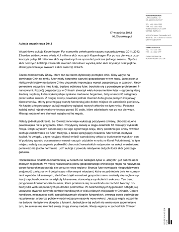17 września 2012 KLO/at/AAs/pol Aukcja wrześniowa 2012 Wrześniowa aukcja Kopenhagen Fur stanowiła uwieńczenie sezonu sprzedażowego 2011/2012. Z bardzo zróżnicowaną ofertą 4,1 miliona skór norczych Kopenhagen Fur po raz pierwszy przekroczyła pułap 20 milionów skór wystawionych na sprzedaż podczas jednego sezonu. Oprócz skór norczych kolekcja zawierała również rekordowo wysoką ilość skór szynszyli oraz piękne, atrakcyjne kolekcje swakara i skór zwierząt dzikich. Sezon zdominowały Chiny, które raz za razem dyktowały porządek dnia. Silny wpływ na dominację Chin na rynku futer miały korzystne warunki gospodarcze w tym kraju. Jako jeden z nielicznych krajów na świecie Chiny utrzymały imponujący wzrost gospodarczy w czasach, kiedy generalnie wszystkie inne kraje, będące odbiorcą futer, borykały się z poważnymi problemami finansowymi. Rozwój gospodarczy w Chinach stworzył wielu konsumentów futer – ogromną klasę średnią i wyższą, która wykorzystuje zyskane niedawno bogactwo, żeby unaocznić osiągnięty przez siebie sukces. Z drugiej strony powstała jednak również duża grupa pełnych inicjatywy biznesmenów, którzy postrzegają branżę futrzarską jako dobre miejsce do zarobienia pieniędzy. Na każdej z tegorocznych aukcji mogliśmy oglądać nowych aktorów na tym rynku. Podczas każdej aukcji rejestrowaliśmy typowo ponad 50 osób, które odwiedzały nas po raz pierwszy. Miesiąc wrzesień nie stanowił wyjątku od tej reguły. Należy jednak podkreślić, że również inne kraje wykazują pozytywne zmiany, chociaż są one powolniejsze niż w przypadku Chin. Pozytywny rozwój w ciągu ostatnich 12 miesięcy wykazała Rosja. Dzięki wysokim cenom ropy do tego ogromnego kraju, który podobnie jak Chiny również cechuje zamiłowanie do futer, tradycja, a także sprzyjający noszeniu futer klimat, napływa kapitał. W związku z tym rosyjscy klienci wnieśli wartościowy wkład w budowanie wysokich cen. W podobny sposób obserwujemy wzrost naszych udziałów w rynku w Korei Południowej. W tym miejscu należy szczególnie podkreślić obecność koreańskich nabywców na aukcji wrześniowej, ponieważ nie jest to normalnie „ich” aukcja z powodu relatywnie dużych ilości skór gorszego gatunku. Rozszerzenie działalności futrzarskiej w Kinach nie nastąpiło tylko w „starych”, już dobrze nam znanych regionach. W miarę realizowania planu gospodarczego chińskiego rządu na naszym radarze futrzarskim pojawiają się coraz to nowe regiony. Branża futer nawiązała niespodziewanie znajomość z nieznanymi dotychczas milionowymi miastami, które wcześniej nie były konsumentami wyrobów luksusowych, ale które dzięki wzrostowi gospodarczemu znalazły się nagle w sytuacji zapotrzebowania na artykuły luksusowe, stanowiące symbole ich sukcesu. Ten trend przypomina konsumenckie tsunami, które przetacza się ze wschodu na zachód, tworząc dobrobyt dla wielu napotkanych po drodze podmiotów. W nadchodzących tygodniach odbędą się uroczyste otwarcia nowych centrów handlowych w wielu różnych miejscach w Chinach. Centra handlowe, mieszczące setki specjalistycznych sklepów futrzarskich, otworzą swoje podwoje po raz pierwszy, a branża pobije w nadchodzącym sezonie nowy rekord. Jeszcze nigdy wcześniej na świecie nie było tylu sklepów z futrami. Jednakże w tej euforii nie wolno nam zapomnieć o tym, że sukces ma również swoją drugą stronę medalu. Kiedy regiony w zachodnich Chinach przeżywają rosnący wzrost, wzrasta również zapotrzebowanie na siłę roboczą i rośnie poziom wynagrodzeń. W związku z tym trudniej będzie utrzymać siłę roboczą w regionach, w których obecnie zakotwiczona jest większość branży futrzarskiej. Wiele fabryk na wschodzie było prowadzonych przez siłę roboczą z zachodu, a obecnie potrzeba będzie więcej pieniędzy w worku z wynagrodzeniami, jeżeli zdolni pracownicy mają pozostać z dala od swoich rodzin. Należy się również liczyć z tym, że nadzieje niektórych osób rozwieją się w miarę rozbudowy zdolności produkcyjnych w Chinach. Konkurencja wzrasta, a zysk maleje, co w konsekwencji wywrze presję na surowiec. Innym efektem takiej sytuacji będzie wzrost produkcji skór w Chinach. Wzrost cen skór spowodował również wzrost zainteresowania hodowlą norek. Nadal nie jesteśmy w stanie podać dokładnych danych liczbowych, jeżeli chodzi o ilość produkowanych w Chinach skór, ale wzrost tej produkcji jest mierzony w milionach. Część skór jest sprzedawana bardzo wcześnie w sezonie i w związku z właśnie przeprowadzoną aukcją otrzymaliśmy informacje, że sprzedaż z ferm w Chinach trwa na dobre, oraz że poziom cenowy był generalnie o 10 do 15% niższy w porównaniu z poziomem czerwcowym. Tego rodzaju doniesienia w powiązaniu z informacjami o bardzo „spokojnym" lecie w branży futrzarskiej nie były tymi informacjami, które chcieliśmy usłyszeć przed rozpoczęciem naszej aukcji wrześniowej. Ze względu na bardzo ponure doniesienia byliśmy przygotowani na aukcję, przypominającą aukcję czerwcową, kiedy kilka odmian cieszyło się silną konkurencją i dobrymi cenami, podczas gdy pozostałe odnotowały spadek rzędu do 7%. Jednak w miarę zbliżania się aukcji zaobserwowaliśmy jakiś ruch w branży. Swój udział w aukcji zgłosiło wielu chińskich klientów, a sprzedaż futer w Chinach miała się lepiej. Spodziewana liczba klientów wzrosła od oczekiwanych 400-500 do ponad 500, a coraz większa liczba klientów wyrażała optymizm, jeżeli chodzi o rozwój cen. Wynik aukcji nas nie zawiódł. Od samego początku aukcji widoczna była duża aktywność, wzrost cen odnotowały w szczególności generalnie skóry norek mutacyjnych oraz skóry samców. Podczas wielu ostatnich aukcji Kopenhagen Fur przesyłał w ramach dodatkowych usług wiadomości SMS, zawierające informacje o średniej cenie oraz cenowej różnicy procentowej dl