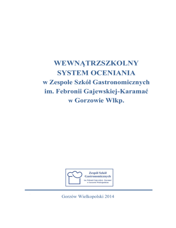 WEWNĄTRZSZKOLNY SYSTEM OCENIANIA w Zespole Szkół Gastronomicznych im. Febronii Gajewskiej-Karamać w Gorzowie Wlkp. Gorzów Wielkopolski 2014 Podstawa prawna 1. Ustawa o systemie oświaty z dnia 7 września 1991 r. wraz z późniejszymi zmianami. 2. Rozporządzenie MENiS z dnia 31stycznia 2002 r. w sprawie ramowych statutów publicznego przedszkola oraz publicznych szkół. 3. Rozporządzenie Ministra Edukacji Narodowej z dnia 30 kwietnia 2007 r. w sprawie warunków i sposobu oceniania, klasyfikowania i promowania uczniów i słuchaczy oraz przeprowadzania sprawdzianów i egzaminów w szkołach publicznych. 4. Rozporządzenie MEN z dnia 27 sierpnia 2012 r. w sprawie podstawy programowej wychowania przedszkolnego oraz kształcenia ogólnego w poszczególnych typach szkół. 5. Rozporządzenie MEN z dnia 7 lutego 2012 r. w sprawie podstawy programowej kształcenia w zawodach. 6. Rozporządzenie Ministra Edukacji Narodowej z dnia 30 kwietnia 2013 r. w sprawie udzielania i organizacji pomocy psychologiczno- pedagogicznej w publicznych przedszkolach, szkołach i placówkach. 1 I. Zasady ogólne §1. 1. Wewnątrzszkolny System Oceniania, zwany dalej WSO, określa zasady oceniania, klasyfikowania i promowana uczniów w Zespole Szkół Gastronomicznych im. Febronii Gajewskiej-Karamać w Gorzowie Wlkp. i stanowi integralną część Statutu Szkoły. II. Cele oceniania wewnątrzszkolnego §2. 1. Wspieranie rozwoju ucznia. 2. Informowanie ucznia o poziomie jego osiągnięć edukacyjnych i jego zachowaniu oraz o postępach w tym zakresie. 3. Pełnienie roli motywacyjno-kształtującej, uczenie samodzielności, systematyczności, samokontroli i samooceny. 4. Dostarczenie uczniowi informacji zwrotnej niezbędnej do planowania jego dalszej nauki. 5. Dostarczenie rodzicom/prawnym opiekunom bieżących informacji o postępach, uzdolnieniach i problemach ich dzieci. 6. Umożliwienie nauczycielom doskonalenia organizacji i metod pracy dydaktyczno-wychowawczej. III. Zakres oceniania wewnątrzszkolnego §3. 1. Ocenianiu podlegają osiągnięcia edukacyjne i zachowanie ucznia. 2. Ocenianie osiągnięć edukacyjnych polega na rozpoznaniu przez nauczyciela poziomu i postępów w opanowaniu przez ucznia wiadomości i umiejętności w stosunku do wymagań edukacyjnych wynikających z podstawy programowej i programu nauczania. 3. Ocenianie zachowania ucznia polega na rozpoznaniu przez wychowawcę klasy, nauczycieli oraz uczniów danej klasy stopnia respektowania przez ucznia zasad współżycia społecznego, norm etycznych oraz obowiązków określonych w Statucie Szkoły. §4. 1. Zasady oceniania religii i etyki określają odrębne przepisy. IV. Warunki i sposób przekazywania rodzicom/prawnym opiekunom informacji o postępach i trudnościach ucznia w nauce i zachowaniu - informacji o własnych postępach i trudnościach w nauce. §5. 1. Szkoła organizuje dwie formy przekazywania rodzicom/prawnym opiekunom informacji o postępach i trudnościach ucznia w nauce i zachowaniu. Są to spotkania z rodzicami oraz dni otwarte 2. Obowiązkiem rodziców/prawnych opiekunów jest uczestniczenie w formach kontaktu proponowanych przez szkołę. 3. Na pierwszym w danym roku szkolnym spotkaniu z rodzicami wychowawca klasy przekazuje rodzicom\prawnym opiekunom harmonogram spotkań. 4. Harmonogram zawiera: 1. terminy spotkań z rodzicami, 2. terminy dni otwartych, 2 3. numery szkolnych telefonów, 4. adres strony internetowej szkoły. 5. Uczeń ma obowiązek usprawiedliwić swoją nieobecność w szkole w pierwszym dniu obecności lub na najbliższych zajęciach z wychowawcą klasy. 6. O dłuższej nieobecności (powyżej 3 dni) rodzic/prawny opiekun jest zobowiązany powiadomić szkołę. 7. Jedyną formą usprawiedliwienia nieobecności dla ucznia klasy ZSZ jest zwolnienie lekarskie lub inne wynikające z Kodeksu Pracy. 8. Pozostałych uczniów obowiązuje pisemna forma usprawiedliwienia na jednolitych drukach szkolnych, które rodzice/prawni opiekunowie otrzymują od wychowawcy klasy na pierwszym w danym roku szkolnym spotkaniu. 9. Druk szkolnego usprawiedliwienia nieobecności zawiera następujące dane: 1. imię i nazwisko ucznia, 2. datę nieobecności, 3. powód nieobecności, 4. datę i podpis rodzica/prawnego opiekuna, 5. podpis wychowawcy. 10. Wzór druku: ……………………………………. (imię i nazwisko rodzica/ prawnego opiekuna) Usprawiedliwienie nieobecności ucznia w szkole Imię i nazwisko ucznia .......................................................................... Klasa ............... Termin nieobecności w szkole: …………………………………..…... Powód nieobecności…………………………………………….…….. …………………………………………………………………...…… ........................................ wychowawca klasy ……………………………………. data i podpis rodzica/ prawnego opiekuna V. Ocenianie zajęć edukacyjnych §6. 1. Podstawą procesu oceniania na każdych zajęciach edukacyjnych są Przedmiotowe Systemy Oceniania (zwane dalej PSO). 2. Nauczyciele na pierwszych zajęciach edukacyjnych w danym roku szkolnym prezentują uczniom PSO i odnotowują ten fakt stosownym zapisem w dzienniku lekcyjnym - temat pierwszych zajęć edukacyjnych. Uczniowie potwierdzają podpisem, że zostali zapoznani z PSO. 3. Nauczyciele prezentują PSO rodzicom/prawnym opiekunom na ich prośbę. 3 §7. 1. Przedmiotowy System Oceniania powinien zawierać: 1) wymagania edukacyjne, 2) formy oceniania, 3) częstotliwość oceniania (określenie minimalnej obowiązkowej ilości różnych form oceniania), 4) kryteria oceniania, 5) sposób przeliczania punktów na oceny szkolne za formy sprawdzania wiedzy i umiejętności inne niż wymienione w WSO (§12, ust. 6), 6) warunki wglądu do ocenianych prac pisemnych i sprawdzianów, 7) sposób poprawiania ocen, przy czym w stosunku do żadnej z nich uczeń nie ma bezwzględnego obowiązku p