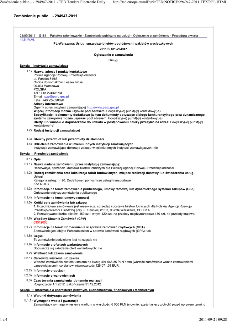 Zamówienie public... - 294947-2011 - TED Tenders Electronic Daily 1z4 http://ted.europa.eu/udl?uri=TED:NOTICE:294947-2011:TEXT:PL:HTML Zamówienie public... - 294947-2011 21/09/2011 I.II.III.IV.VI. S181 Państwa członkowskie - Zamówienie publiczne na usługi - Ogłoszenie o zamówieniu - Procedura otwarta PL-Warszawa: Usługi sprzedaŜy biletów podróŜnych i pakietów wycieczkowych 2011/S 181-294947 Ogłoszenie o zamówieniu Usługi Sekcja I: Instytucja zamawiająca I.1) Nazwa, adresy i punkty kontaktowe Polska Agencja Rozowju Przedsiębiorczości ul. Pańska 81/83 Osoba do kontaktów: Leszek Nosal 00-834 Warszawa POLSKA Tel.: +48 224328734 E-mail: [email protected] Faks: +48 224328620 Adresy internetowe Ogólny adres instytucji zamawiającej http://www.parp.gov.pl Więcej informacji moŜna uzyskać pod adresem: PowyŜszy(-e) punkt(-y) kontaktowy(-e) Specyfikacje i dokumenty dodatkowe (w tym dokumenty dotyczące dialogu konkurencyjnego oraz dynamicznego systemu zakupów) moŜna uzyskać pod adresem: PowyŜszy(-e) punkt(-y) kontaktowy(-e) Oferty lub wnioski o dopuszczenie do udziału w postępowaniu naleŜy przesyłać na adres: PowyŜszy(-e) punkt(-y) kontaktowy(-e) I.2) Rodzaj instytucji zamawiającej I.3) Główny przedmiot lub przedmioty działalności I.4) Udzielenie zamówienia w imieniu innych instytucji zamawiających Instytucja zamawiająca dokonuje zakupu w imieniu innych instytucji zamawiających: nie Sekcja II: Przedmiot zamówienia II.1) Opis II.1.1) Nazwa nadana zamówieniu przez instytucję zamawiającą: Rezerwacja, sprzedaŜ i dostawa biletów lotniczych dla Polskiej Agencji Rozwoju Przedsiębiorczości. II.1.2) Rodzaj zamówienia oraz lokalizacja robót budowlanych, miejsce realizacji dostawy lub świadczenia usług Usługi Kategoria usług: nr 20: Dodatkowe i pomocnicze usługi transportowe Kod NUTS II.1.3) Informacje na temat zamówienia publicznego, umowy ramowej lub dynamicznego systemu zakupów (DSZ) Ogłoszenie dotyczy zamówienia publicznego II.1.4) Informacje na temat umowy ramowej II.1.5) Krótki opis zamówienia lub zakupu 1. Przedmiotem zamówienia jest rezerwacja, sprzedaŜ i dostawa biletów lotniczych dla Polskiej Agencji Rozwoju Przedsiębiorczości z siedzibą przy ul. Pańskiej 81/83, 00-834 Warszawa, POLSKA. 2. Przewidywana liczba biletów: 150 szt.: w tym 120 szt. na przeloty międzynarodowe i 30 szt. na przeloty krajowe. II.1.6) Wspólny Słownik Zamówień (CPV) 63512000 II.1.7) Informacje na temat Porozumienia w sprawie zamówień rządowych (GPA) Zamówienie jest objęte Porozumieniem w sprawie zamówień rządowych (GPA): tak II.1.8) Części To zamówienie podzielone jest na części: nie II.1.9) Informacje o ofertach wariantowych Dopuszcza się składanie ofert wariantowych: nie II.2) Wielkość lub zakres zamówienia II.2.1) Całkowita wielkość lub zakres Wartość zamówienia została ustalona na kwotę 491 666,85 PLN netto (wartość zamówienia wraz z zamówieniami uzupełniającymi), co stanowi równowartość 128 071,59 EUR. II.2.2) Informacje o opcjach II.2.3) Informacje o wznowieniach II.3) Czas trwania zamówienia lub termin realizacji Rozpoczęcie 1.1.2012. Zakończenie 31.12.2012 Sekcja III: Informacje o charakterze prawnym, ekonomicznym, finansowym i technicznym III.1) Warunki dotyczące zamówienia III.1.1) Wymagane wadia i gwarancje Zamawiający wymaga wniesienia wadium w wysokości 6 000 PLN (słownie: sześć tysięcy złotych) przed upływem terminu 2011-09-21 09:28 Zamówienie public... - 294947-2011 - TED Tenders Electronic Daily 2z4 http://ted.europa.eu/udl?uri=TED:NOTICE:294947-2011:TEXT:PL:HTML składania ofert. Zamawiający nie wymaga wniesienia zabezpieczenia naleŜytego wykonania umowy. III.1.2) Główne warunki finansowe i uzgodnienia płatnicze i/lub odniesienie do odpowiednich przepisów je regulujących III.1.3) Forma prawna, jaką musi przyjąć grupa wykonawców, której zostanie udzielone zamówienie Wykonawcy wspólnie ubiegający się o udzielenie zamówienia zobowiązani są ustanowić pełnomocnika do reprezentowania ich w postępowaniu albo do reprezentowania ich w postępowaniu i zawarcia umowy w sprawie zamówienia publicznego. III.1.4) Inne szczególne warunki Wykonanie zamówienia podlega szczególnym warunkom: nie III.2) Warunki udziału III.2.1) Sytuacja podmiotowa wykonawców, w tym wymogi związane z wpisem do rejestru zawodowego lub handlowego Informacje i formalności konieczne do dokonania oceny spełniania wymogów: 1. O udzielenie zamówienia mogą ubiegać się Wykonawcy, którzy posiadają uprawnienia do wykonywania określonej działalności lub czynności, jeŜeli przepisy prawa nakładają obowiązek ich posiadania. 2. W przypadku Wykonawców wspólnie ubiegających się o udzielenie zamówienia warunek określony ust.1 musi zostać spełniony łącznie przez wszystkich Wykonawców. Ocena spełnienia warunków udziału w postępowaniu nastąpi w formulespełnia, -nie spełnia. 3. W celu potwierdzenia spełniania warunków, o których mowa w ust. 1, oraz w celu wykazania braku podstaw do wykluczenia z postępowania, Wykonawca ma obowiązek złoŜyć następujące dokumenty: 1) wypełnione i podpisane oświadczenie o braku podstaw do wykluczenia z postępowania. JeŜeli Wykonawcy wspólnie ubiegają się o udzielenie zamówienia dokument ten składa kaŜdy z nich; 2) aktualny odpis z właściwego rejestru, jeŜeli odrębne przepisy wymagają wpisu do rejestru, w celu wykazania braku podstaw do wykluczenia w oparciu o art. 24 ust. 1 pkt 2 ustawy, wystawiony nie wcześniej niŜ 6 miesięcy przed upływem terminu składania ofert, a w stosunku do osób fizycznych oświadczenie w zakresie art. 24 ust. 1 pkt 2 ustawy. JeŜeli Wykonawcy wspólnie ubiegają się o udzielenie zamówienia dokument ten składa kaŜdy z nich; 3) wypełnione i podpisane oświadczenie o spełnianiu warunków udziału w postępowaniu. JeŜeli Wykonawcy wspólnie ubiegają się o udzielenie zamówienia dokument ten mo