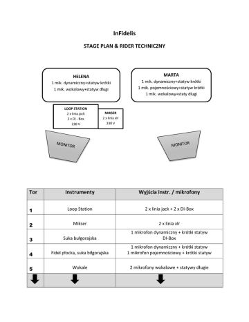 InFidelis STAGE PLAN & RIDER TECHNICZNY HELENA MARTA 1 mik. dynamiczny+statyw krótki 1 mik. wokalowy+statyw długi 1 mik. dynamiczny+statyw krótki 1 mik. pojemnościowy+statyw krótki 1 mik. wokalowy+staty dlugi LOOP STATION 2 x linia jack 2 x DI - Box 230 V Tor MIKSER 2 x linia xlr 230 V Instrumenty Wyjścia instr. / mikrofony 1 Loop Station 2 x linia jack + 2 x DI-Box 2 Mikser 2 x linia xlr Suka bułgorajska 1 mikrofon dynamiczny + krótki statyw DI-Box 4 Fidel płocka, suka biłgorajska 1 mikrofon dynamiczny + krótki statyw 1 mikrofon pojemnościowy + krótki statyw 5 Wokale 2 mikrofony wokalowe + statywy długie 3 5 Monitory 6 Inne Kontakt: Helena Matuszewska tel. +48 698 626 113 2 oddzielne tory odsłuchowe - prąd na scenie 230 V - 2 niskie krzesła bez poręczy - 1 taboret/stołeczek/itp. o wysokości 30 cm - 2 x woda
