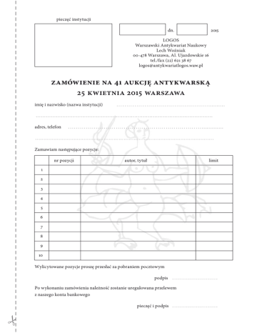 pieczęć instytucji dn. 2015 LOGOS Warszawski Antykwariat Naukowy Lech Woźniak 00-478 Warszawa, Al. Ujazdowskie 16 tel./fax (22) 621 38 67 [email protected] zamówienie na 41 aukcję antykwarską 25 kwietnia 2015 warszawa imię i nazwisko (nazwa instytucji) . . . . . . . . . . . . . . . . . . . . . . . . . . . . . . . . . . . . . . . . . . . . . . .......... .......................................................................................................... adres, telefon . . . . . . . . . . . . . . . . . . . . . . . . . . . . . . . . . . . . . . . . . . . . . . . . . . . . . . . . . . . . . . . . . . . ............. ........................................................................................................... Zamawiam następujące pozycje: nr pozycji autor, tytuł limit 1 2 3 4 5 6 7 8 9 10 Wylicytowane pozycje proszę przesłać za pobraniem pocztowym podpis ....................... Po wykonaniu zamówienia należność zostanie uregulowana przelewem z naszego konta bankowego pieczęć i podpis ....................... WARUNKI KUPNA I SPRZEDAŻY 1. Przedmiotem aukcji są książki i obiekty bibliofilskie powierzone przez Klientów oraz stanowiące własność Antykwariatu „Logos”. 2. Antykwariat „Logos” podejmuje się sprzedaży, w imieniu Właścicieli, obiektów będących ich rzeczywistą własnością, nie objętych postępowaniem sądowym i skarbowym, wolnych od zajęcia i zastawu oraz jakichkolwiek praw osób trzecich. 3. Antykwariat „Logos” podaje w katalogu cenę wywołania, rozpoczynającą licytację. 4. Aukcja jest prowadzona zgodnie z polskimi przepisami prawnymi przez upoważnioną osobę – Aukcjonera. Postąpienie w licytacji określa Aukcjoner. 5. Aukcjoner ma prawo dowolnego rozdzielania lub łączenia obiektów oraz ich wycofania z licytacji bez podania przyczyn. 6. Opisy zawarte w katalogu aukcji mogą być uzupełnione lub zmienione przez Aukcjonera lub osobę przez niego wskazaną przed rozpoczęciem licytacji. 7. W licytacji biorą udział wyłącznie osoby, które posiadają numer licytacyjny. Odbiór numeru licytacyjnego jest równoznaczny z zaakceptowaniem regulaminu aukcji. Antykwariat „Logos” może nie przyznać prawa udziału w licytacji bez podania przyczyny, oraz osobom, które nie wywiązują się z przyjętych zobowiązań. 8. Osoby nie mogące osobiście wziąć udziału w aukcji, a pragnące dokonać zakupu, mogą to uczynić za pośrednictwem organizatora, telefonicznie lub korespondencyjnie z podaniem oferowanej ceny-limitu (nie dotyczy to licytacji telefonicznej), który pozostaje informacją ściśle poufną. Przedstawiciel organizatora licytuje w imieniu Klienta do ceny nie wyższej niż zgłoszona. Zgłoszenie udziału w aukcji za pośrednictwem organizatora zobowiązuje zamawiającego do kupna obiektu co najmniej po cenie wywołania. W przypadku zgłoszenia więcej niż jednej oferty kupna, organizator reprezentować będzie Klienta, który zaoferował najwyższy limit i może rozpocząć licytację od kwoty wyższej niż cena wywołania. 9. Zakończenie licytacji danego obiektu następuje w momencie uderzenia młotkiem przez Aukcjonera i jest równoznaczne z zawarciem umowy kupna-sprzedaży. 10. Nabywcą staje się osoba oferująca najwyższą cenę — wyjąwszy, gdy dzieje się to w sytuacji sporu. Aukcjoner ma prawo spór rozwiązać lub ponownie zaoferować obiekt. 11. Nabywca jest zobowiązany do zapłaty całej kwoty wylicytowanej bezpośrednio po zakończeniu aukcji lub w ciągu 7 dni roboczych następujących po aukcji. Do ceny wylicytowanej zostanie doliczona opłata w wysokości 7%. W przypadku wystawienia faktury dane osobiste Nabywcy pozostają do wyłącznej wiadomości Antykwariatu „Logos”. 12. Całość należności za kupione obiekty winna być zapłacona gotówką lub przelewem, nie później niż w ciągu siedmiu dni od daty aukcji. Jeżeli wpłata nie nastąpi w wymaganym czasie, Antykwariat „Logos” ma prawo anulować kontrakt i obciążyć Nabywcę wszelkimi kosztami wynikłymi z tego tytułu. 13. Prawo własności zakupionego dzieła przechodzi na Nabywcę w momencie dokonania całej wpłaty. 14. Odbiór wylicytowanych przedmiotów winien nastąpić bezpośrednio po wpłaceniu należności. W innych przypadkach przechowywanie i dostarczanie przedmiotów odbywa się na koszt i ryzyko Nabywcy. 15. Organizator gwarantuje autentyczność oraz zgodność ze stanem faktycznym obiektów opisanych w katalogu. Zakwestionowanie opisu katalogowego musi być udokumentowane wiarygodnymi ekspertyzami. 16. Organizator nie ponosi odpowiedzialności za wady fizyczne i prawne kupionych przedmiotów. Wszelkie możliwe reklamacje będą rozpatrywane zgodnie z przepisami prawa polskiego. Antykwariat „Logos”. przypomina: – zgodnie z Ustawą o muzeach z 21 XI 1996, muzea rejestrowe mają prawo pierwokupu obiektów bezpośrednio na aukcji za kwotę wylicytowaną. Takie prawo mają także Biblioteka Narodowa i Biblioteka Jagiellońska, Muzeum Narodowe i Archiwum Główne Akt Dawnych.