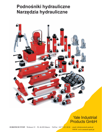 Podno niki hydrauliczne Narz dzia hydrauliczne Yale Industrial Products GmbH EUROTECH TNTiP . Wolnosci 33 . PL 46-030 Murow . Tel/Fax + 48 77 421 48 84 . email: [email protected] WWW: www.eurotech.opole.pl Cylindry uniwersalne Niskie i p askie cylindry jednostronnego dzia ania z powrotem spr ynowym, 5 do 100 ton, maksymalne ci nienie robocze: 700 bar jednostronnego dzia ania z powrotem spr ynowym, 10 do 100 ton, maksymalne ci nienie robocze: 700 bar Do wszystkich uniwersalnych zastosowa wymagaj cych wysokich si i ma ych rozmiarów urz dzenia jednocze nie. Solidna konstrukcja cylindra, wykonana z masywnej stali chromowo-molibdenowej z twardym chromowanym t okiem oraz d ugimi prowadnicami z br zu. sk . Zestaw zawiera siod o, gwinty mocuj ce oraz z czk Te kompaktowe cylindry hydrauliczne zosta y zaprojektowane do takich zastosowa jak podnoszenie i ustawianie jak równie do wszelkich podstawowych robót konserwacyjnych wymagaj cych du ej si y, niedu ych rozmiarów, ma ej masy i por czno ci urz dzenia. Zestaw zawiera z czk sk . YLS YFS Rozmiar cylindra Typ tony No no Skok Wysoko maks. Rozmiar cylindra Typ tony No no Skok Wysoko maks. kN mm mm kN mm mm 5 YS - 5/15 YS - 5/25 YS - 5/75 YS - 5/127 YS - 5/180 50 50 50 50 50 15 25 75 127 180 45 97 157 214 267 10 20 30 50 100 YLS - 10/35 YLS - 20/45 YLS - 30/60 YLS - 50/60 YLS - 100/55 100 200 300 500 1000 35 45 60 60 55 86 100 120 122 141 10 YS - 10/25 YS - 10/50 YS - 10/100 YS - 10/150 YS - 10/200 YS - 10/250 YS - 10/300 100 100 100 100 100 100 100 25 50 100 150 200 250 300 90 125 178 250 300 352 407 10 20 30 50 100 YFS - 10/11 YFS - 20/15 YFS - 30/15 YFS - 50/15 YFS - 100/15 100 200 300 500 1000 11 15 15 15 15 43 60 60 70 91 YS - 15/25 YS - 15/50 YS - 15/100 YS - 15/150 YS - 15/200 YS - 15/250 YS - 15/300 YS - 15/350 150 150 150 150 150 150 150 150 25 50 100 150 200 250 300 350 110 140 190 260 310 365 420 472 YS - 23/25 YS - 23/50 YS - 23/100 YS - 23/160 YS - 23/210 YS - 23/250 YS - 23/300 YS - 23/345 230 230 230 230 230 230 230 230 25 50 100 160 210 250 300 345 116 150 202 277 330 376 428 477 YS - 30/125 YS - 30/200 300 300 125 200 245 325 YS - 50/50 YS - 50/100 YS - 50/160 YS - 50/320 500 500 500 500 50 100 160 320 170 220 285 460 70 YS - 70/150 YS - 70/330 700 700 150 330 285 490 100 YS - 100/100 YS - 100/200 1000 1000 100 200 275 375 15 23 30 50 Cylindry ci gaj ce jednostronnego dzia ania z powrotem spr ynowym, 10 do 51 ton si y ci gn cej, maksymalne ci nienie robocze: 700 bar Te cylindry ci gaj ce charakteryzuj si du si ci gn regulowan z du precyzyjno ci przy pomocy pomp r cznych i zasilaczy elektrycznych. Cylindry zosta y wykonane ze stali chromowo-molibdenowej, zestaw zawiera kute ogniwa, r czk do noszenia oraz z czk sk . Rozmiar Typ cylindra tony 10 20 30 51 YPL - 10/150 YPL - 20/150 YPL - 30/150 YPL - 51/150 No no Skok max. Odleg mi dzy ogniwami kN mm mm 100 200 300 510 150 150 150 150 750 795 875 955 EUROTECH TNTiP . Wolnosci 33 . PL 46-030 Murow . Tel/Fax + 48 77 421 48 84 . email: [email protected] WWW: www.eurotech.opole.pl Puste cylindry Cylindry uniwersalne jednostronnego dzia ania z powrotem spr ynowym, 12 do 93 ton, maksymalne ci nienie robocze: 700 bar obustronnego dzia ania z powrotem hydraulicznym 5 do 200 ton, maksymalne ci nienie robocze: 700 bar Dzi ki konstrukcji otworu rodkowego mo liwe jest w enie gwintowanego pr ta wewn trz cylindra, co zapewnia niezwykle du e si y ci gu w zastosowaniach takich jak wywo ywanie napr wst pnych w rubach fundamentowych, usuwanie osi i tulei, rury wyci gowe, w ci garkach oraz innych podobnych zastosowaniach. sk z czk . Zestaw zawiera siod o, gwinty mocuj ce oraz Cylindry obustronnego dzia ania o du ej pr dko ci powrotnej. Szybki powrót t oka, znacznie wyd one prowadnice t oka oraz najwy szej jako ci materia y sprawiaj , e te cylindry s niezwykle wytrzyma e i sprostaj nawet najtrudniejszym zadaniom. Zestaw obejmuje siod o, gwinty mocuj ce oraz dwie czki skie. Rozmiar cylindra tony Typ ø otworu Si a ci gn ca Skok ø otworu kN mm mm YH - 5/30 YH - 5/80 YH - 5/150 50 50 50 30 80 150 160 210 280 10 YH - 10/30 YH - 10/80 YH - 10/150 YH - 10/250 100 100 100 100 30 80 150 250 175 225 295 395 20 YH - 20/50 YH - 20/150 YH - 20/250 200 200 200 50 150 250 195 310 410 30 YH - 30/200 YH - 30/350 300 300 200 350 355 510 50 YH - 50/150 YH - 50/350 YH - 50/500 500 500 500 150 350 500 325 525 685 70 YH - 70/150 YH - 70/350 700 700 150 350 335 540 100 YH - 100/50 YH - 100/150 YH - 100/350 YH - 100/500 1000 1000 1000 1000 50 150 350 500 265 365 565 725 200 YH - 200/150 YH - 200/350 YH - 200/500 2000 2000 2000 150 350 500 410 620 780 Si a ci gn ca Skok kN mm mm Rozmiar cylindra tony 5 rodk. 12 YCS - 12/40 YCS - 12/75 120 120 40 75 20 20 21 YCS - 21/50 YCS - 21/150 214 214 50 150 27 27 33 YCS - 33/60 YCS - 33/150 335 335 60 150 33 33 57 YCS - 57/70 567 70 42 62 YCS - 62/150 618 150 55 93 YCS - 93/75 930 75 80 Puste cylindry obustronnego dzia ania z powrotem hydraulicznym 33 do 140 ton, maksymalne ci nienie robocze: 700 bar Identyczne zastosowanie jak w przypadku modeli YCS, jednak w tej linii produktów oferuje hydrauliczny powrót t oka dzi ki drugiemu czu olejowemu, przydatny w cyklicznych zastosowa- niach ci gn cych. Typ rodk. Rozwieracze hydrauliczne jednostronnego dzia ania z powrotem spr ynowym Rozmiar Typ cylindra tony Si a ci gn ca Skok ø otworu rodkowego kN mm mm Rozwieracze hydrauliczne to uniwersalne narz dzia mechaniczne wykorzystywane do wszelkiego rodzaju napraw, np. ustawianie kontenerów oraz pokryw, podnoszenie, pozycjonowanie lub ustawianie elementów konstrukcyjnych, zdejmowanie szalunków i form. 33 33 YCH - 33/150 YCH - 33/250 335/180 335/180 150 250 33 33 Maks. ci nienie robocze: 700 bar, zestaw zawiera z czk 62 YCH - 62/250 618/300 250 55 Typ 93 YCH - 93/250 930/450 250 55 100 YCH - 100/40 1000/500 40 55 140 YCH - 140/200 1400/700 200 80 YHS - 05 YHS - 11 YHS - 15 sk . Maksymalna no no Szerok rozwarcia mm Obj to oleju Masa kN ton min. maks. cm 3 kg 5 10 15 0,5 1,0 1,5 16 14 35 100 100 22