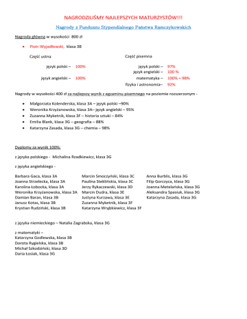 NAGRODZILIŚMY NAJLEPSZYCH MATURZYSTÓW!!! Nagrody z Funduszu Stypendialnego Państwa Ramczykowskich Nagroda główna w wysokości 800 zł • Piotr Wyjadłowski, klasa 3B Część pisemna Część ustna język polski – 100% język polski – 97% język angielski – 100 % język angielski – 100% matematyka – 100% + 98% fizyka i astronomia– 92% Nagrody w wysokości 400 zł za najlepszy wynik z egzaminu pisemnego na poziomie rozszerzonym • • • • • Małgorzata Kolenderska, klasa 3A – język polski –90% Weronika Krzyżanowska, klasa 3A– język angielski – 95% Zuzanna Myketnik, klasa 3F – historia sztuki – 84% Emilia Blank, klasa 3G – geografia – 88% Katarzyna Zasada, klasa 3G – chemia – 98% Dyplomy za wynik 100%: z języka polskiego - Michalina Rzadkiewicz, klasa 3G z języka angielskiego Barbara Gaca, klasa 3A Joanna Strzelecka, klasa 3A Karolina Łobocka, klasa 3A Weronika Krzyżanowska, klasa 3A Damian Baran, klasa 3B Janusz Kotas, klasa 3B Krystian Rudziński, klasa 3B Marcin Smoczyński, klasa 3C Paulina Steklińskia, klasa 3C Jerzy Rykaczewski, klasa 3D Marcin Dudra, klasa 3E Justyna Kurzawa, klasa 3E Zuzanna Myketnik, klasa 3F Katarzyna Wrąbkiewicz, klasa 3F z języka niemieckiego – Natalia Zagrabska, klasa 3G z matematyki – Katarzyna Godlewska, klasa 3B Dorota Rygielska, klasa 3B Michał Szkodziński, klasa 3D Daria Łosiak, klasa 3G Anna Burblis, klasa 3G Filip Gorczyca, klasa 3G Joanna Metelańska, klasa 3G Aleksandra Spasiuk, klasa 3G Katarzyna Zasada, klasa 3G