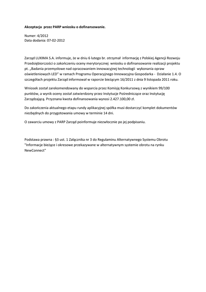 Akceptacja przez PARP wniosku o dofinansowanie. Numer: 4/2012 Data dodania: 07-02-2012 Zarząd LUXIMA S.A. informuje, że w dniu 6 lutego br. otrzymał informację z Polskiej Agencji Rozwoju Przedsiębiorczości o zakończeniu oceny merytorycznej wniosku o dofinansowanie realizacji projektu pt. „Badania przemysłowe nad opracowaniem innowacyjnej technologii wykonania opraw oświetleniowych LED” w ramach Programu Operacyjnego Innowacyjna Gospodarka - Działanie 1.4. O szczegółach projektu Zarząd informował w raporcie bieżącym 16/2011 z dnia 9 listopada 2011 roku. Wniosek został zarekomendowany do wsparcia przez Komisję Konkursową z wynikiem 99/100 punktów, a wynik oceny został zatwierdzony przez Instytucje Pośredniczące oraz Instytucję Zarządzającą. Przyznana kwota dofinansowania wynosi 2.427.100,00 zł. Do zakończenia aktualnego etapu rundy aplikacyjnej spółka musi dostarczyć komplet dokumentów niezbędnych do przygotowania umowy w terminie 14 dni. O zawarciu umowy z PARP Zarząd poinformuje niezwłocznie po jej podpisaniu. Podstawa prawna : §3 ust. 1 Załącznika nr 3 do Regulaminu Alternatywnego Systemu Obrotu "Informacje bieżące i okresowe przekazywane w alternatywnym systemie obrotu na rynku NewConnect"