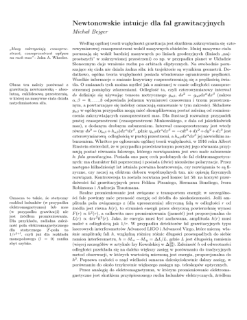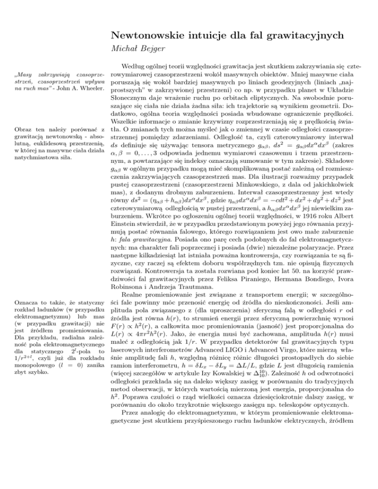 Newtonowskie intuicje dla fal grawitacyjnych Michał Bejger „Masy zakrzywiają czasoprzestrzeń, czasoprzestrzeń wpływa na ruch mas” - John A. Wheeler. Obraz ten należy porównać z grawitacją newtonowską - absolutną, euklidesową przestrzenią, w której na masywne ciała działa natychmiastowa siła. Oznacza to także, że statyczny rozkład ładunków (w przypadku elektromagnetyzmu) lub mas (w przypadku grawitacji) nie jest źródłem promieniowania. Dla przykładu, radialna zależność pola elektromagnetycznego dla statycznego 2l -pola to 1/r2+l , czyli już dla rozkładu monopolowego (l = 0) zanika zbyt szybko. Według ogólnej teorii względności grawitacja jest skutkiem zakrzywiania się czterowymiarowej czasoprzestrzeni wokół masywnych obiektów. Mniej masywne ciała poruszają się wokół bardziej masywnych po liniach geodezyjnych (liniach „najprostszych” w zakrzywionej przestrzeni) co np. w przypadku planet w Układzie Słonecznym daje wrażenie ruchu po orbitach eliptycznych. Na swobodnie poruszające się ciała nie działa żadna siła: ich trajektorie są wynikiem geometrii. Dodatkowo, ogólna teoria względności posiada wbudowane ograniczenie prędkości. Wszelkie informacje o zmianie krzywizny rozprzestrzeniają się z prędkością światła. O zmianach tych można myśleć jak o zmiennej w czasie odległości czasoprzestrzennej pomiędzy zdarzeniami. Odległość ta, czyli czterowymiarowy interwał ds definiuje się używając tensora metrycznego gαβ , ds2 = gαβ dxα dxβ (zakres α, β = 0, . . . , 3 odpowiada jednemu wymiarowi czasowemu i trzem przestrzennym, a powtarzające się indeksy oznaczają sumowanie w tym zakresie). Składowe gαβ w ogólnym przypadku mogą mieć skomplikowaną postać zależną od rozmieszczenia zakrzywiających czasoprzestrzeń mas. Dla ilustracji rozważmy przypadek pustej czasoprzestrzeni (czasoprzestrzeni Minkowskiego, z dala od jakichkolwiek mas), z dodanym drobnym zaburzeniem. Interwał czasoprzestrzenny jest wtedy równy ds2 = (ηαβ + hαβ )dxα dxβ , gdzie ηαβ dxα dxβ = −cdt2 + dx2 + dy 2 + dz 2 jest czterowymiarową odległością w pustej przestrzeni, a hαβ dxα dxβ jej niewielkim zaburzeniem. Wkrótce po ogłoszeniu ogólnej teorii względności, w 1916 roku Albert Einstein stwierdził, że w przypadku przedstawionym powyżej jego równania przyjmują postać równania falowego, którego rozwiązaniem jest owo małe zaburzenie h: fala grawitacyjna. Posiada ono parę cech podobnych do fal elektromagnetycznych: ma charakter fali poprzecznej i posiada (dwie) niezależne polaryzacje. Przez następne kilkadziesiąt lat istniała poważna kontrowersja, czy rozwiązania te są fizyczne, czy raczej są efektem doboru współrzędnych tzn. nie opisują fizycznych rozwiązań. Kontrowersja ta została rozwiana pod koniec lat 50. na korzyść prawdziwości fal grawitacyjnych przez Feliksa Piraniego, Hermana Bondiego, Ivora Robinsona i Andrzeja Trautmana. Realne promieniowanie jest związane z transportem energii; w szczególności fale powinny móc przenosić energię od źródła do nieskończoności. Jeśli amplituda pola związanego z (dla uproszczenia) sferyczną falą w odległości r od źródła jest równa h(r), to strumień energii przez sferyczną powierzchnię wynosi F (r) ∝ h2 (r), a całkowita moc promieniowania (jasność) jest proporcjonalna do L(r) ∝ 4πr2 h2 (r). Jako, że energia musi być zachowana, amplituda h(r) musi maleć z odległością jak 1/r. W przypadku detektorów fal grawitacyjnych typu laserowych interferometrów Advanced LIGO i Advanced Virgo, które mierzą właśnie amplitudę fali h, względną różnicę różnic długości prostopadłych do siebie ramion interferometru, h = δLx − δLy = ∆L/L, gdzie L jest długością ramienia (więcej szczegółów w artykule Izy Kowalskiej w ∆10 10 ). Zależność h od odwrotności odległości przekłada się na daleko większy zasięg w porównaniu do tradycyjnych metod obserwacji, w których wartością mierzoną jest energia, proporcjonalna do h2 . Poprawa czułości o rząd wielkości oznacza dziesięciokrotnie dalszy zasięg, w porównaniu do około trzykrotnie większego zasięgu np. teleskopów optycznych. Przez analogię do elektromagnetyzmu, w którym promieniowanie elektromagnetyczne jest skutkiem przyśpieszonego ruchu ładunków elektrycznych, źródłem promieniowania grawitacyjnego powinien być przyśpieszony ruch mas. Do promieniowania nie wystarczy jednak samo istnienie ładunku (masy). Dla układu mas opisanego rozkładem gęstości ρ(r), gdzie r jest radialną odległością od początku układu odniesienia (np. środka masy), najprostszym momentem rozkładu jest monopol M , który jest po prostu całkowitą masą-energią układu. Jego zmiana oznaczałaby nieprzestrzeganie zasady zachowania masy-energii. Również zmienny moment dipolowy mas Pi nie może być źródłem promieniowania grawitacyjnego, ponieważ z definicji odpowiada środkowi masy układu; zmienność oznaczałaby złamanie zasady zachowania pędu. Najniższym R „promieniującym” multipolem w teorii grawitacji jest zatem kwadrupol, Iij = ρ(r)xi xj d3 x, z którym nie wiążą się żadne zasady zachowania. Powyższe rozważania oznaczają, że sferycznie symetryczny ruch mas np. kolaps albo eksplozja nie wywołuje emisji fal grawitacyjnych. To samo dotyczy osiowo symetrycznej rotującej gwiazdy. Dobrymi źródłami fal są natomiast niesferyczne wybuchy supernowych, rotujące zdeformowane gwiazdy neutronowe, oraz układy podwójne gwiazd lub czarnych dziur. Wielkość amplitudy fali grawitacyjnej h można oszacować przy pomocy analizy wymiarowej. Z definicji h jest wielkością bezwymiarową i, jak wynika z powyższych rozważań, odwrotnie proporcjonalną do odległości od źródła. Powinna też być związana z momentem kwadrupolowym, którego jednostki to [kg m2 ]. Wiemy także, że w wyrażeniu powinna pojawić się drug