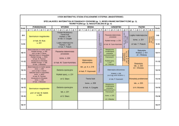 II ROK MATEMATYKI, STUDIA STACJONARNE II STOPNIA (MAGISTERSKIE) SPECJALNOŚCI: MATEMATYKA W FINANSACH I EKONOMII (gr. 1), MODELOWANIE MATEMATYCZNE (gr. 2), TEORETYCZNA (gr. 3), NAUCZYCIELSKA B (gr. 4) 10-11 11-12 12-13 13-14 14-15 15-16 gr. 3 gr. 4 Seminarium magisterskie dr hab. M. Kula s. 231 Borel measures on metric spaces Wykład monogr., s. 208 prof. dr hab. K. Baron Selectied topics in inequalities Wykład monogr., s. 505C dr hab. W. Fechner Introduction to Wavelets Wykład monogr., s. 226 dr hab. J. Morawiec Borel measures on metric spaces konw., s. 208 prof. dr hab. K. Baron Selected topics in inequalities konw., s. 505C dr hab. W. Fechner Introduction to Wavelets konw., s. 226 dr hab. J. Morawiec Seminarium magisterskie prof. dr hab. M. Sablik s. 208 gr. 1 gr. 2 gr. 3 gr. 4 gr. 1 gr. 2 gr. 3 Wykład fakultatywny Teoria liczb Wykład, s. 208 dr hab. A. Czogała Logika matematyczna Wykład, s. 226 dr hab. T. Połacik Piecewise deterministic processes konw., s. 224 dr hab. M. Tyran-Kamińska Matematyka obliczeniowa lab., gr. A, s. 216 Badania operacyjne dr hab. P. Koprowski Teoria liczb konw., s. 208 Badania operacyjne lab, s. 231 dr S. Sitarz gr. 1 gr. 2 gr. 3 gr. 4 Piecewise deterministic processes Wykład monogr., s. 233 dr hab. M. Tyran-Kamińska Statystyczne modelowanie procesów ekonomicznych i finansowych Wykład specj. s. 431 dr I. Wistuba gr. 1 gr. 2 gr. 3 Logika matematyczna konw., s. 201 dr hab. T. Połacik Statystyka Wykład, s. 431 dr I. Wistuba gr. 4 Godz. 8-9 9-10 10-11 11-12 Statystyka lab., s. 230 dr I. Wistuba Matematyka obliczeniowa 12-13 Wykład, s. 224 (co 2 tyg. od 9.10.2014 r.) Wykład specj., s. 231 dr S. Sitarz gr. 4 Statystyka lab, s. 230 dr I. Wistuba gr. 2 PIĄTEK CZWARTEK Dyd. mat. na III i IV et. eduk. II Wykład, s. 208 dr N. Cieślar 9-10 gr. 1 ŚRODA WTOREK Matematyka obliczeniowa Lab., gr. B, s. 215 dr hab. P. Koprowski 8-9 PONIEDZIAŁEK Praktyka dydaktyczna matematyki na III i IV etapie edukacyjnym I SZKOŁA lub s. 535, mgr S. Kania Godz. dr hab. A. Czogała dr hab. P. Koprowski Statystyczne modelowanie procesów ekonomicznych i finansowych konw., s. 230 Warsztaty problemowe 13-14 lab., s. 225 dr A. Brzeska 14-15 15-16 dr I. Wistuba 16-17 16-17